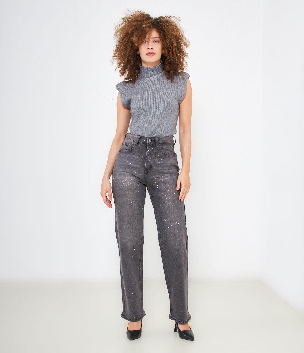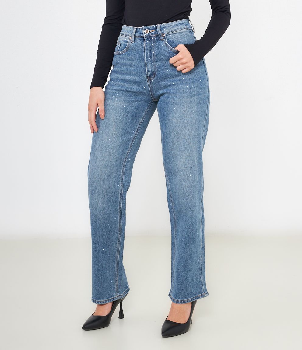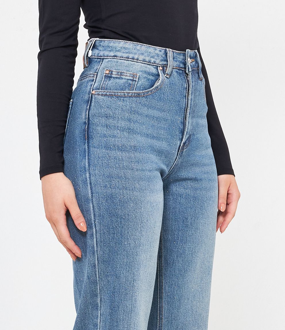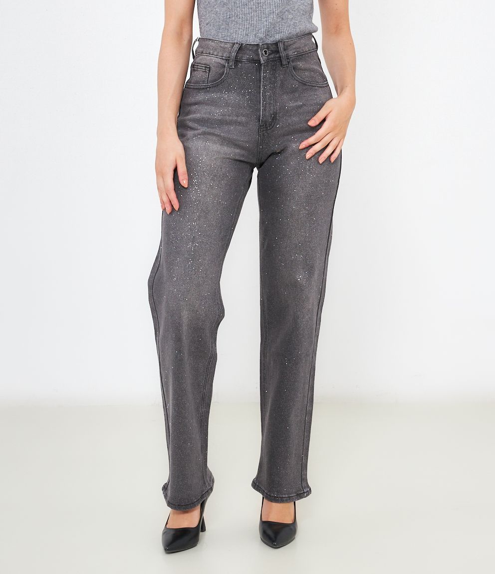 Jeans modello palazzo con glitter, cinque tasche e chiusura con zip e bottone.
