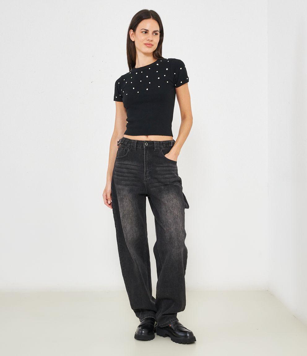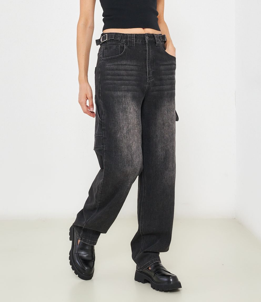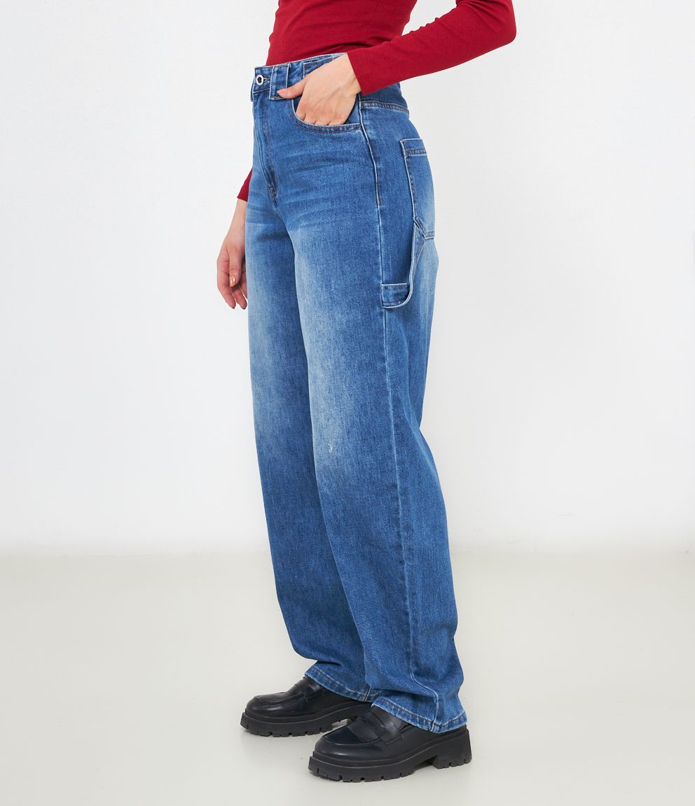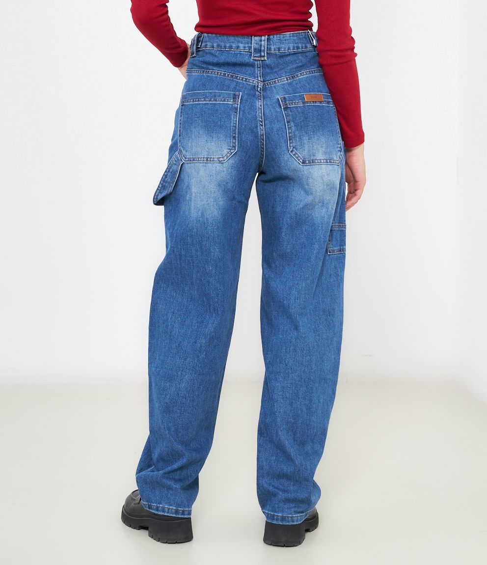 Jeans modello cargo, cinque tasche e chiusura con zip e bottone.