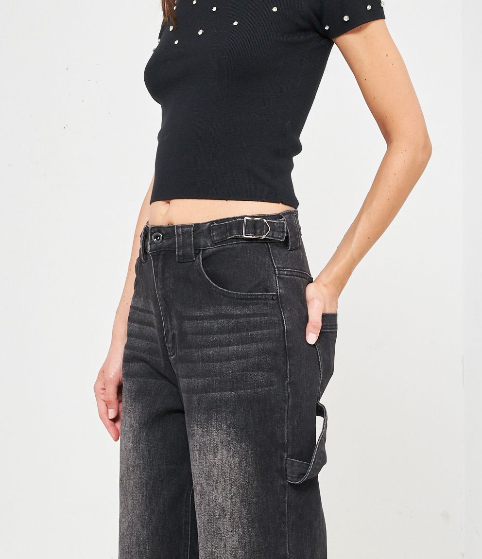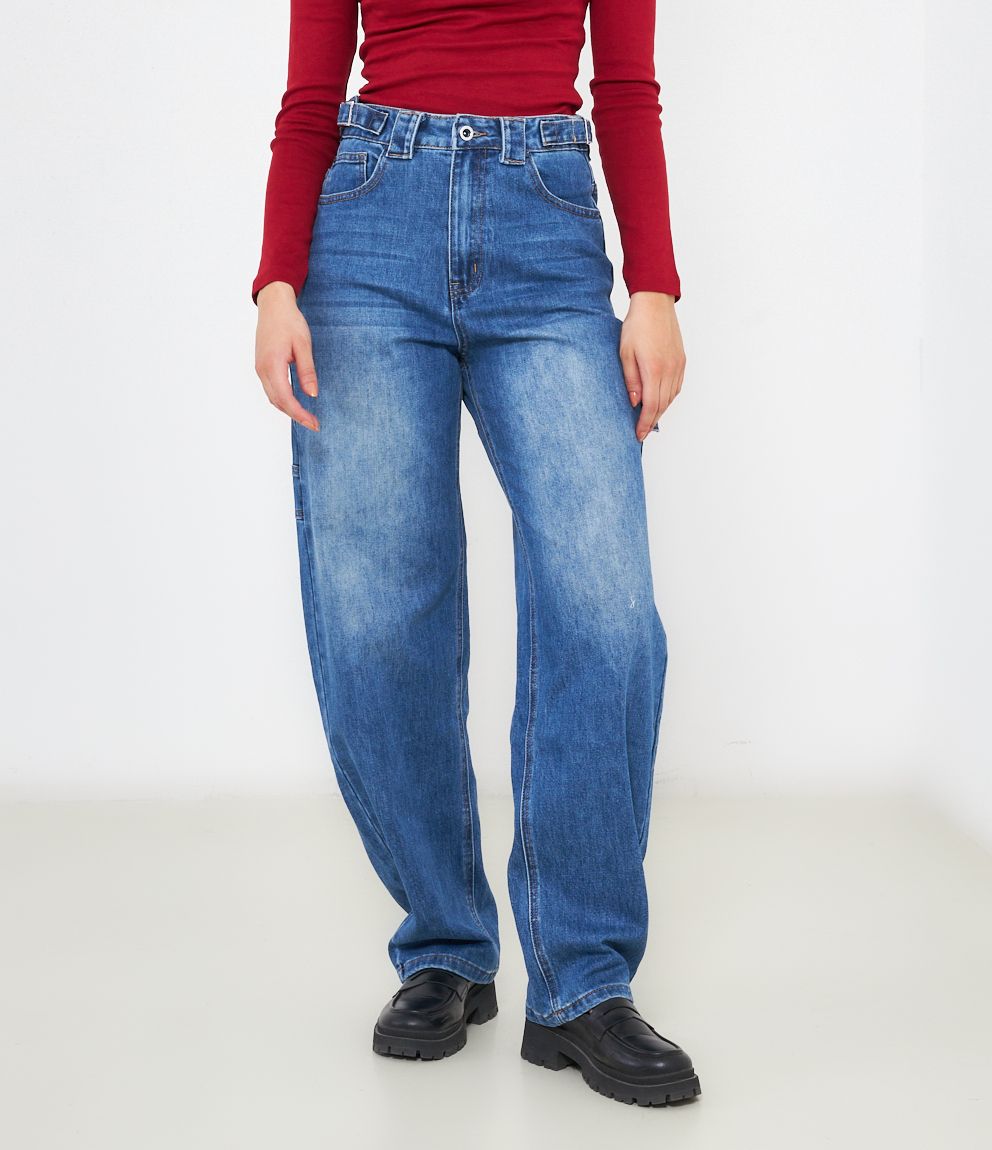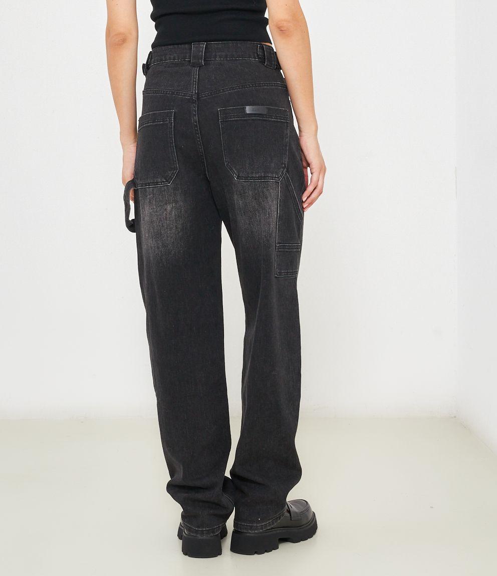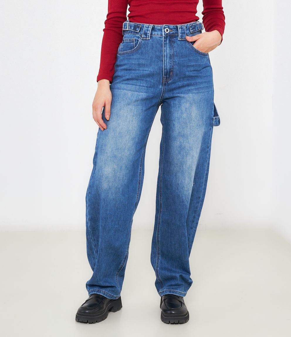 Jeans modello cargo, cinque tasche e chiusura con zip e bottone.