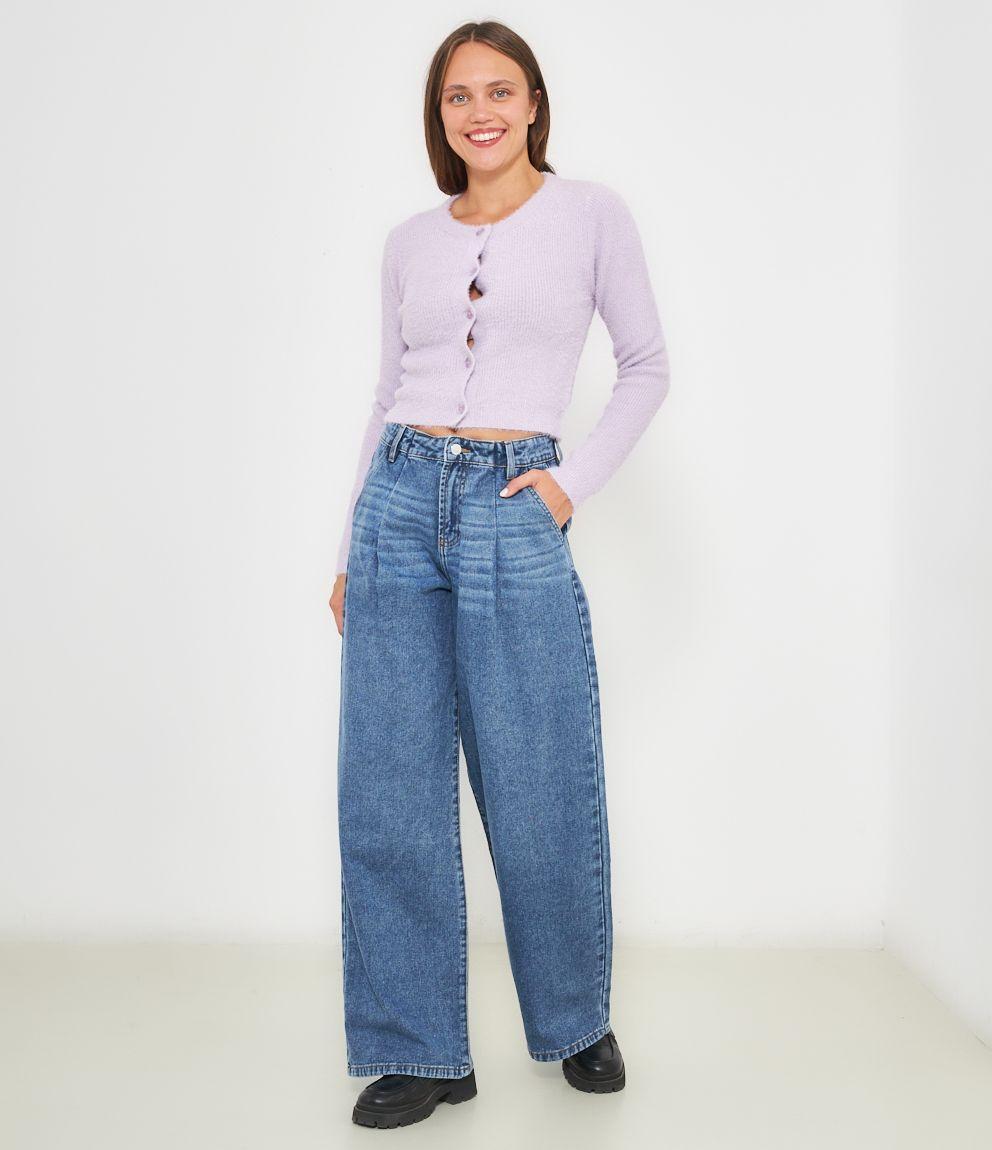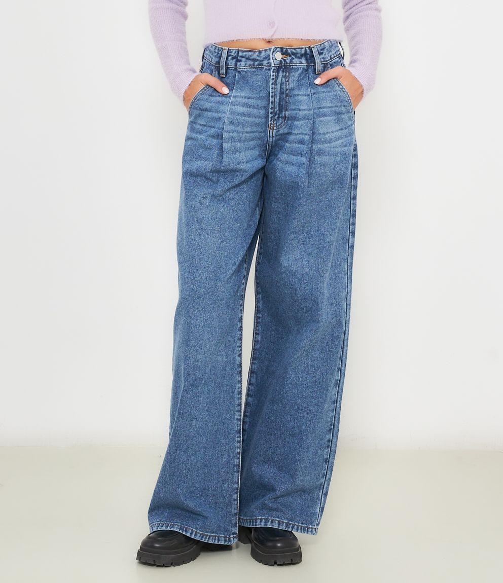 Jeans modello palazzo con pinces frontali, tasche all' americana e chiusura con zip e bottone.