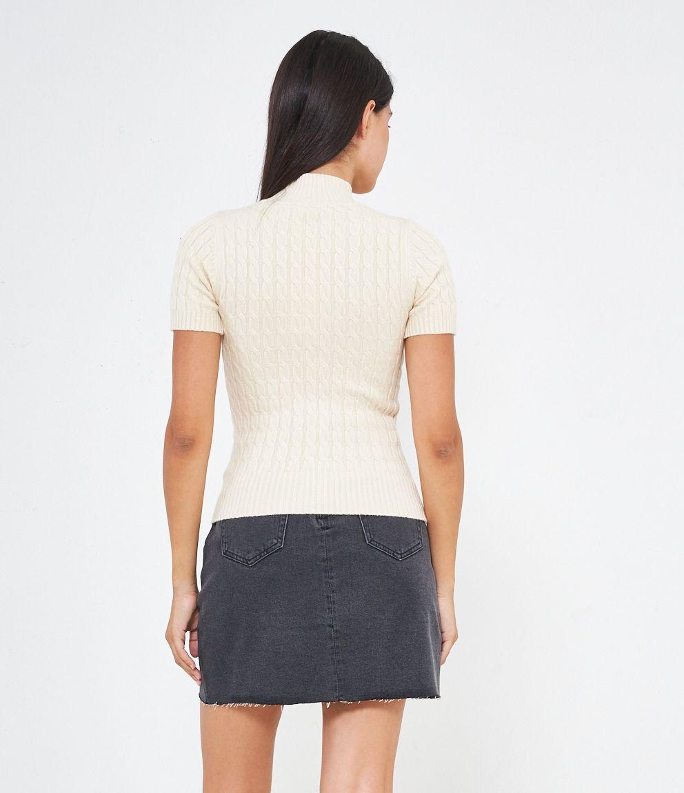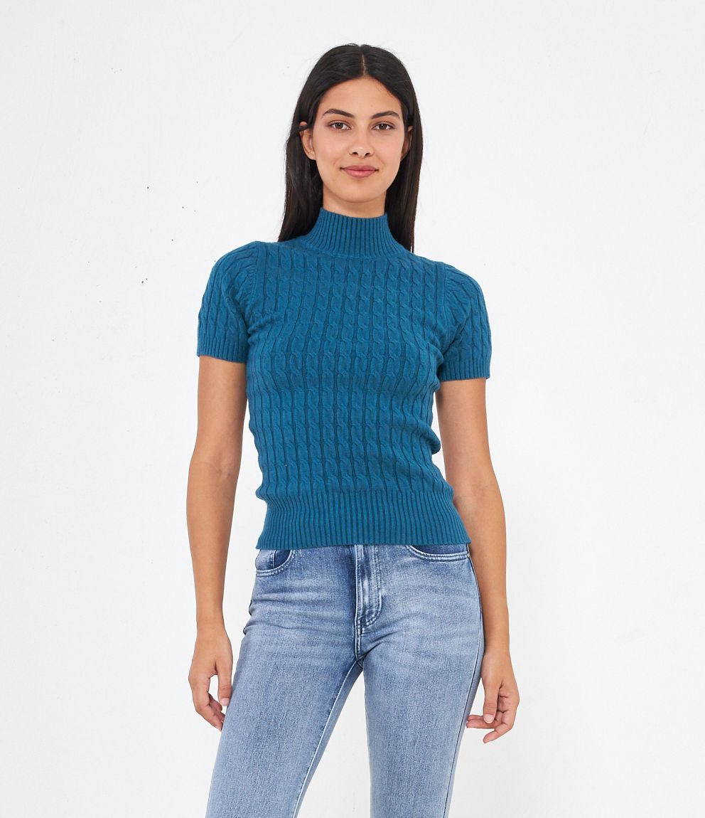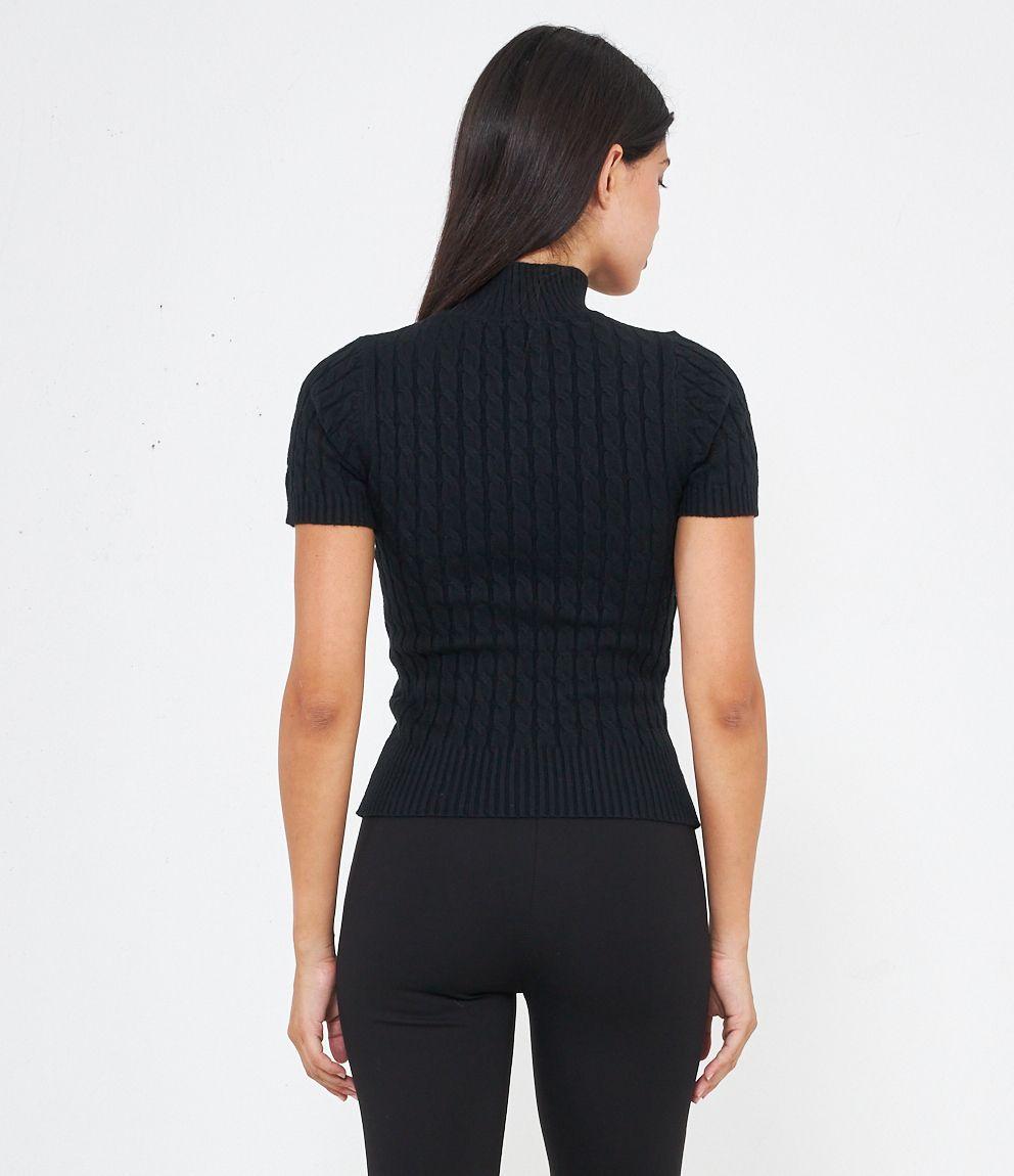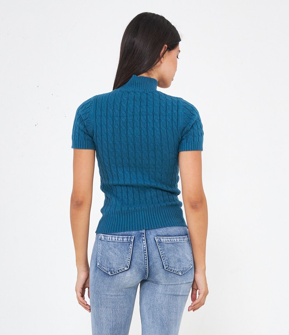 Maglia a trecce, modello a mezze maniche e mezzo collo con bordi elastici a costine.