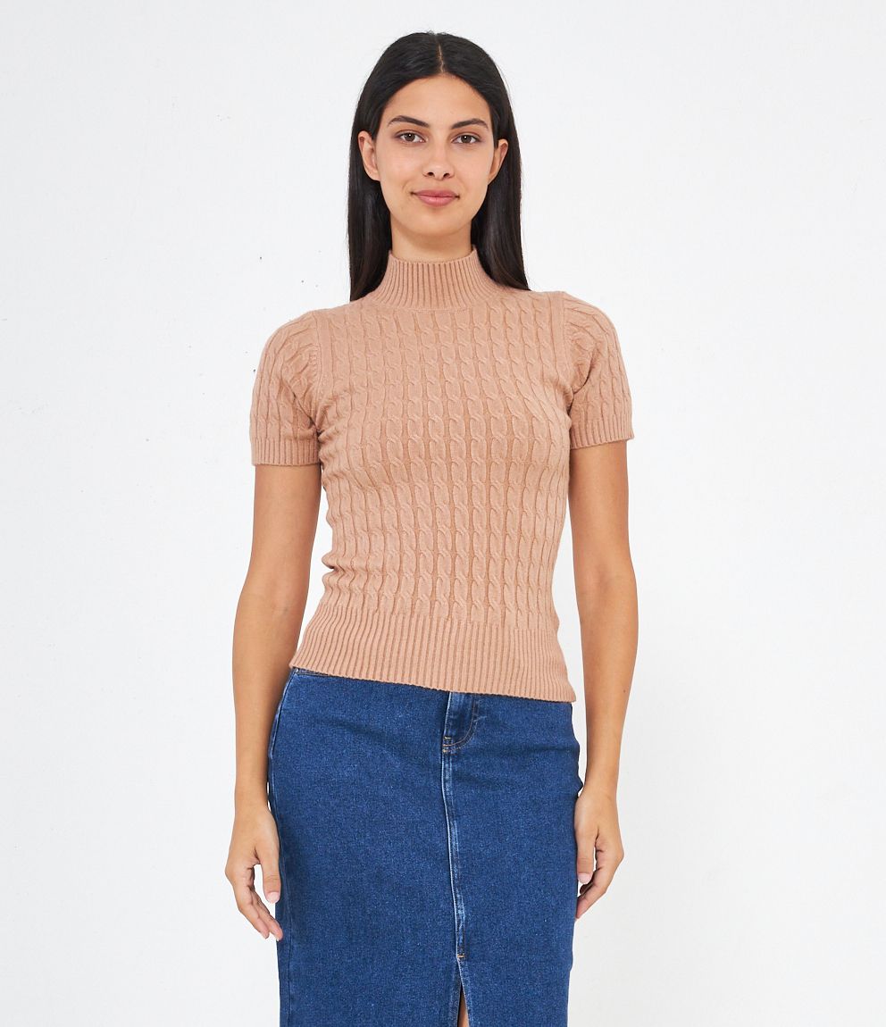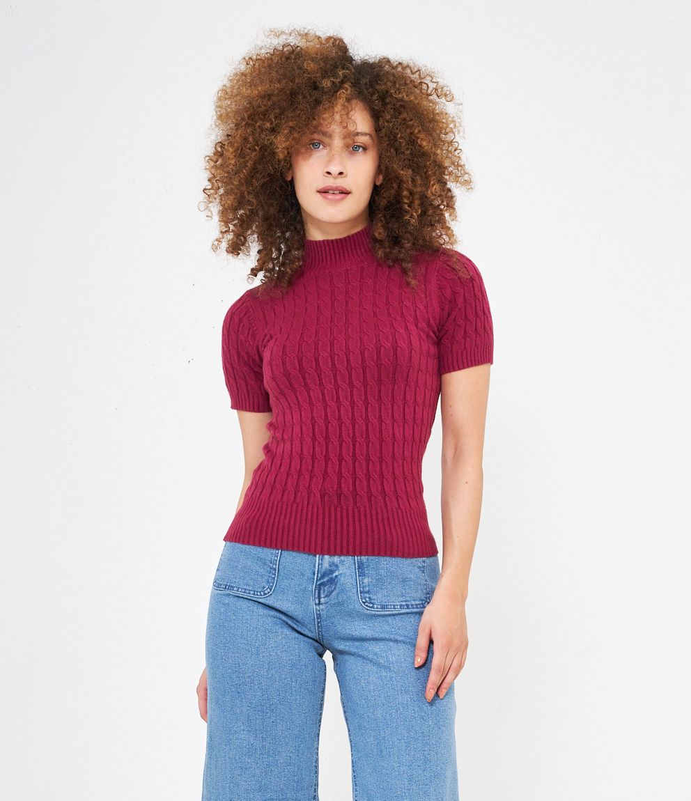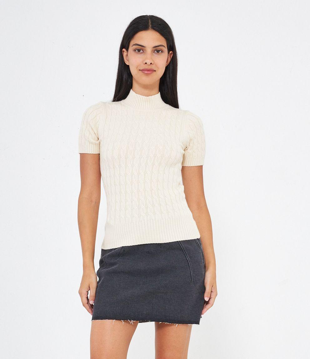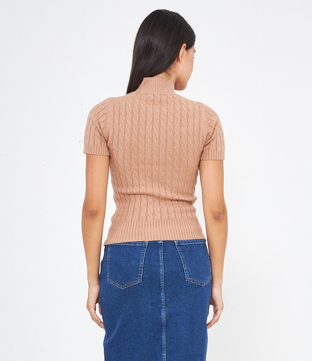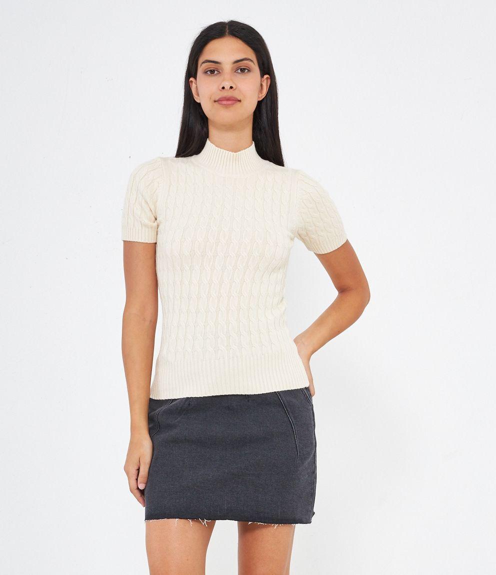 Maglia a trecce, modello a mezze maniche e mezzo collo con bordi elastici a costine.