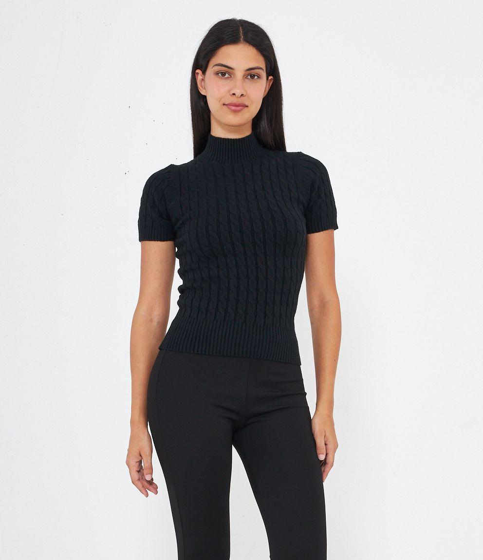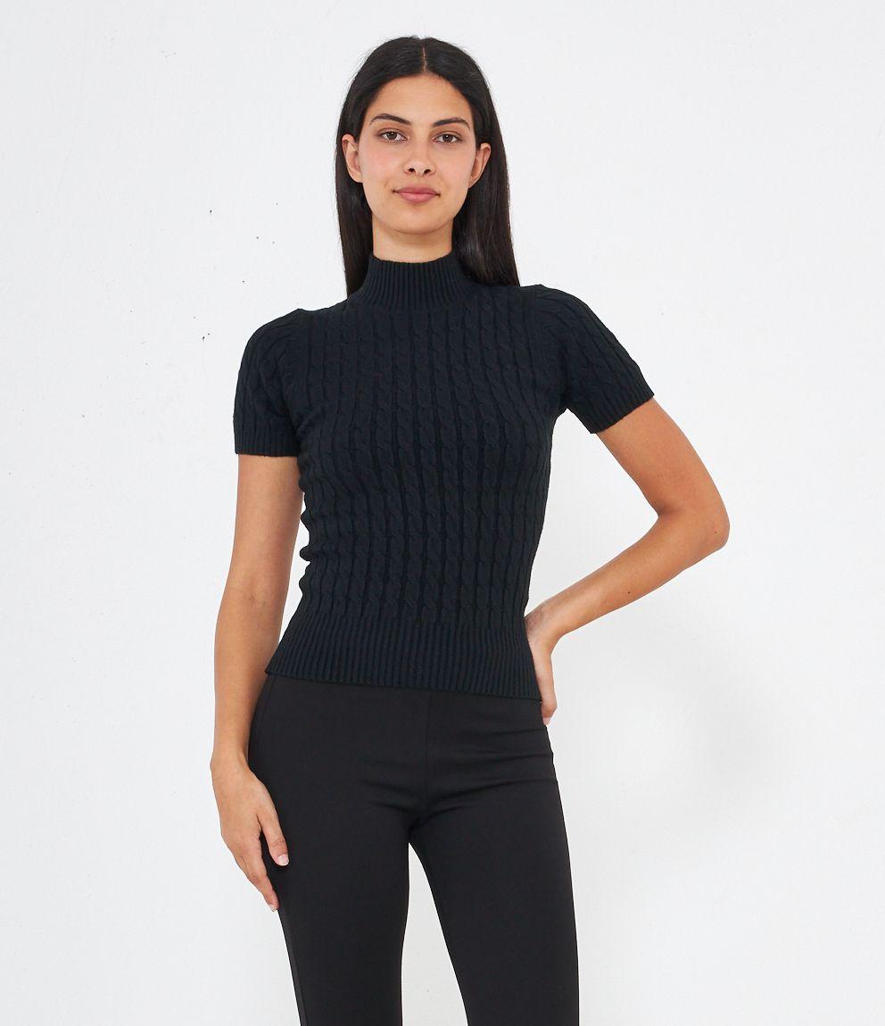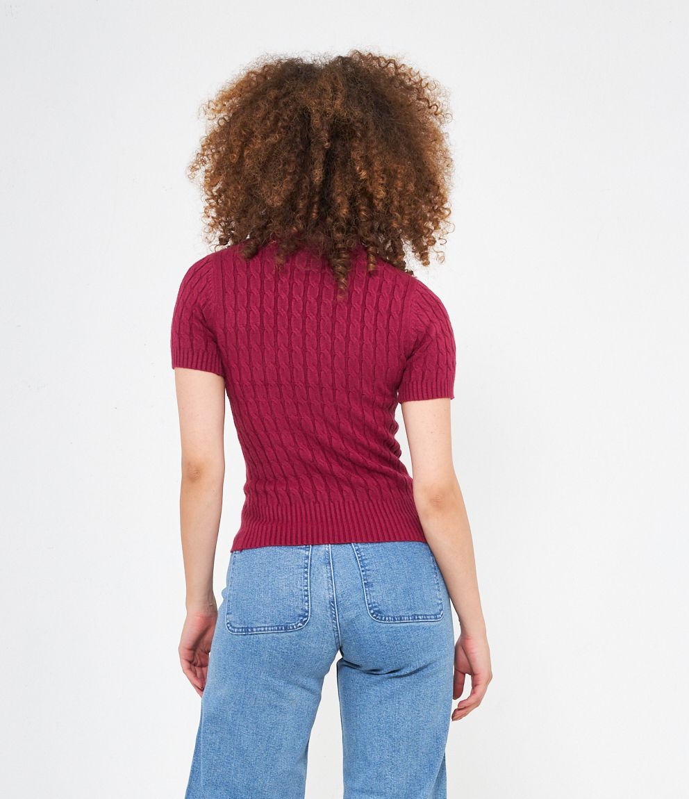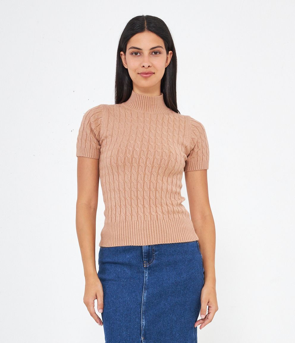 Maglia a trecce, modello a mezze maniche e mezzo collo con bordi elastici a costine.