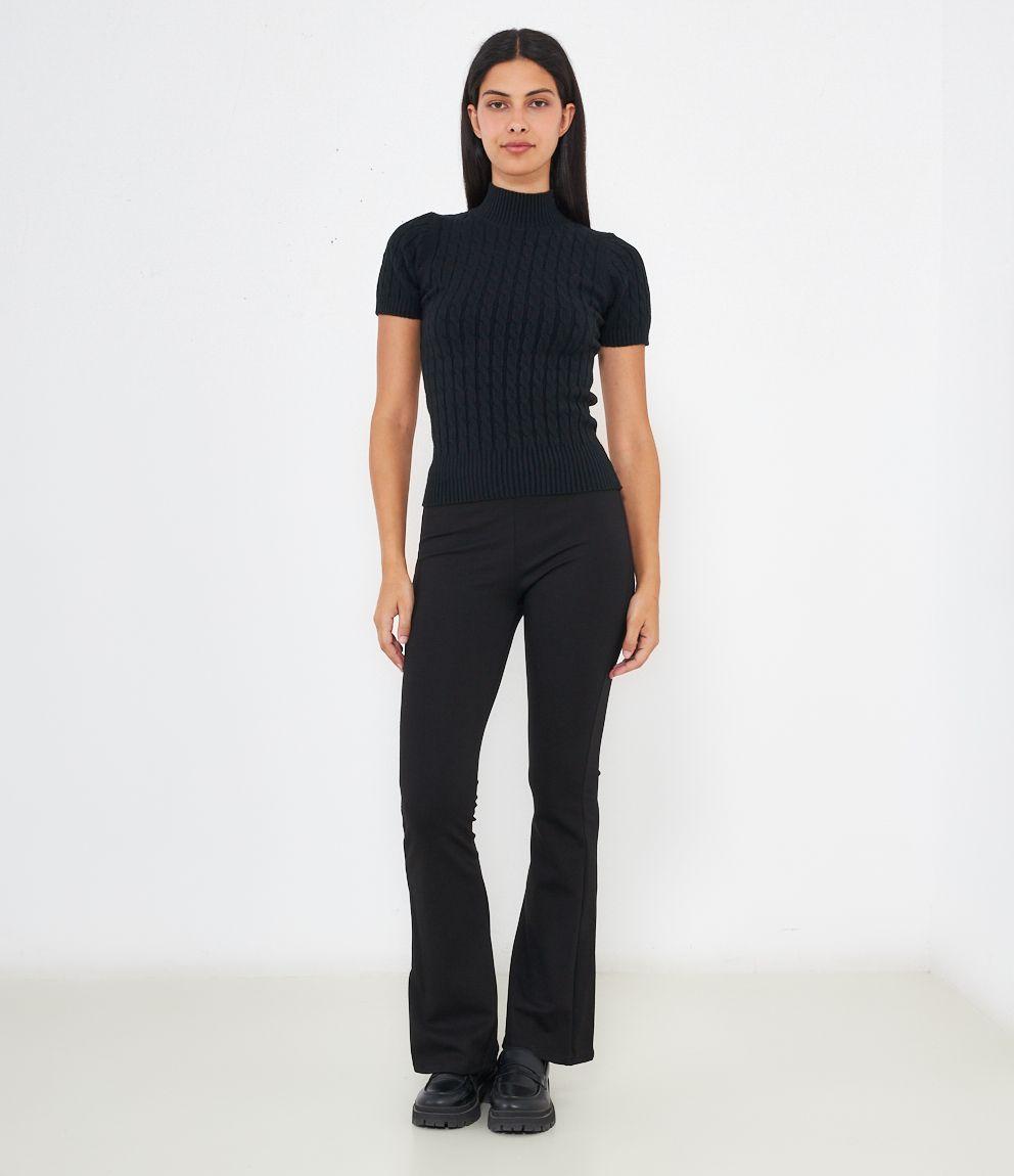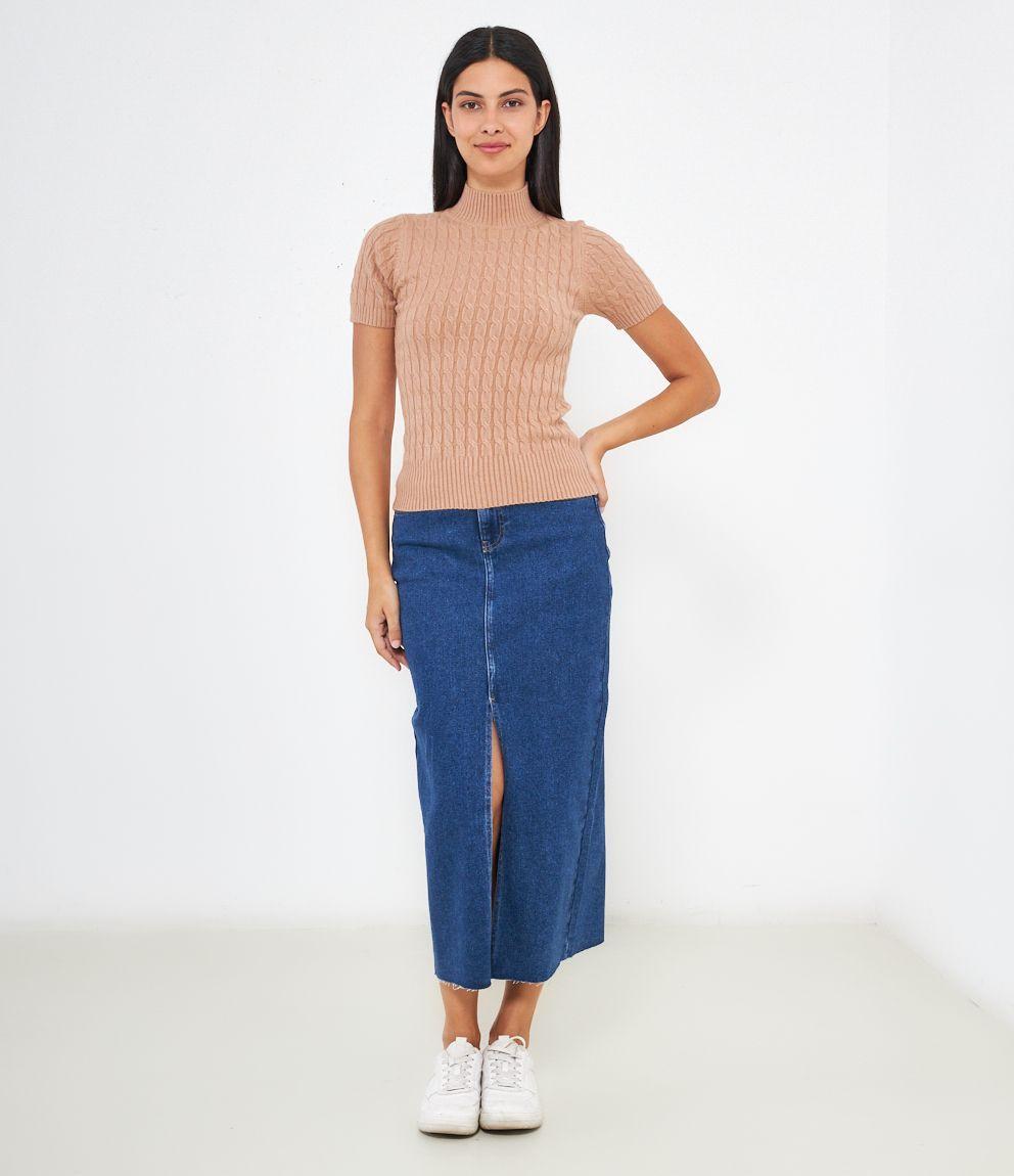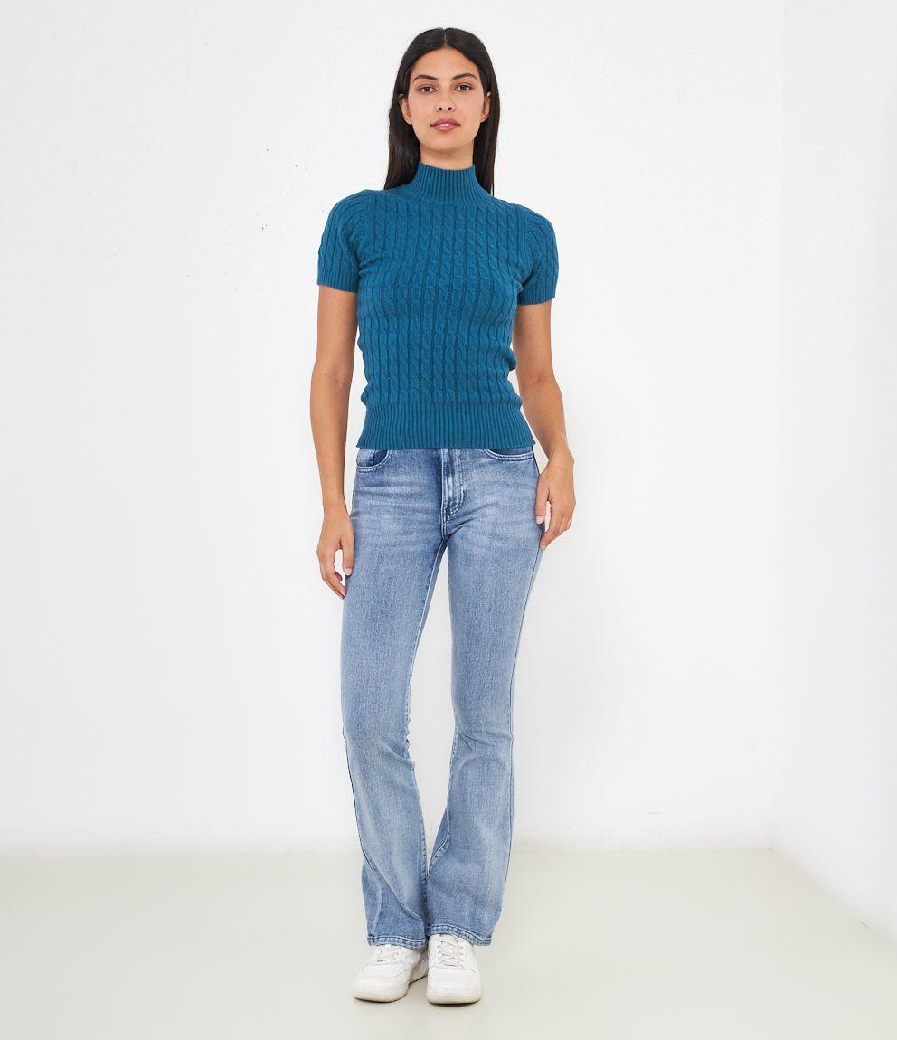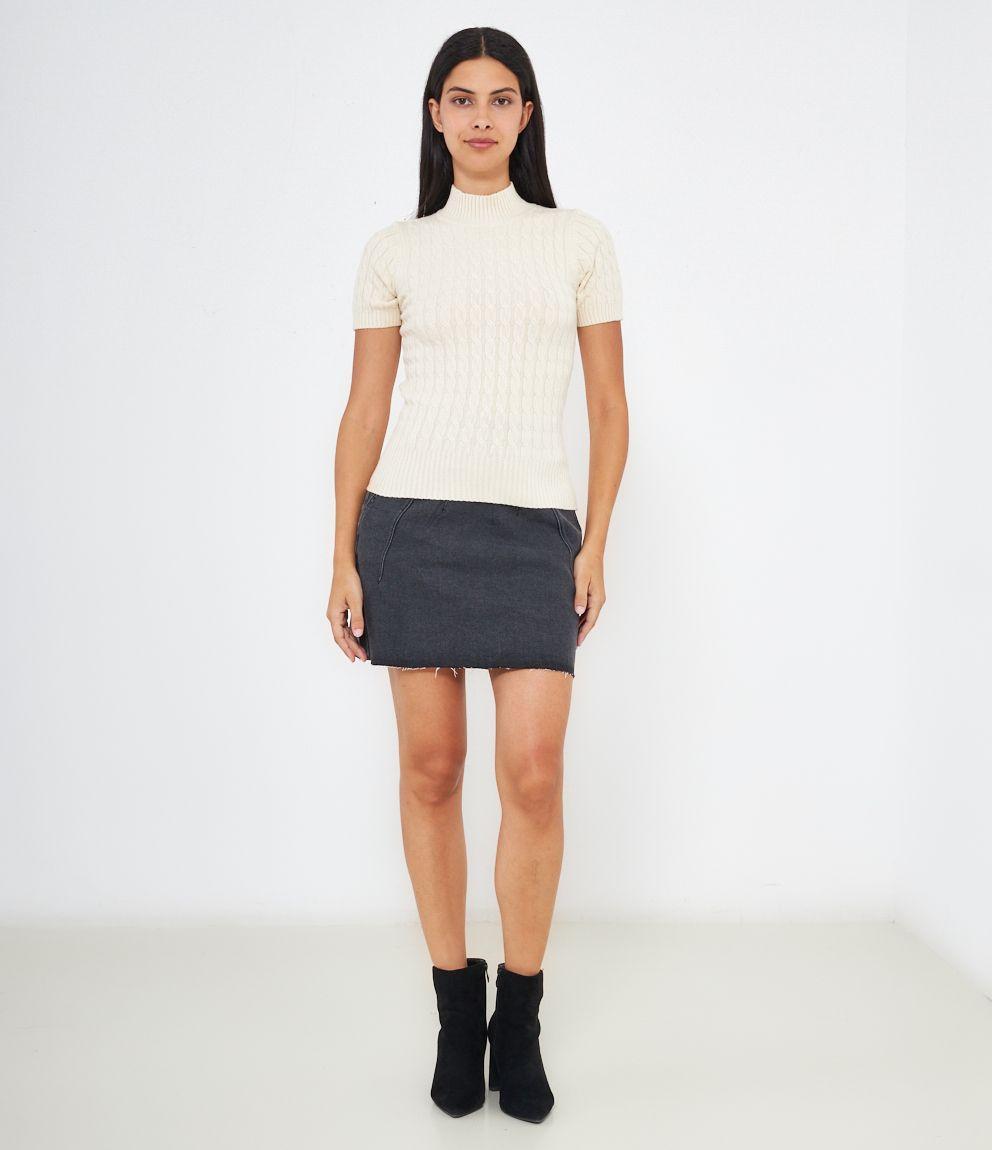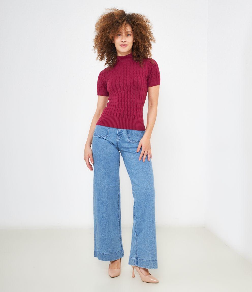 Maglia a trecce, modello a mezze maniche e mezzo collo con bordi elastici a costine.