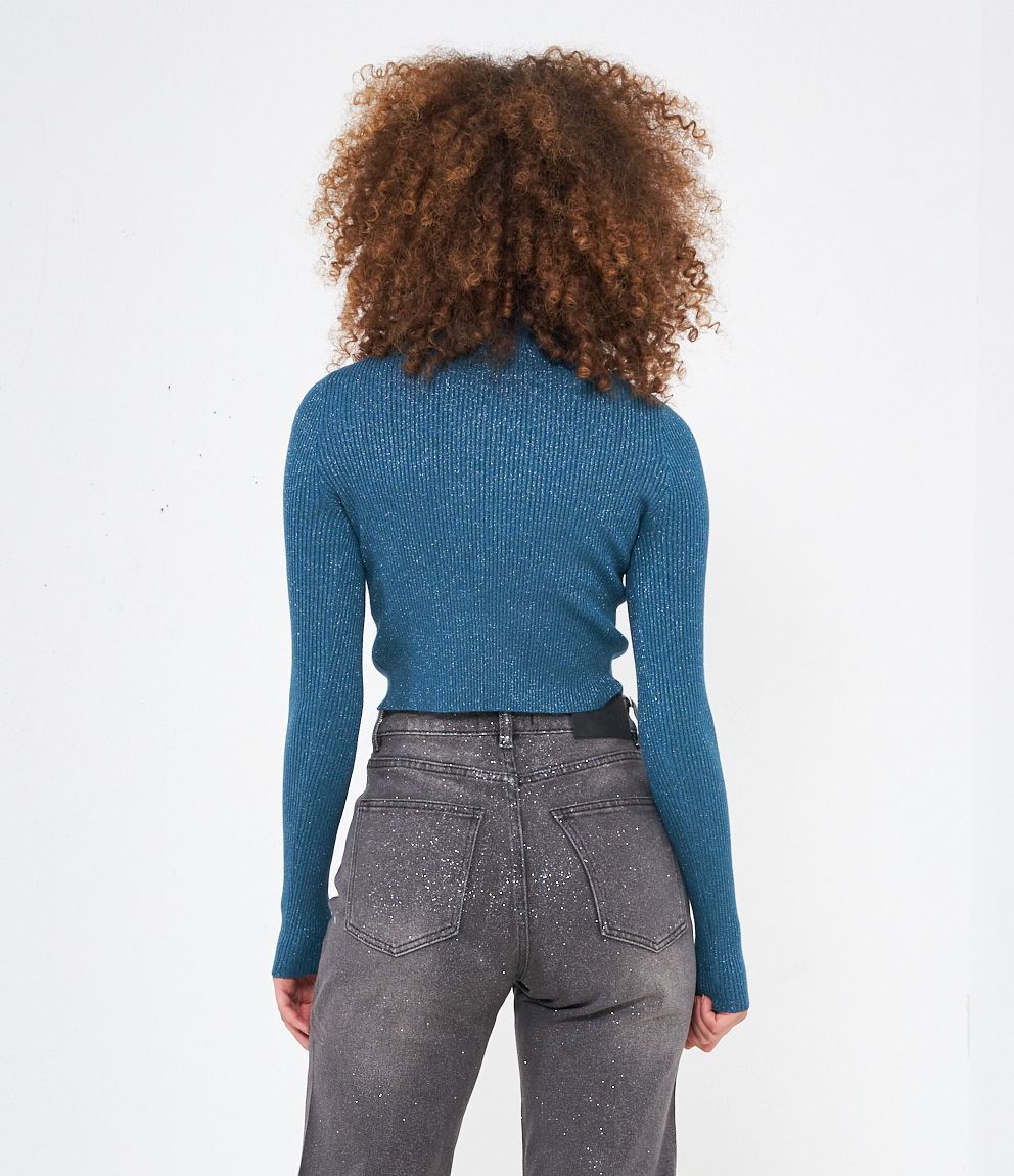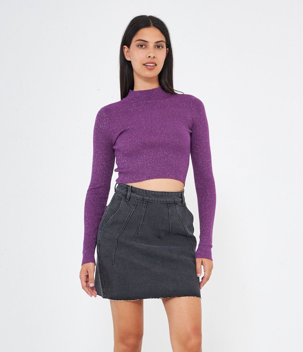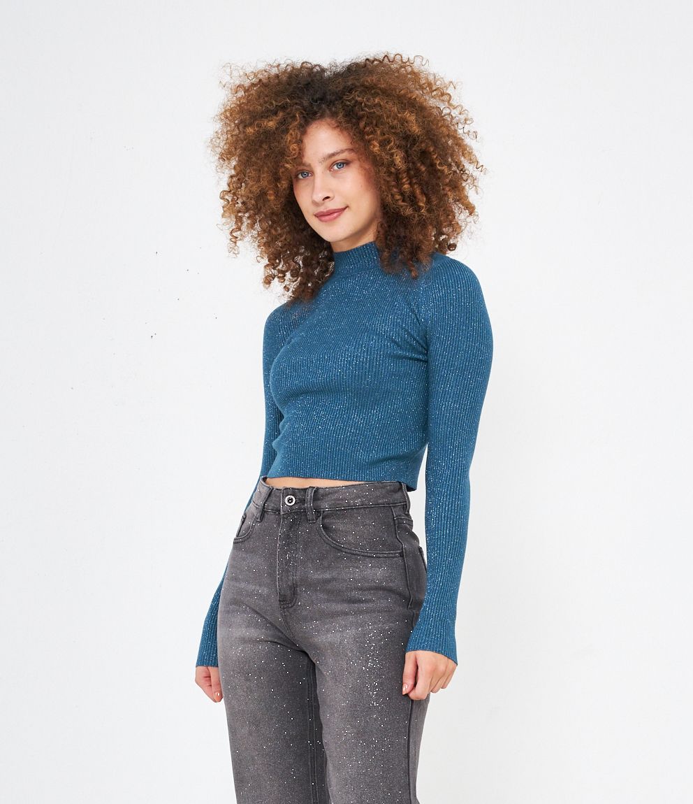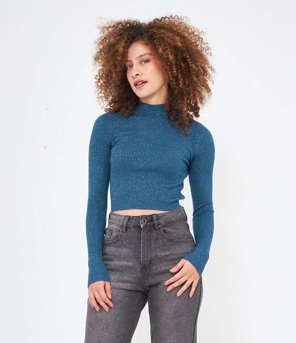Maglia in lurex, modello crop a costine con mezzo collo.