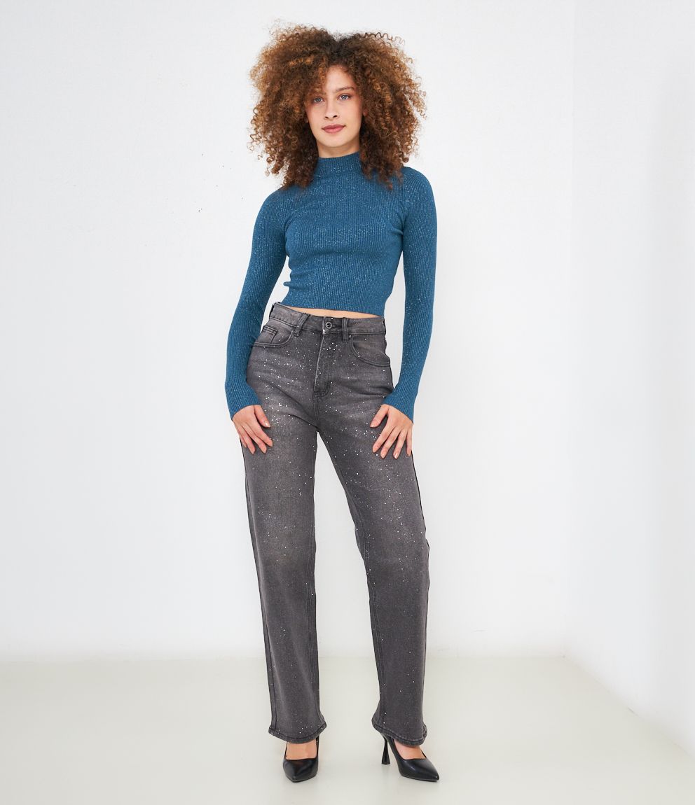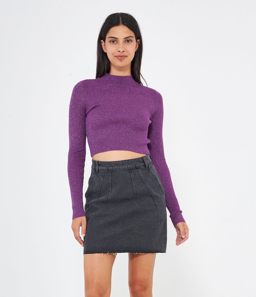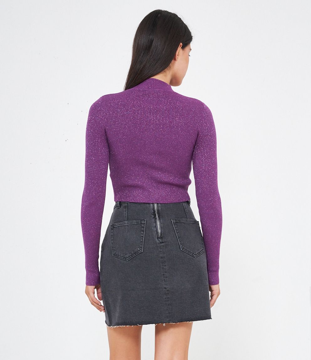 Maglia in lurex, modello crop a costine con mezzo collo.