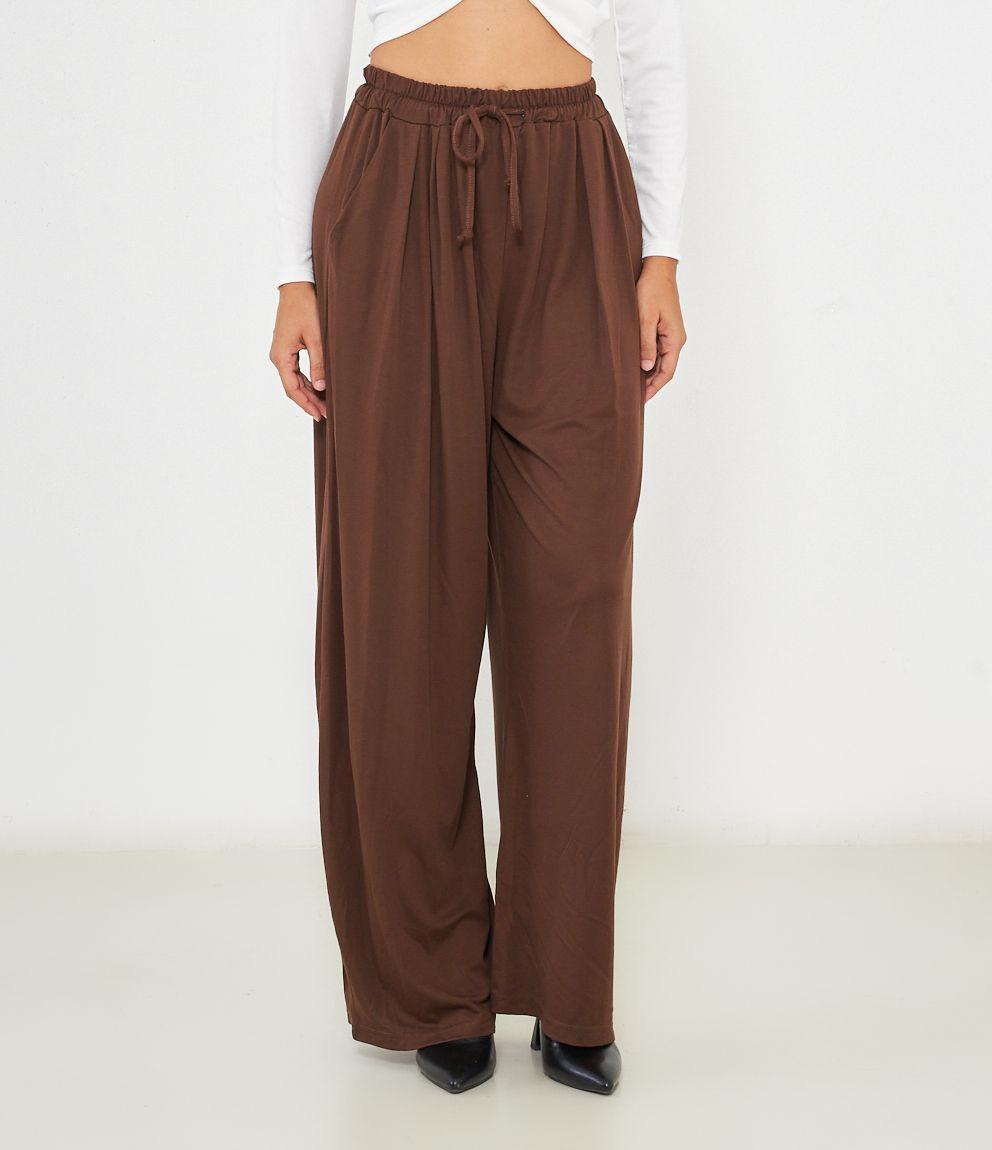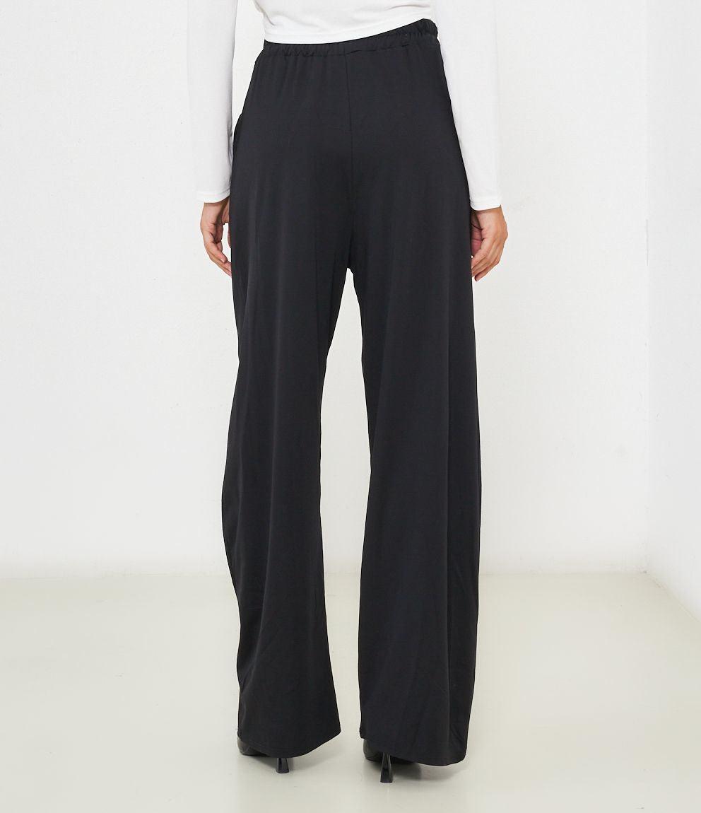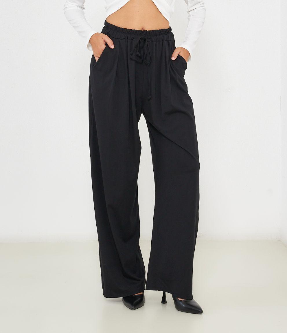 Pantaloni modello palazzo con elastico in vita e tasche laterali.