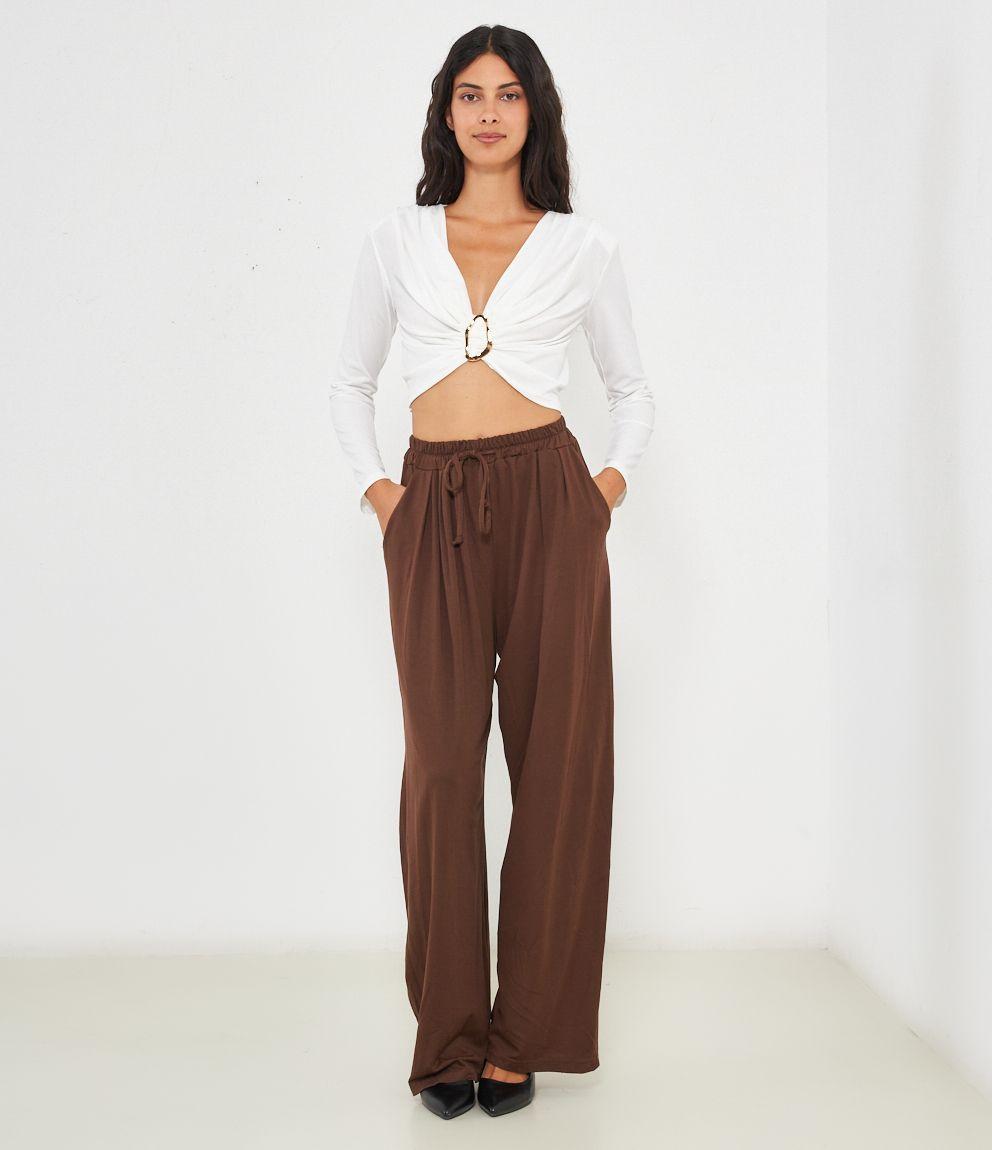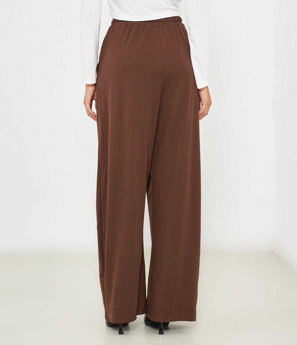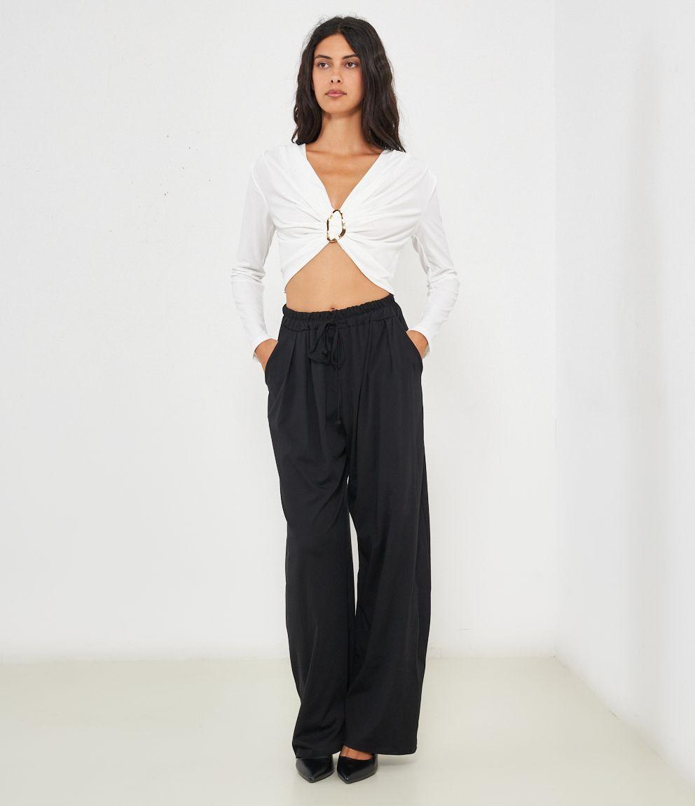 Pantaloni modello palazzo con elastico in vita e tasche laterali.