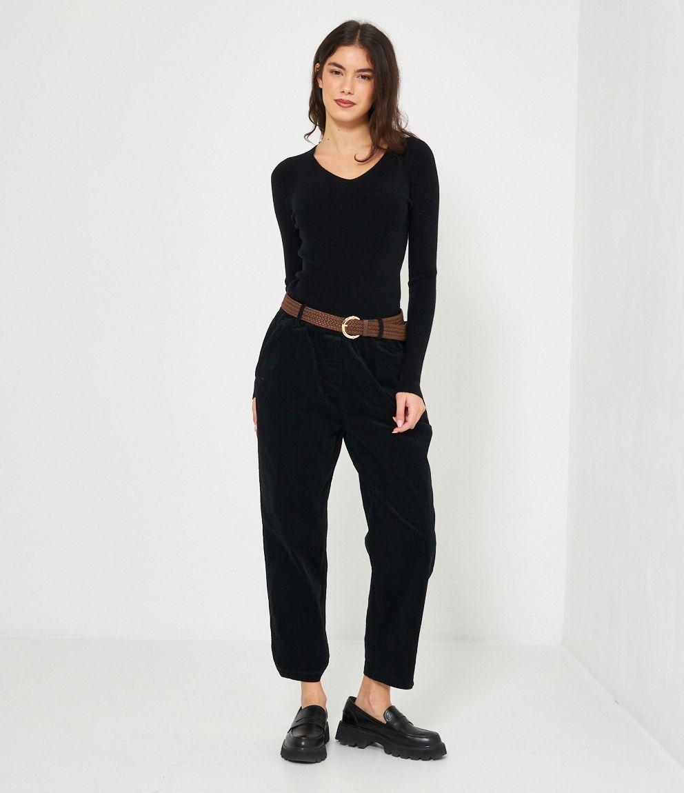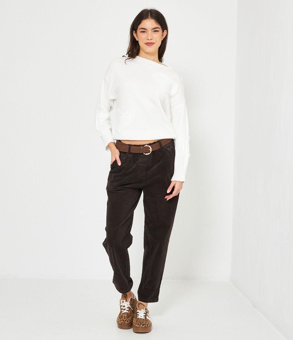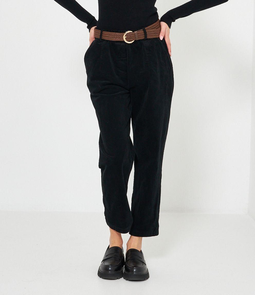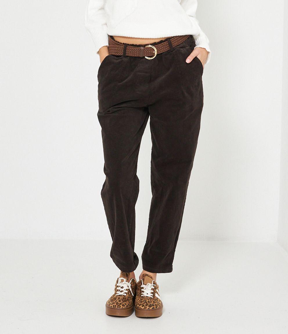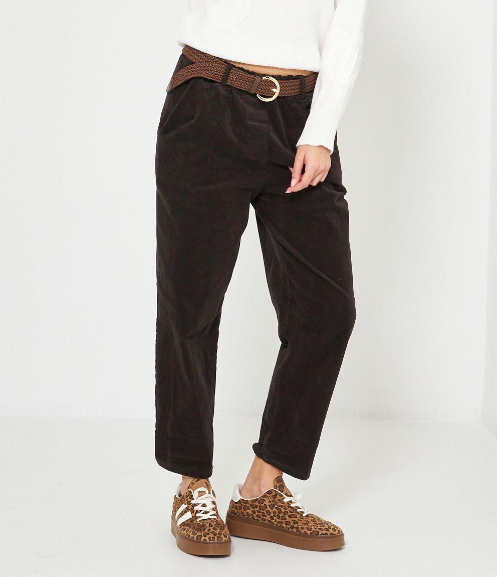 Pantaloni in ciniglia con vita elasticizzata, tasche laterali e cintura.