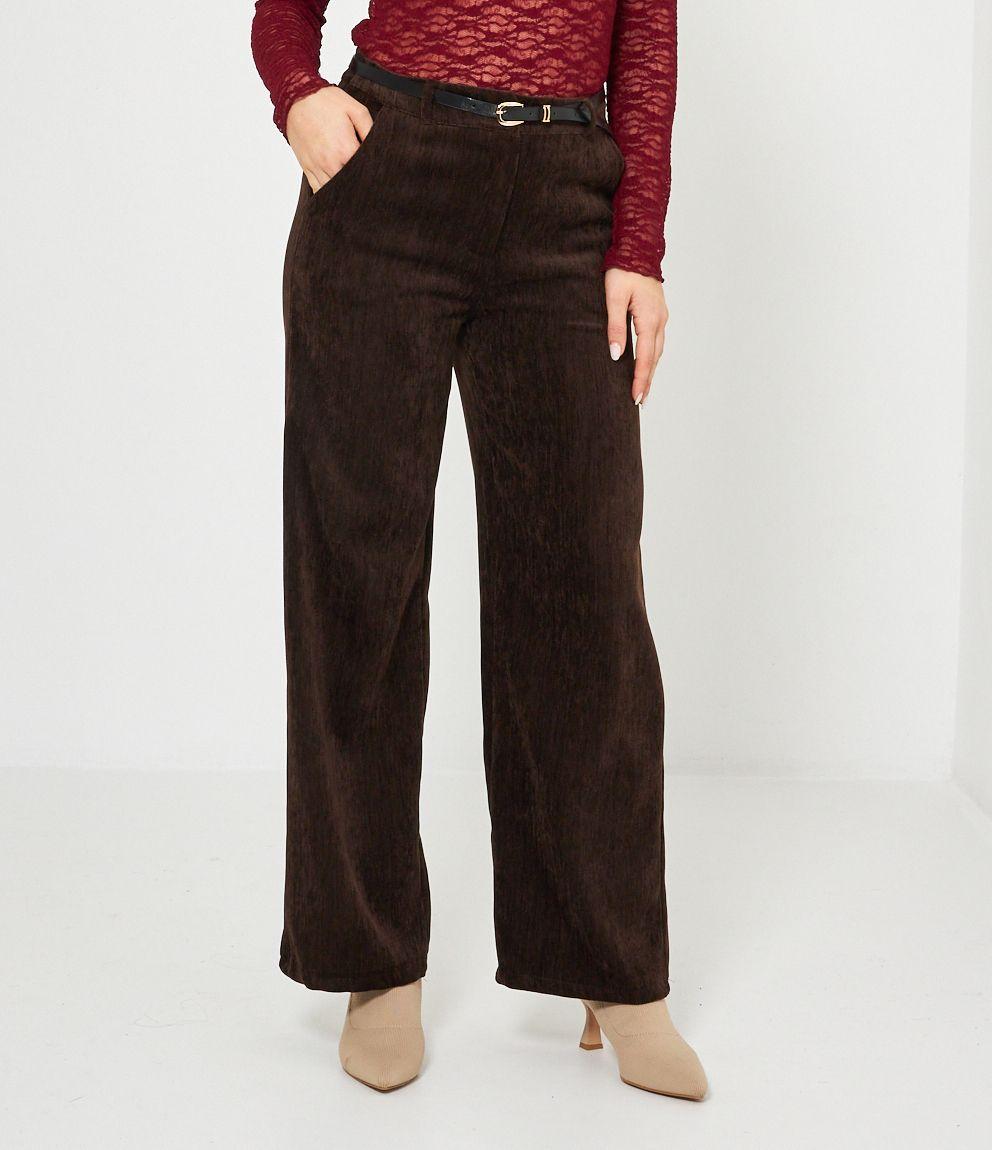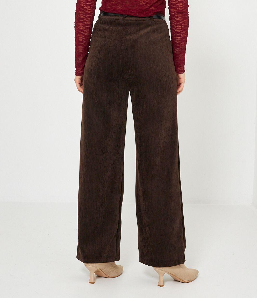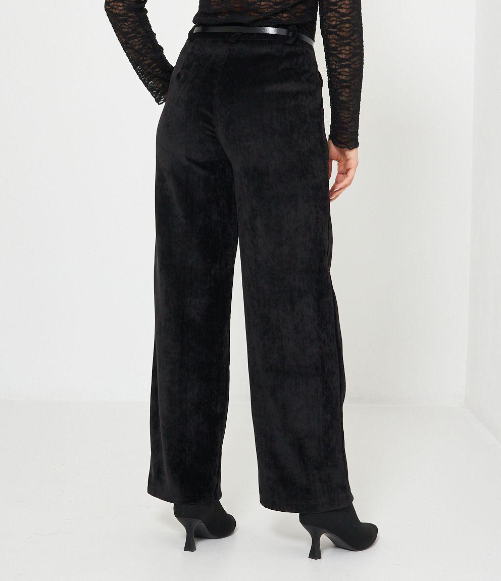 Pantaloni modello palazzo in ciniglia con tasche laterali, chiusura con zip e bottoni. Cintura in vita.