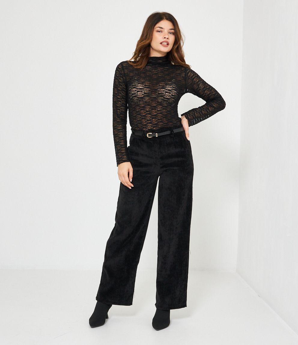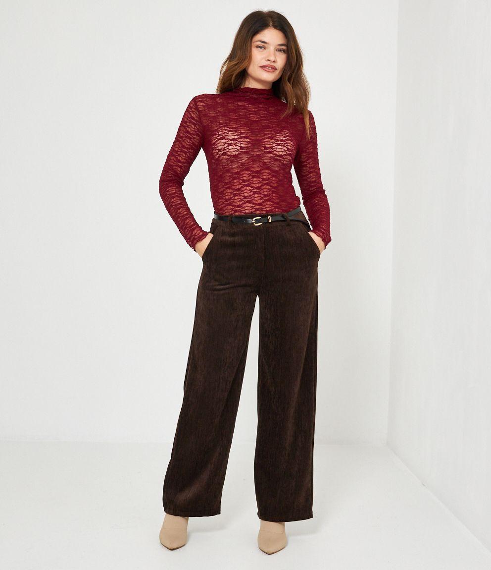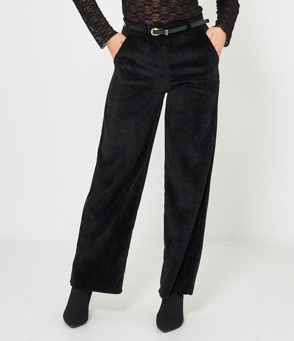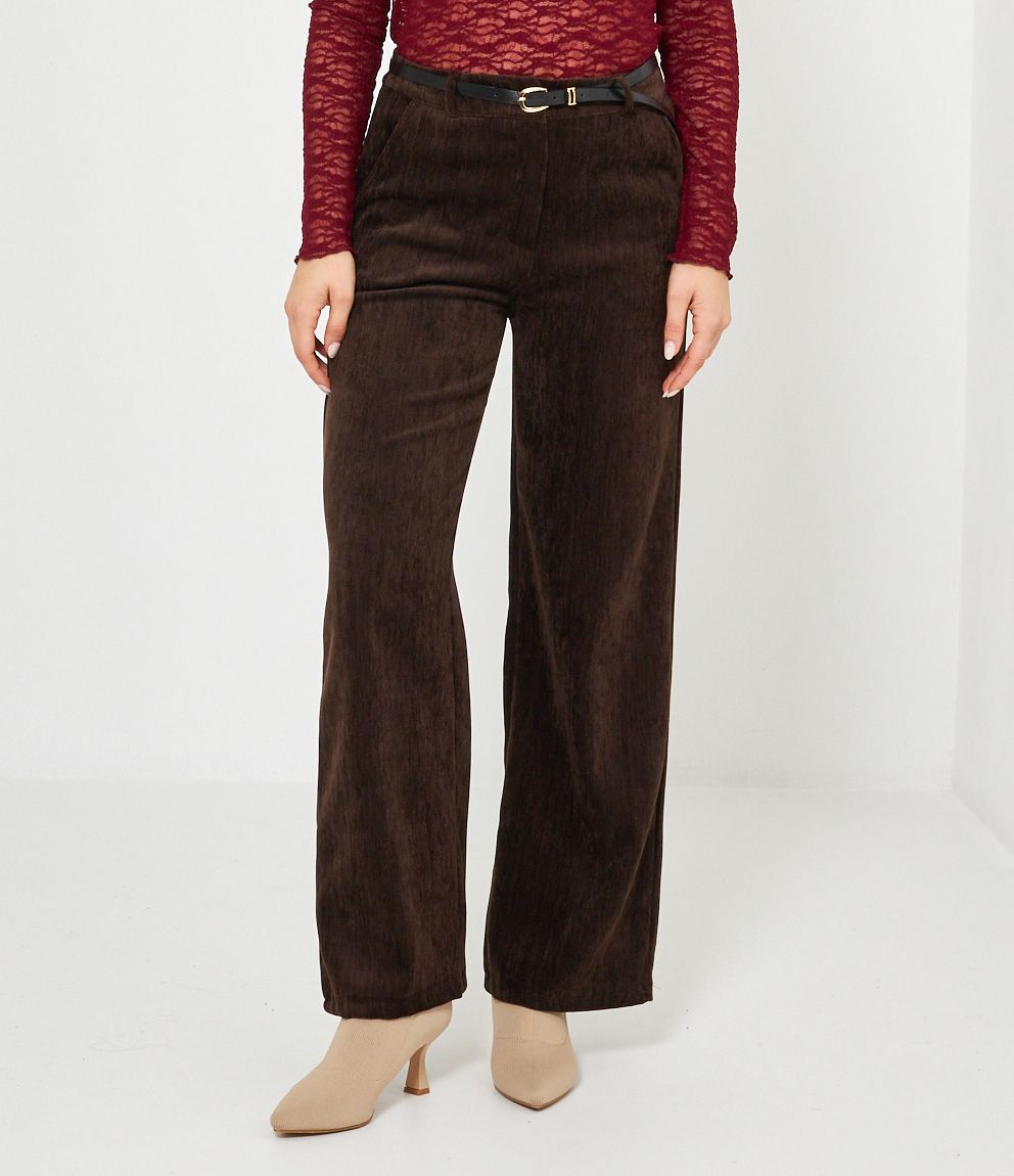 Pantaloni modello palazzo in ciniglia con tasche laterali, chiusura con zip e bottoni. Cintura in vita.