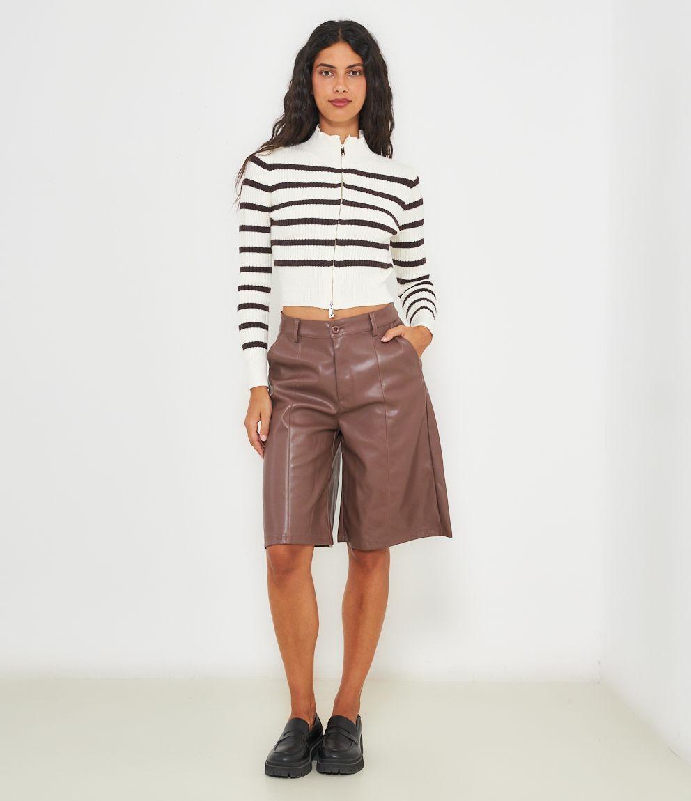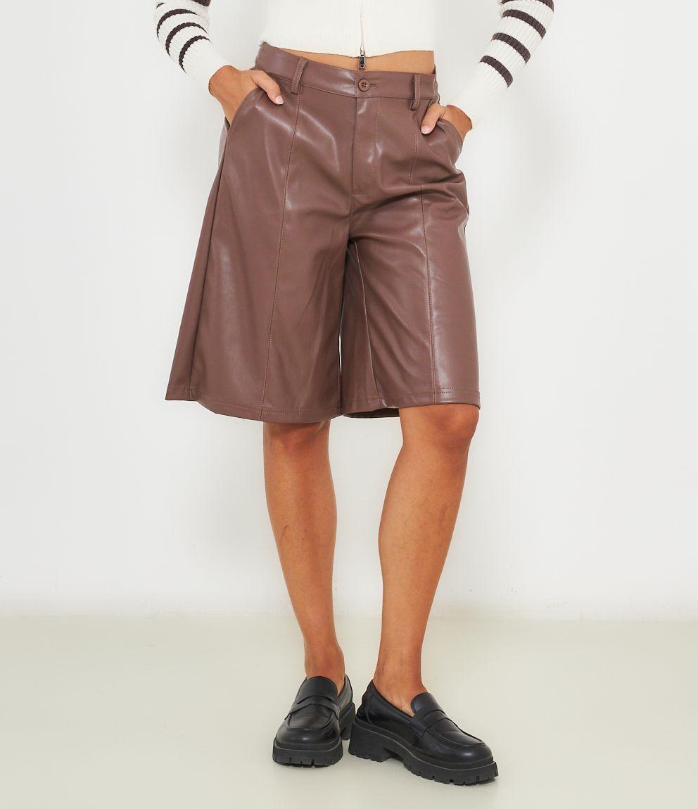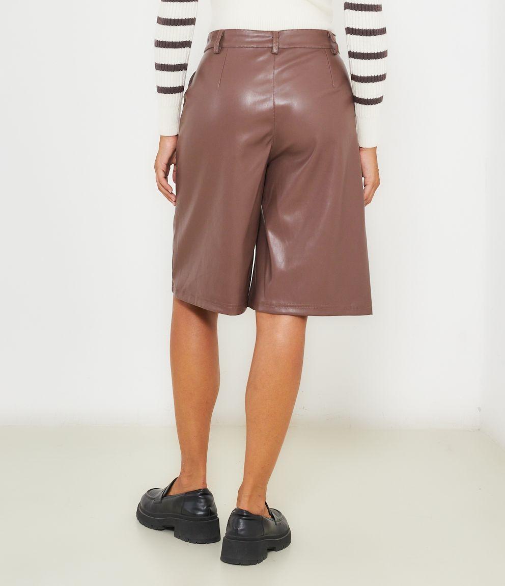 Bermuda effetto pelle con tasche laterali e chiusura con zip e bottone.