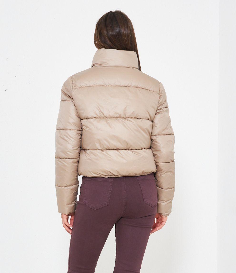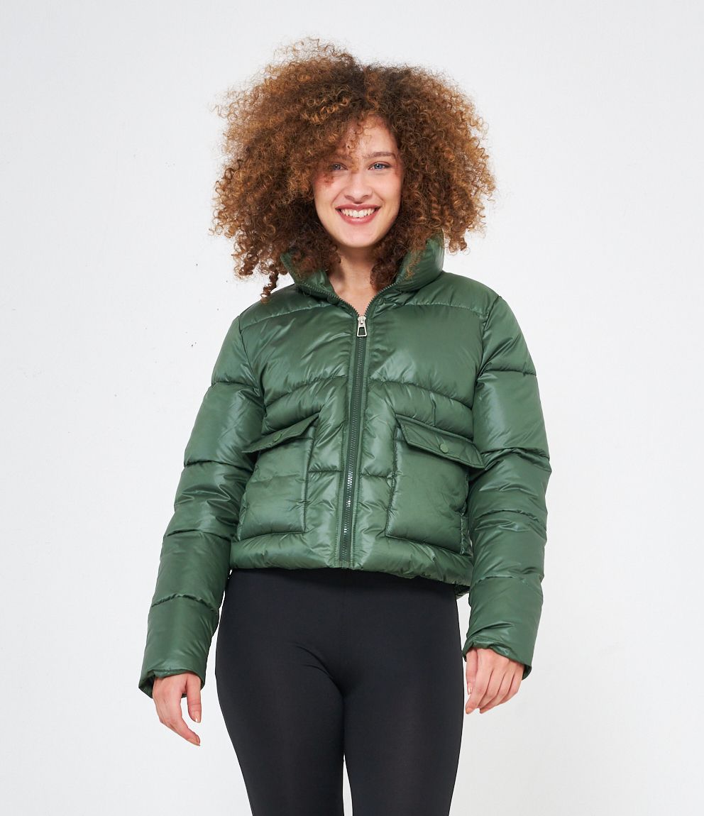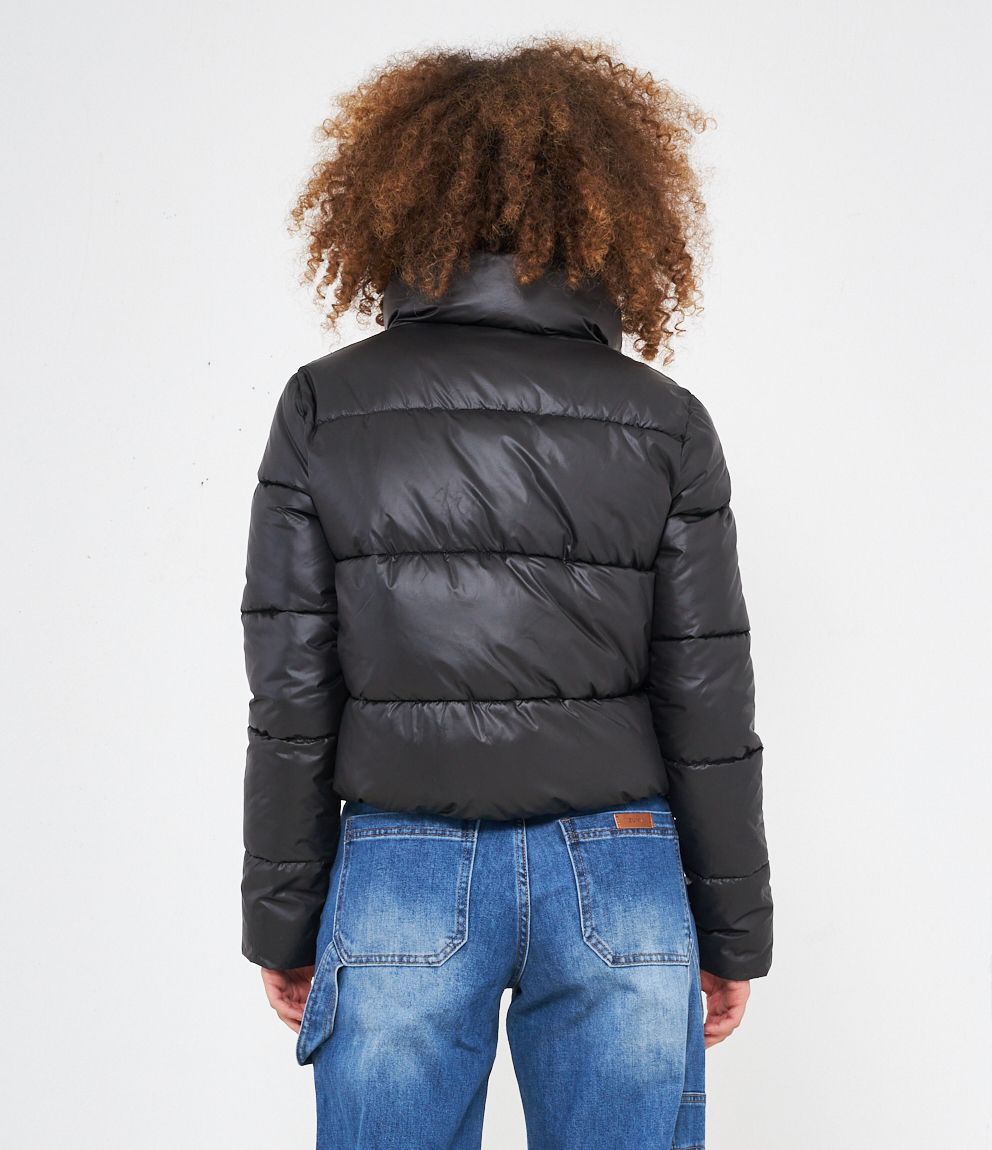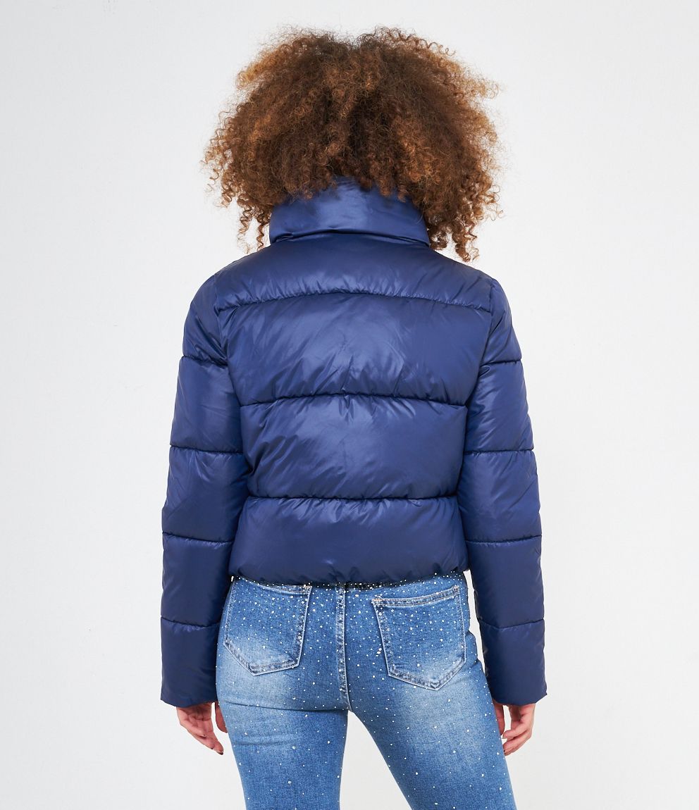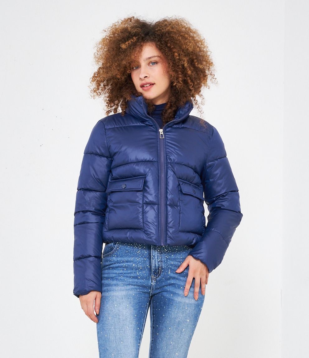 Piumino modello crop con tasche con patta e chiusura con zip.