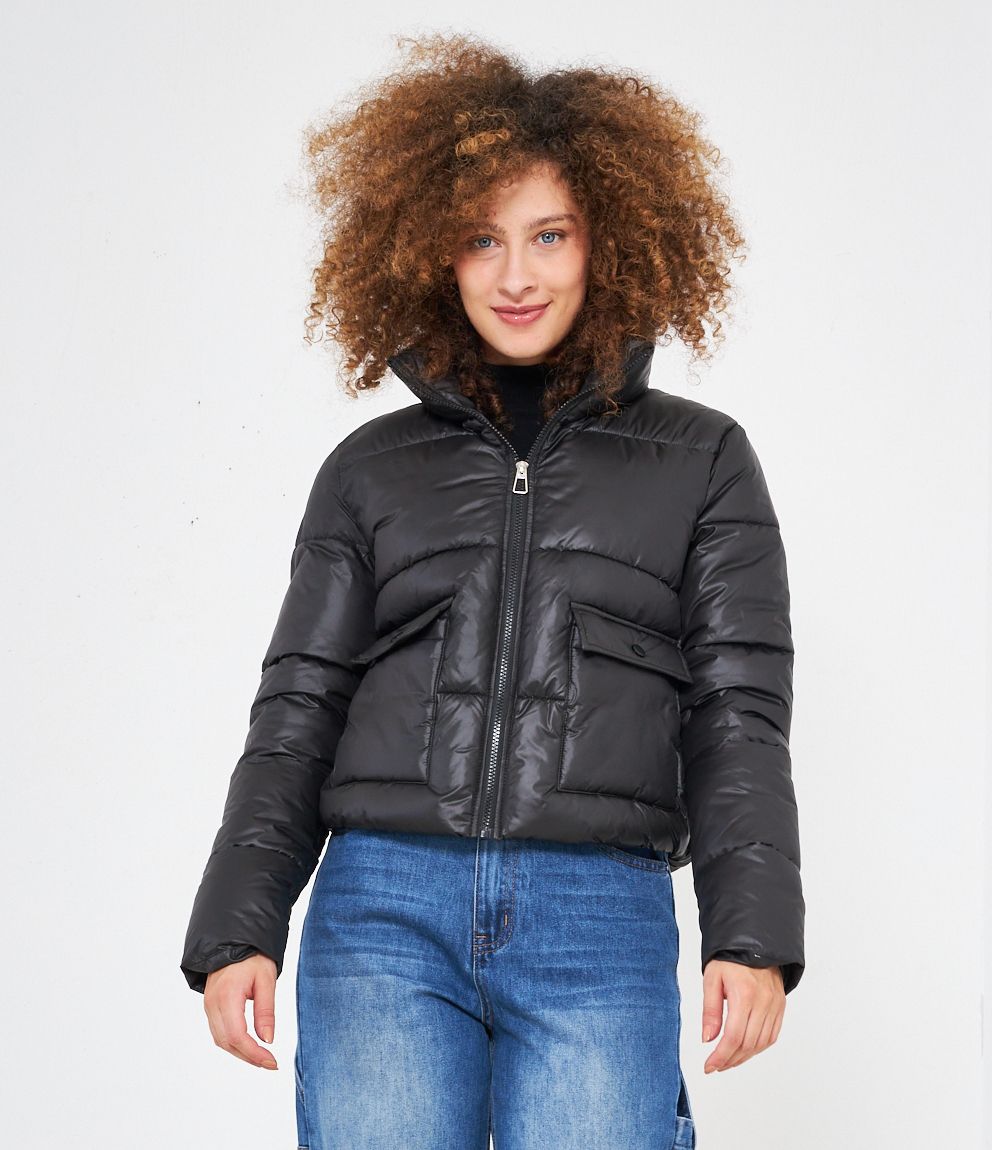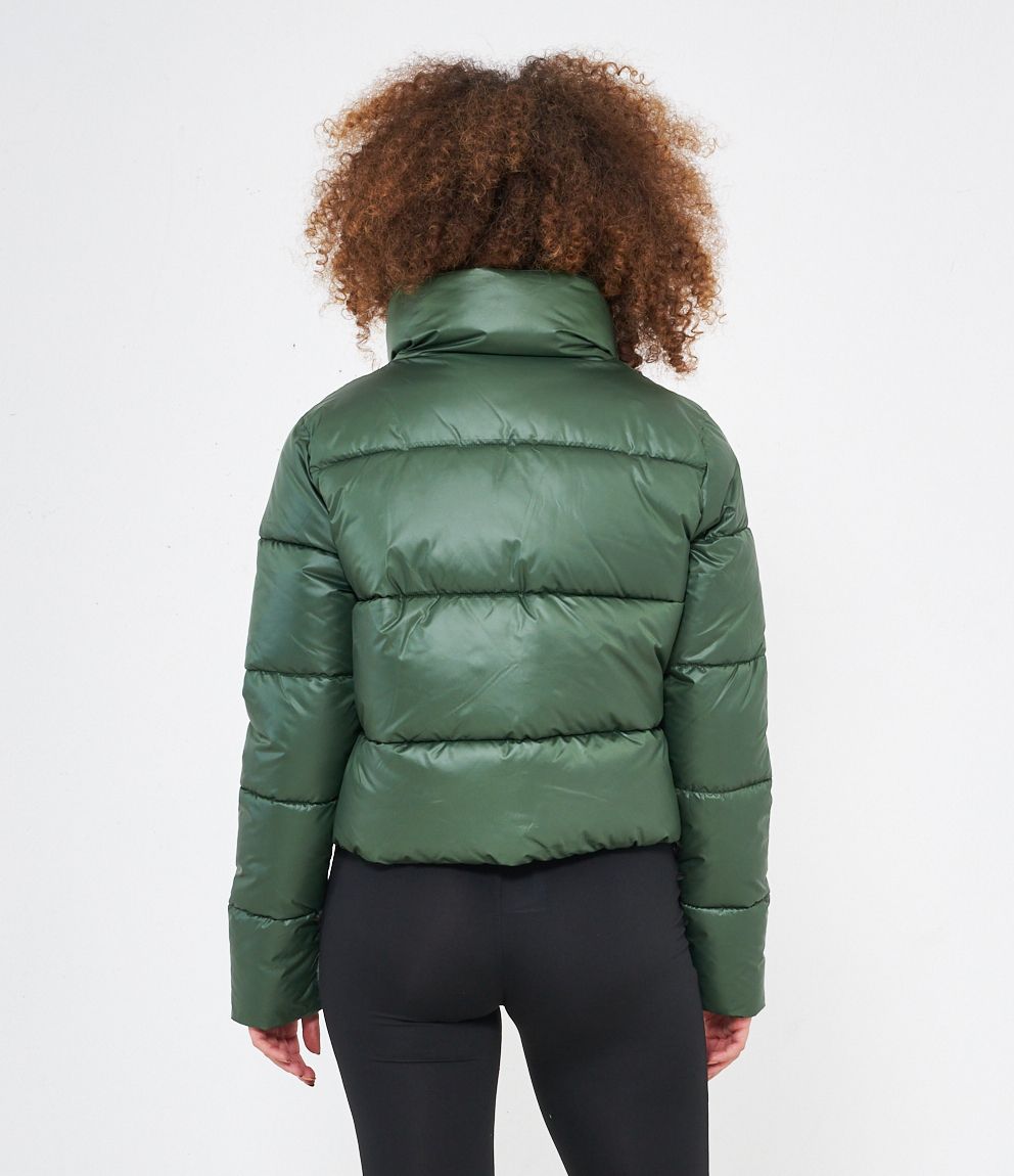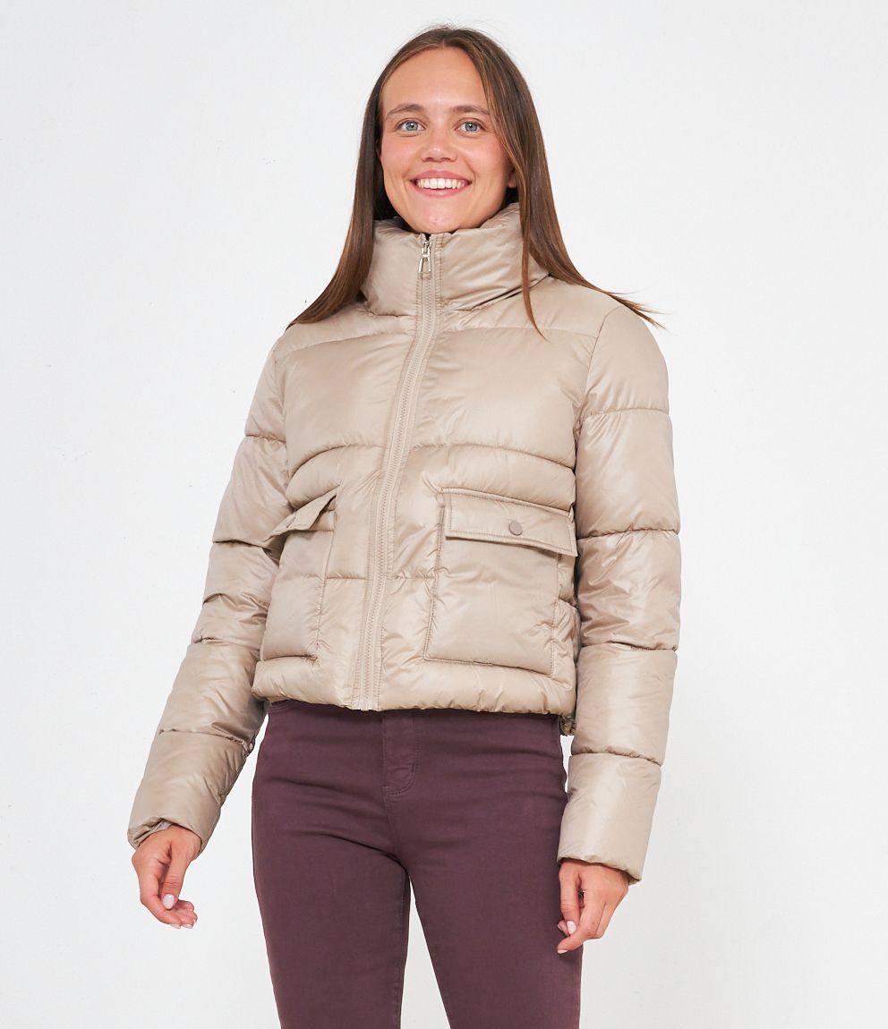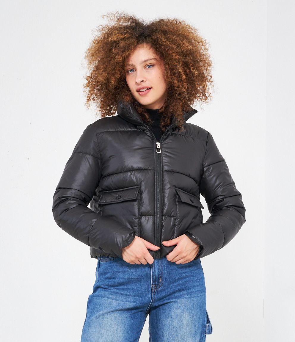 Piumino modello crop con tasche con patta e chiusura con zip.