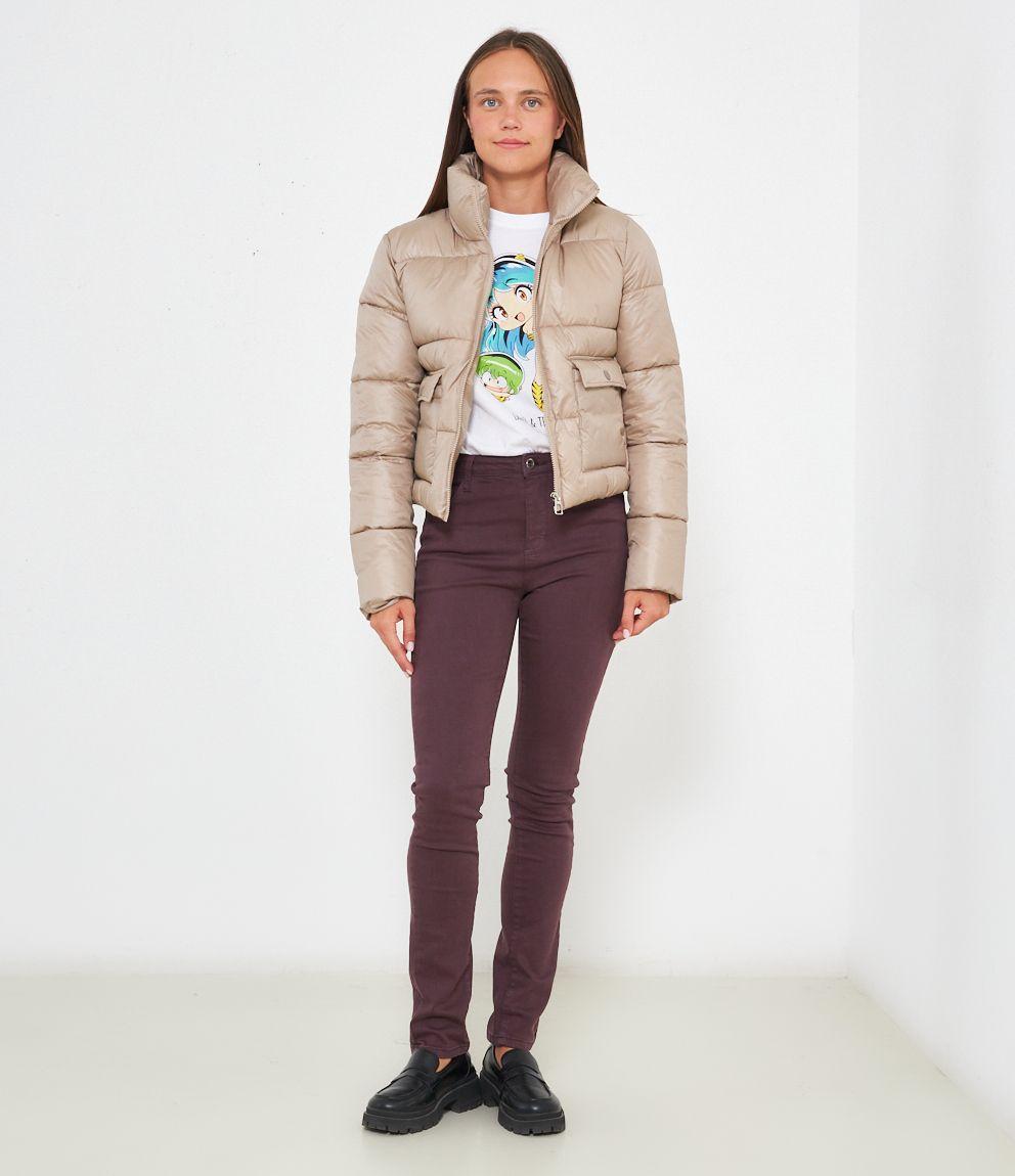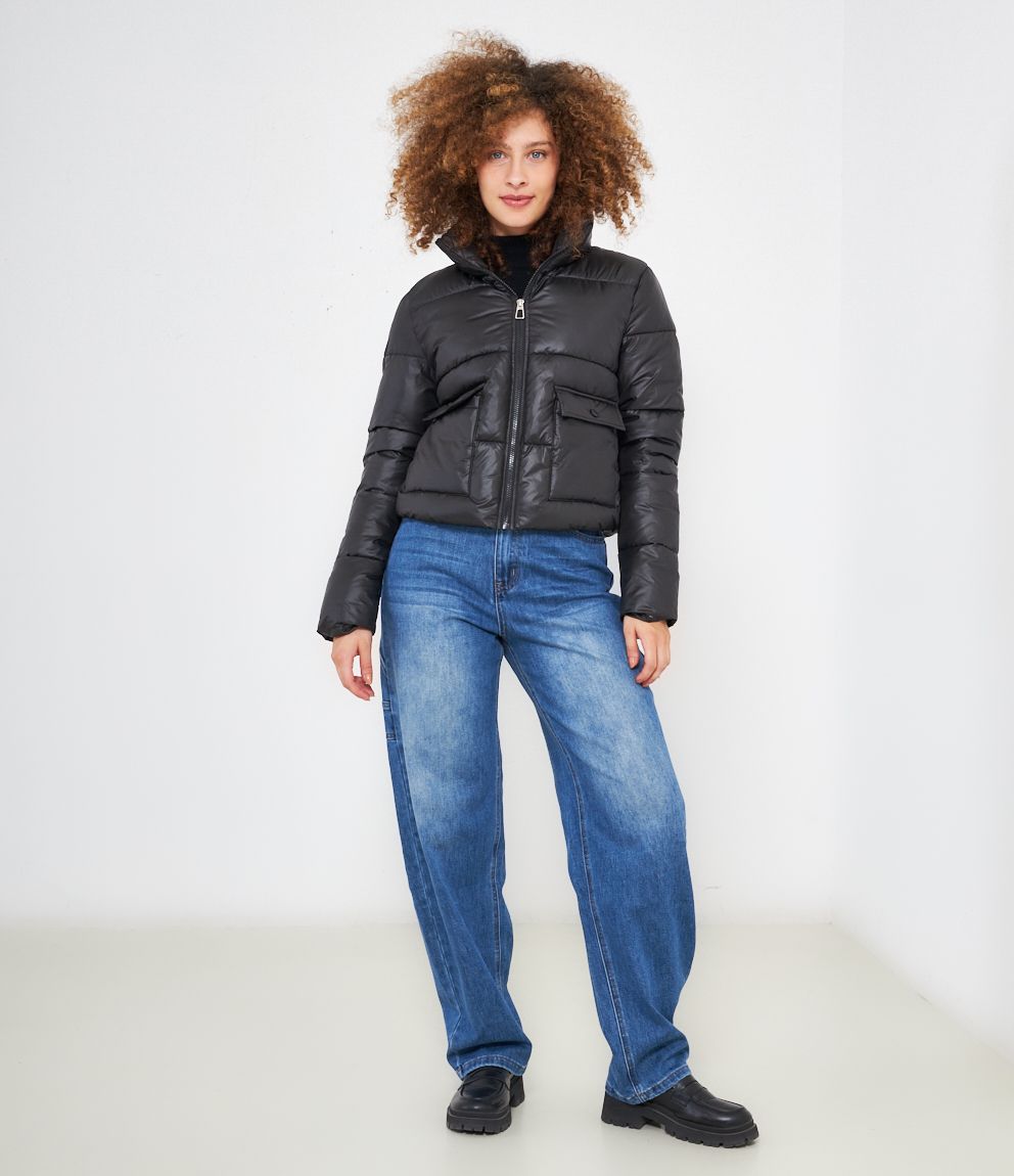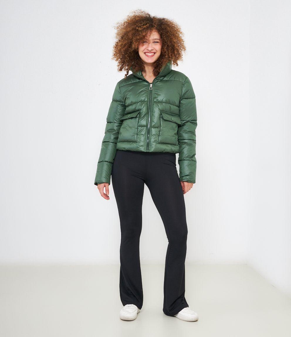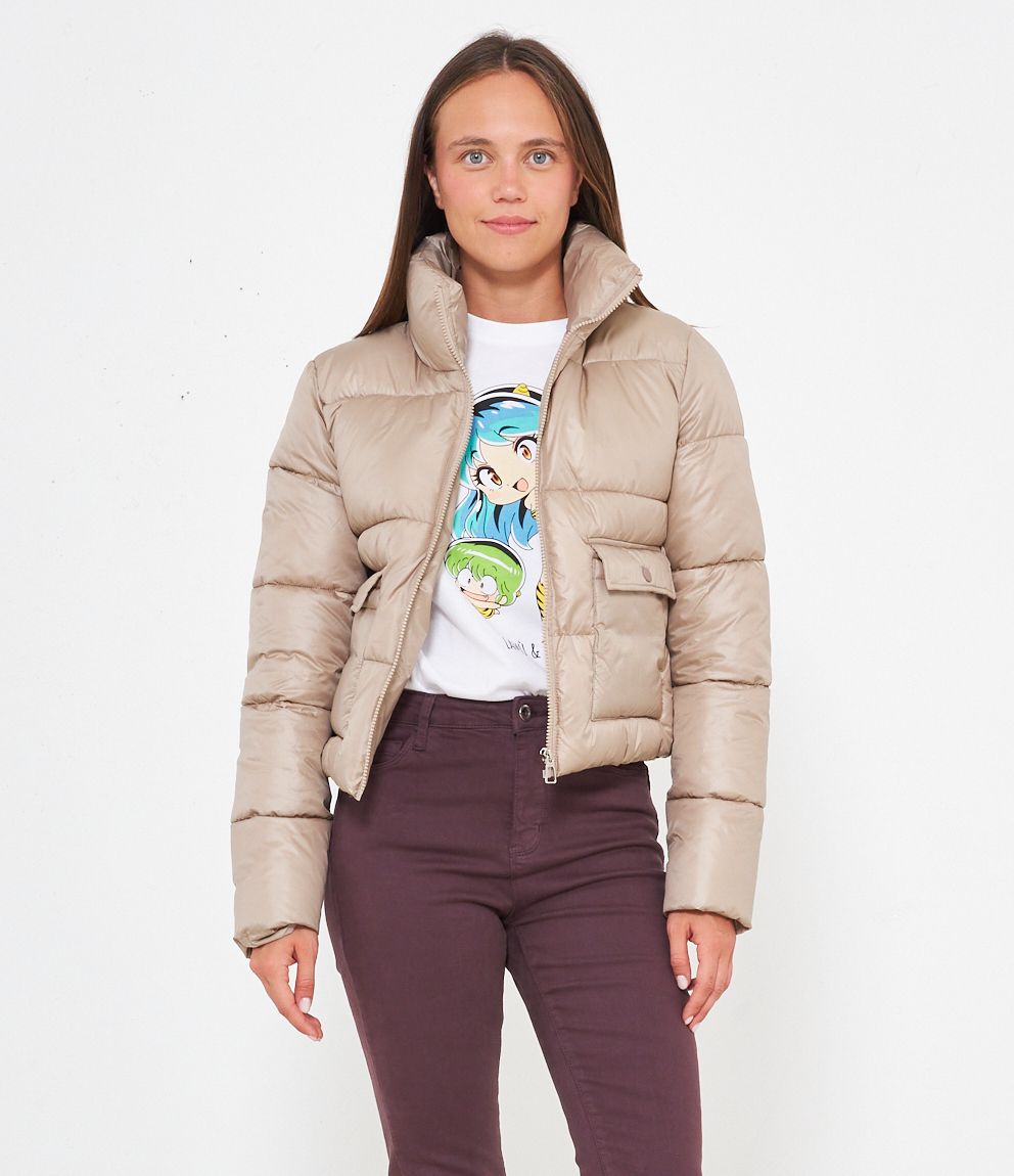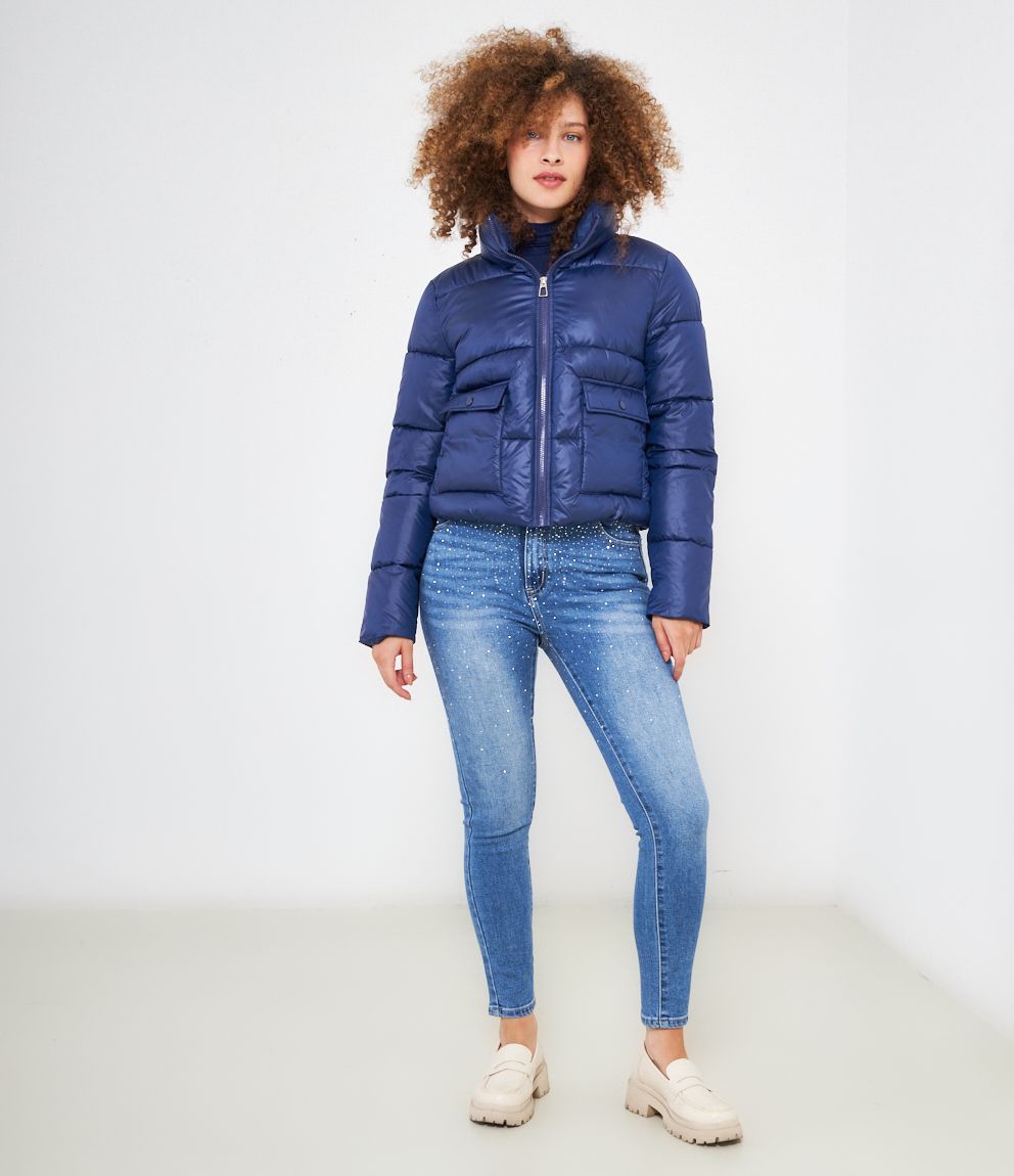 Piumino modello crop con tasche con patta e chiusura con zip.