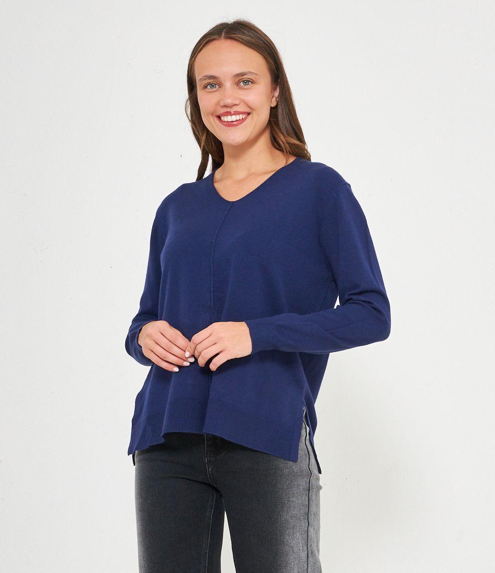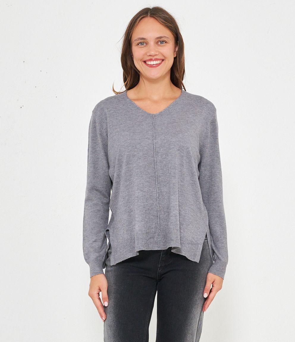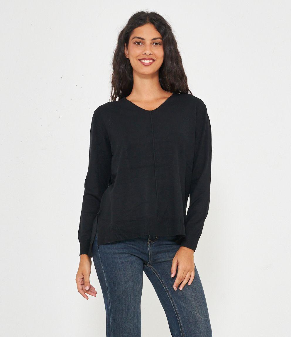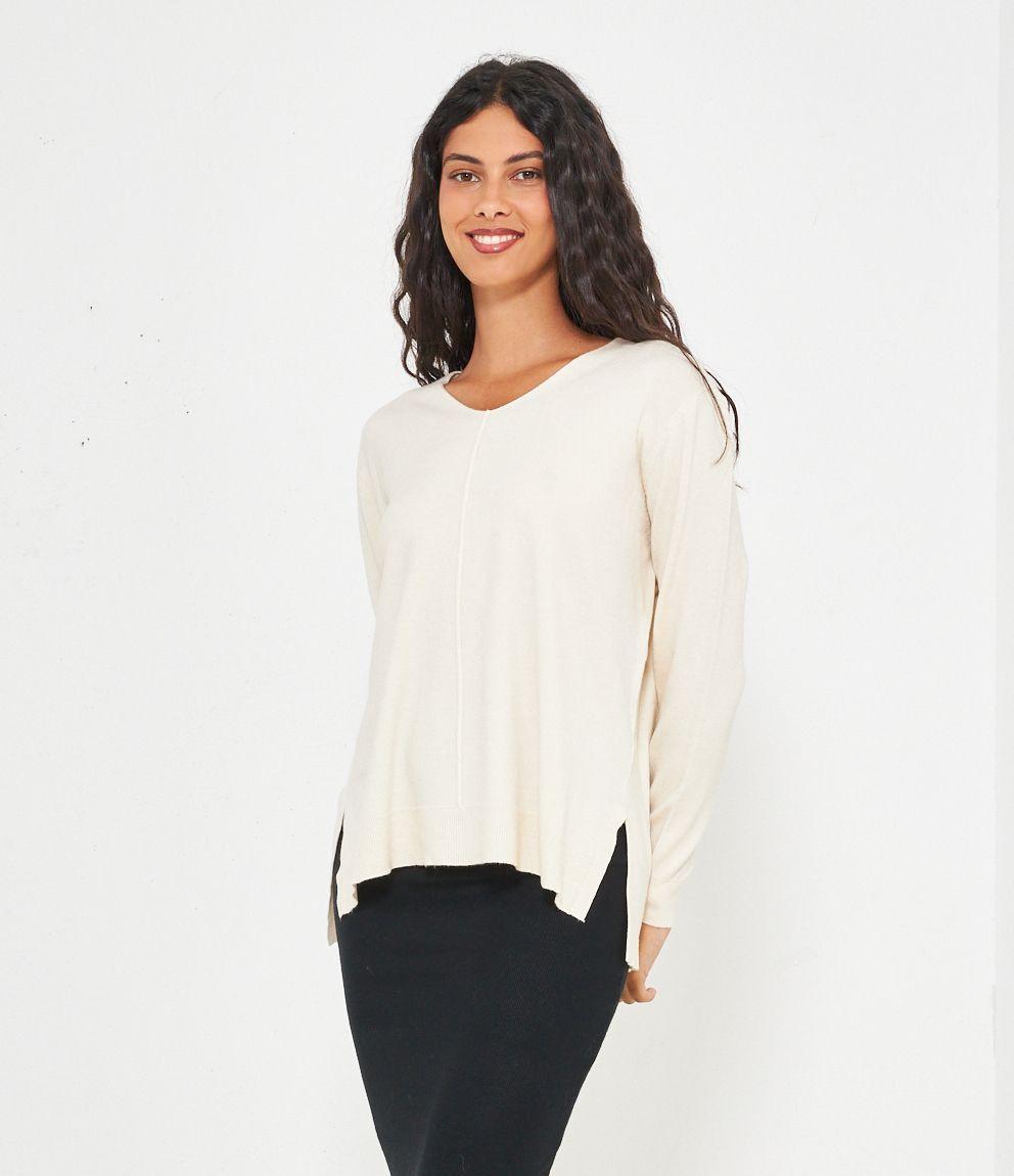 Maglia modello comfy con cucitura a vista, scollo a V e spacchi laterali.