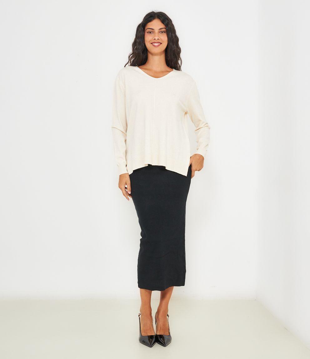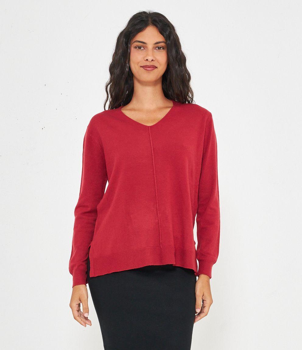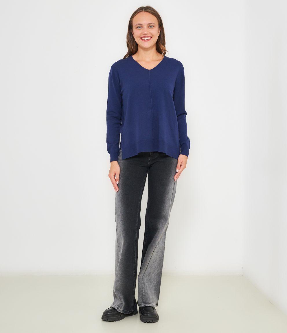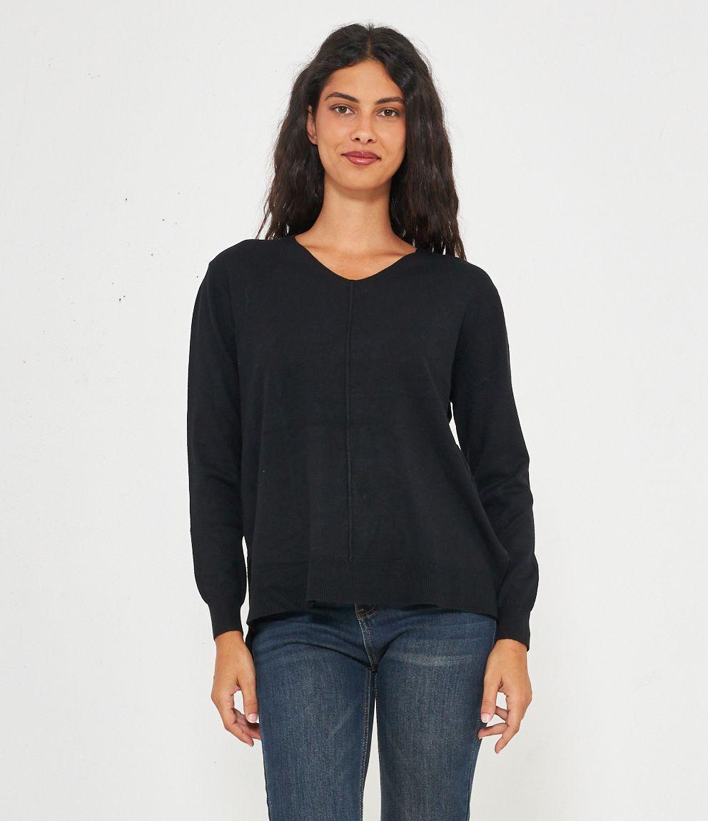 Maglia modello comfy con cucitura a vista, scollo a V e spacchi laterali.