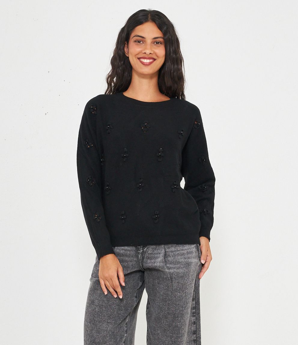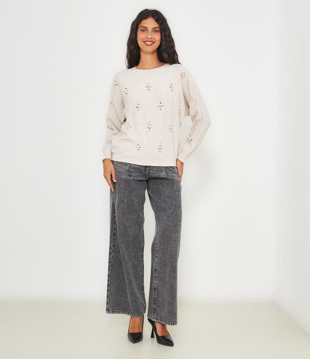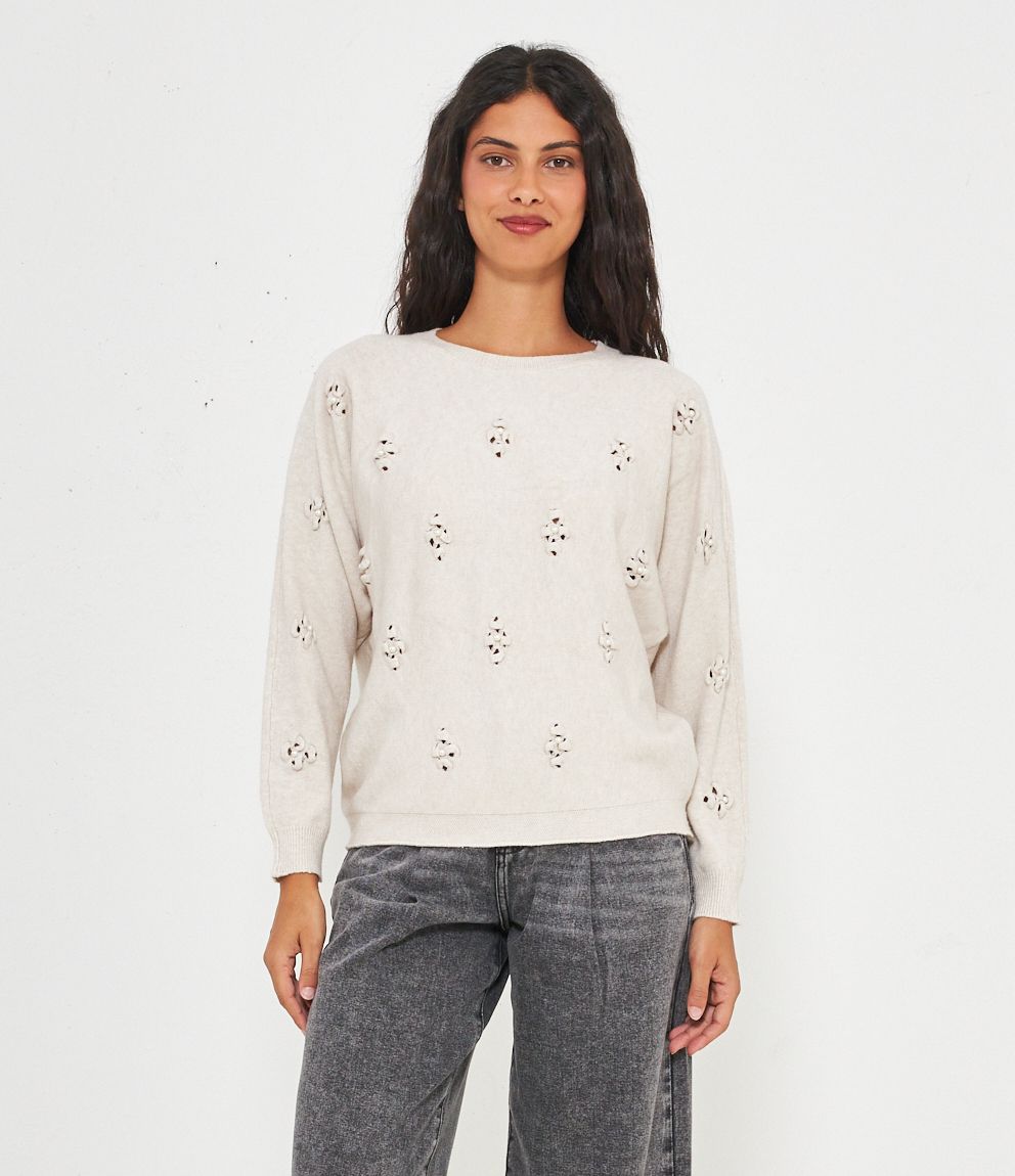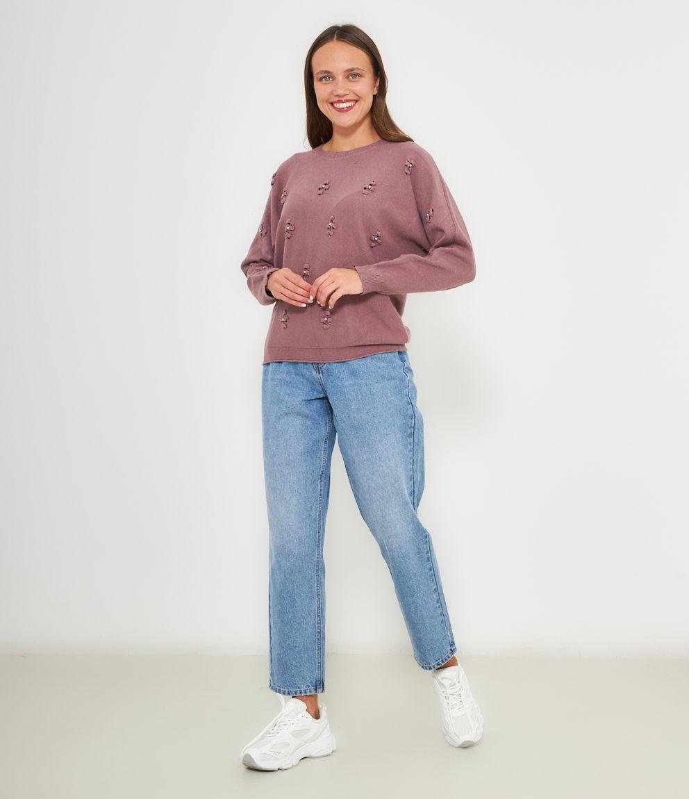 Maglia modello over con ricami a rilievo, girocollo e bordi a costine.