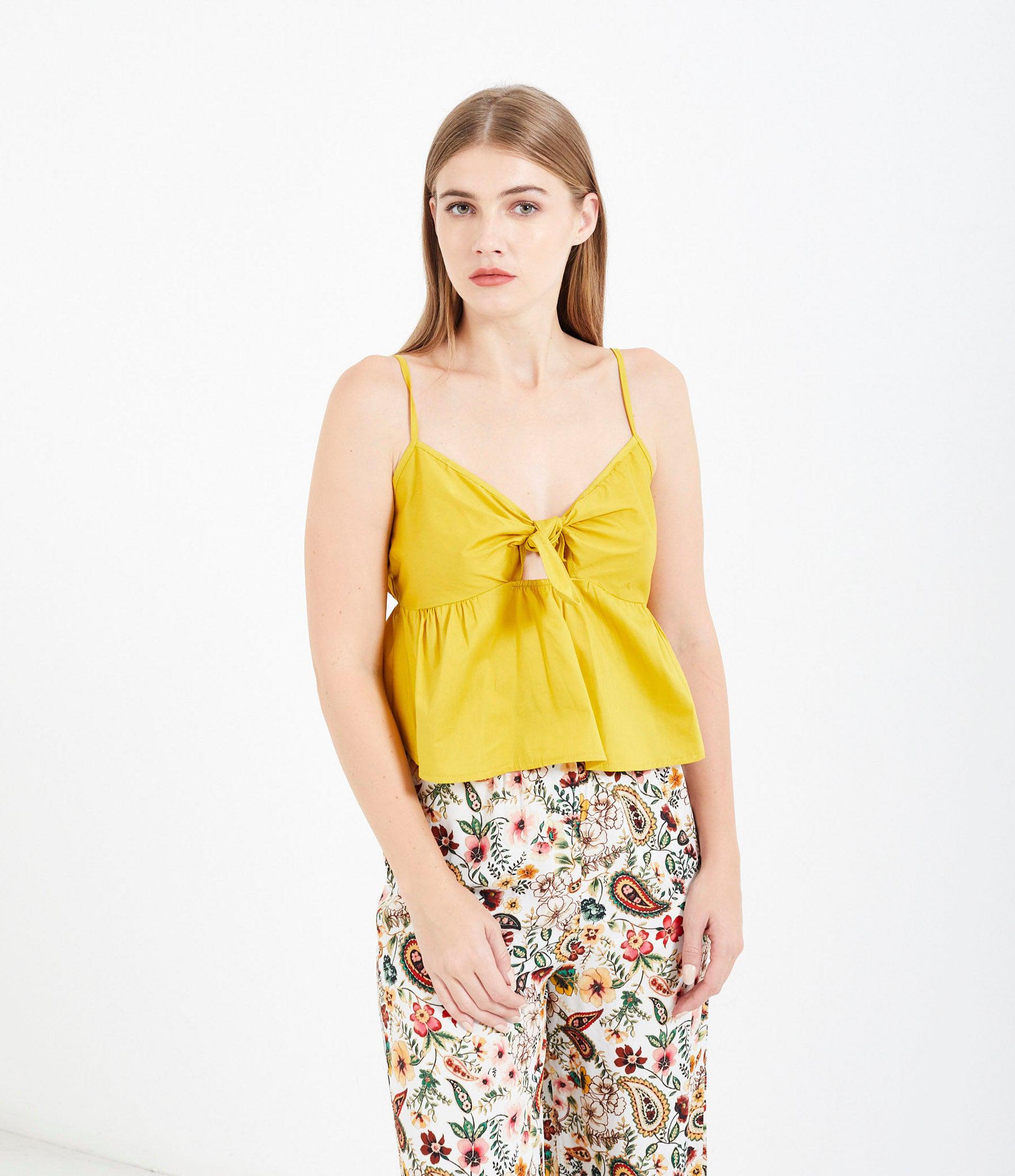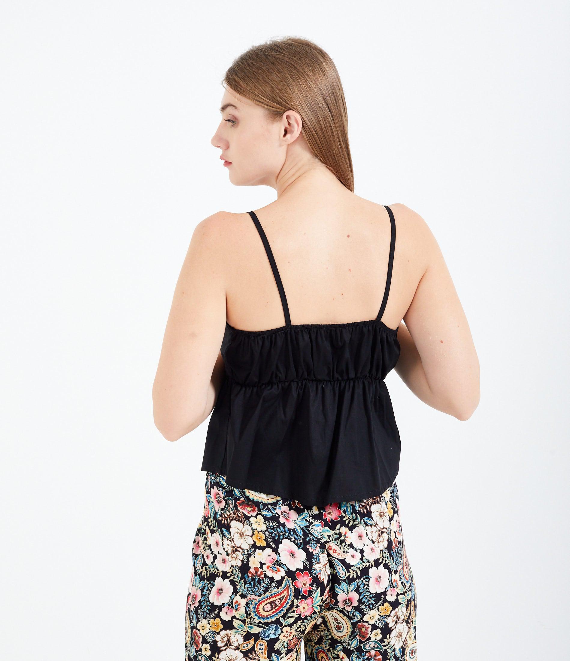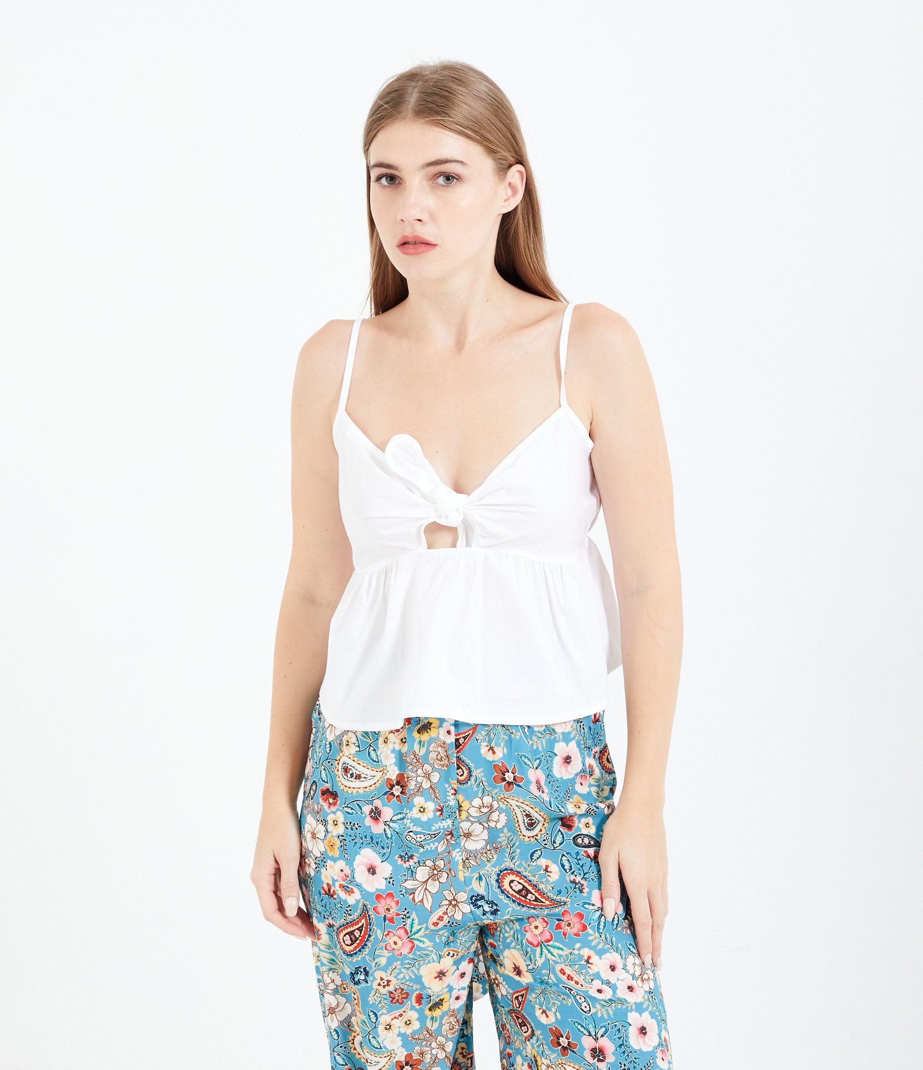 Top con ampio scollo fronte e retro, dettaglio fiocco frontale.