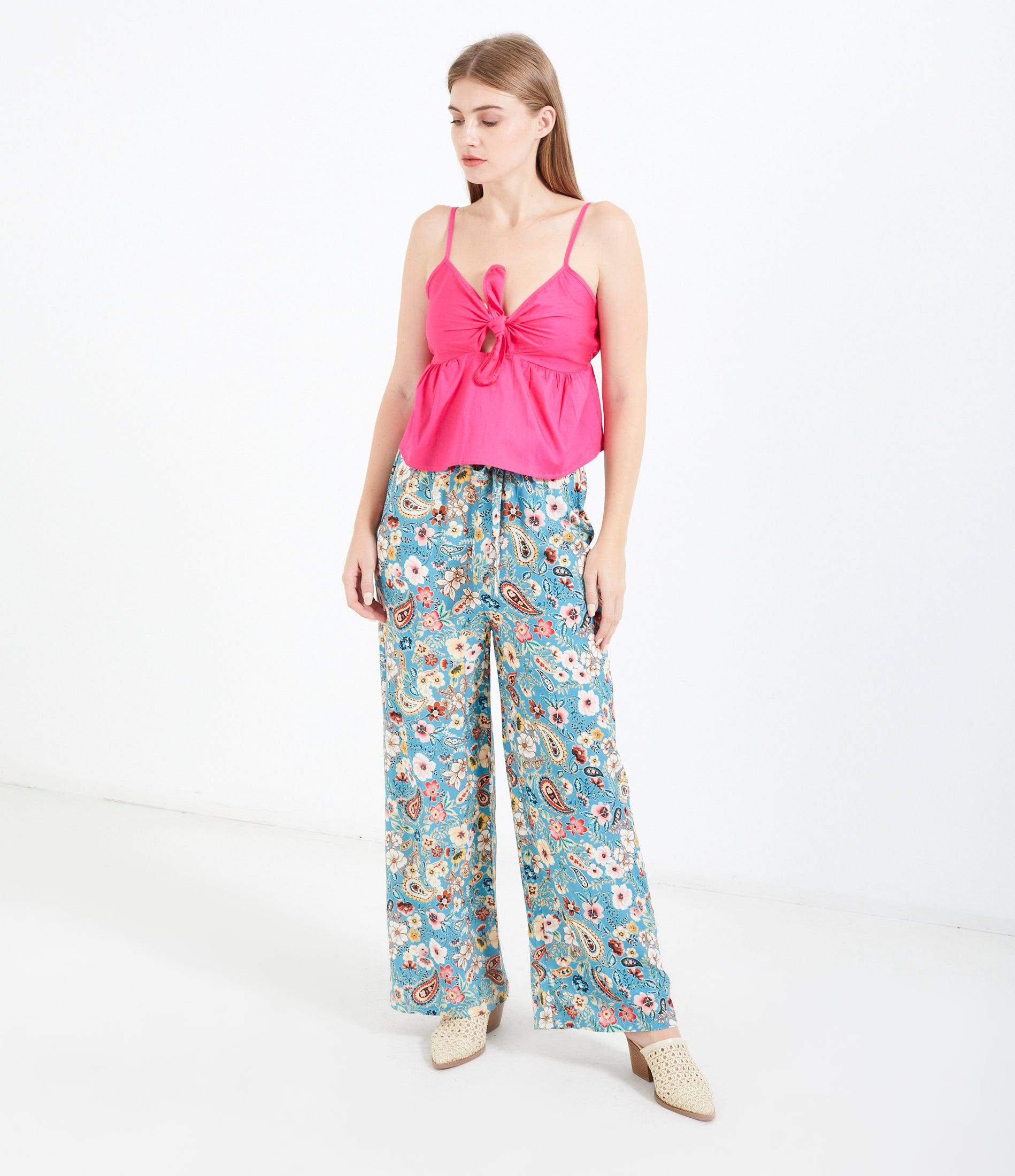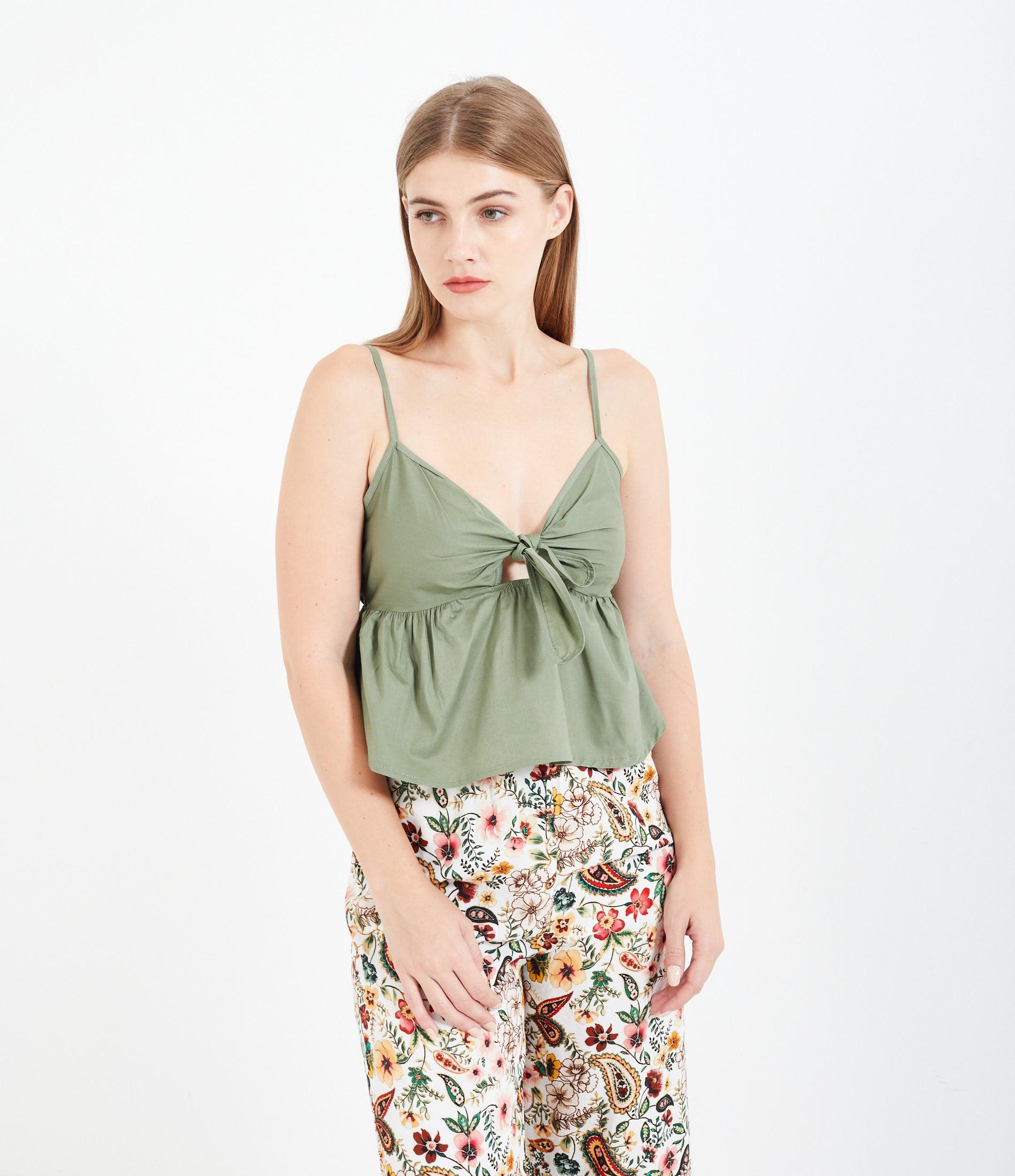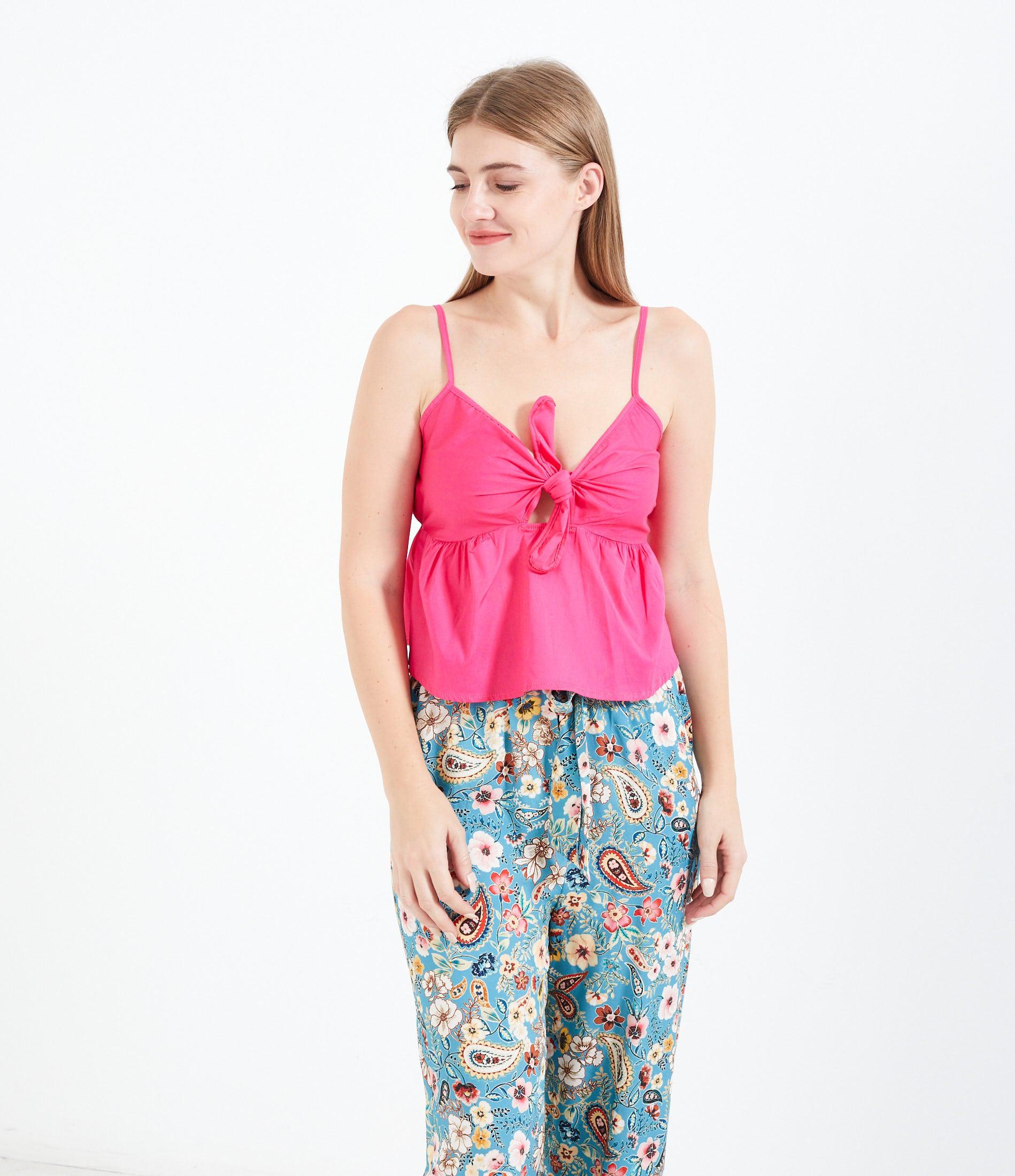 Top con ampio scollo fronte e retro, dettaglio fiocco frontale.