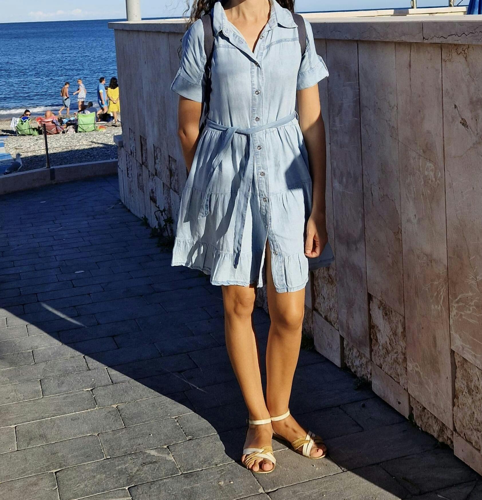 Abito modello chemisier regular fit, mezze maniche e chiusura con bottoni e cintura. Balza sul fondo.