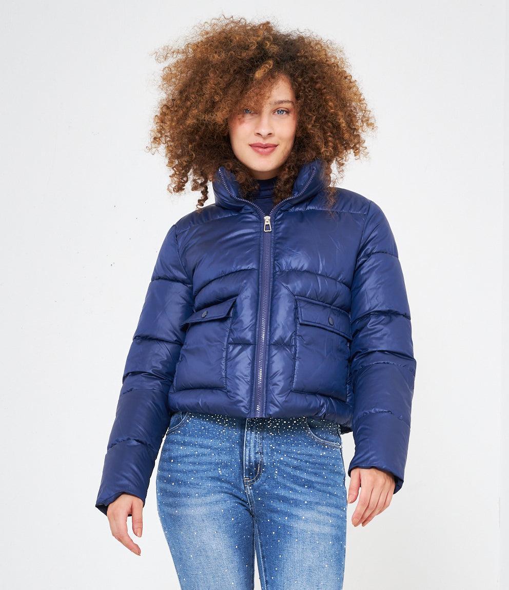 Piumino modello crop con tasche con patta e chiusura con zip.