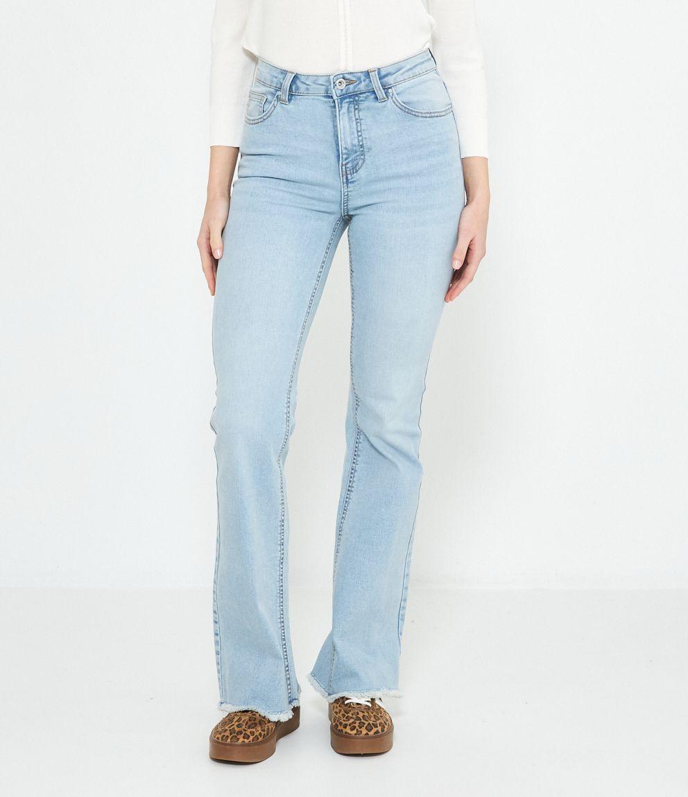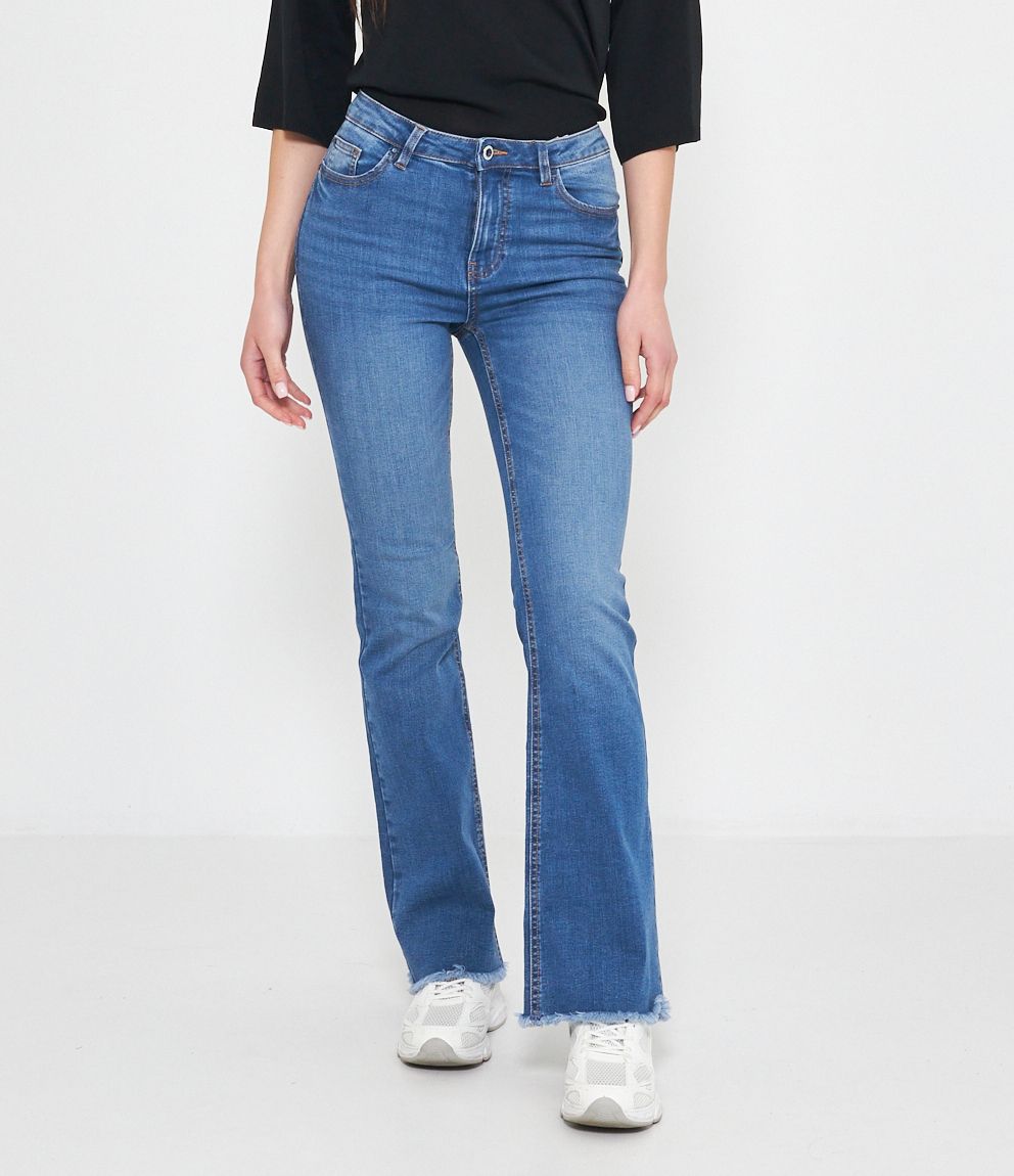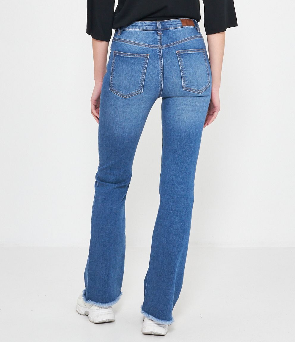 Jeans modello flare con fondo sfrangiato.
