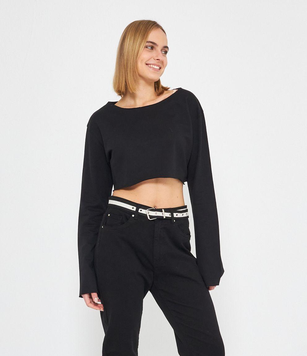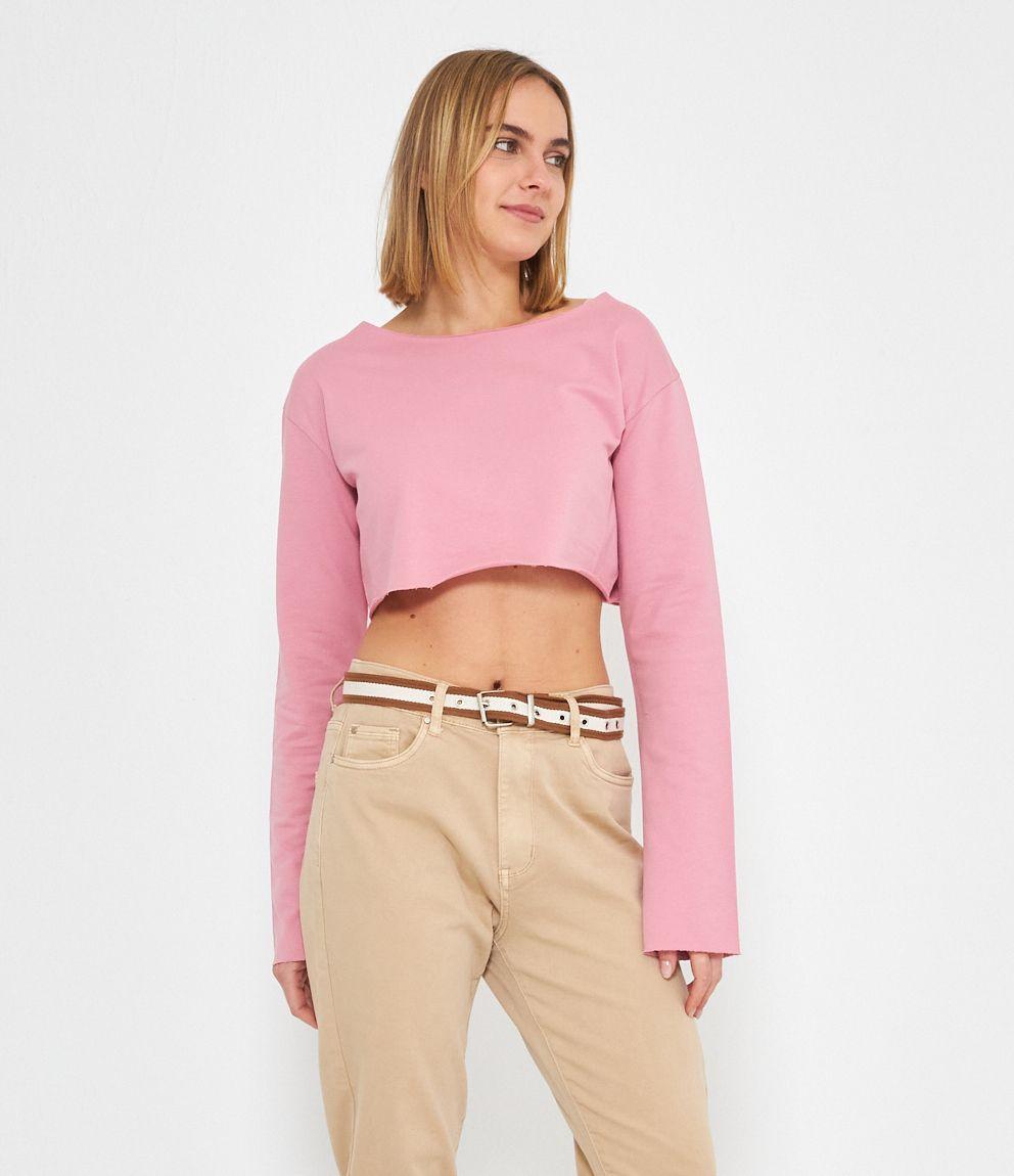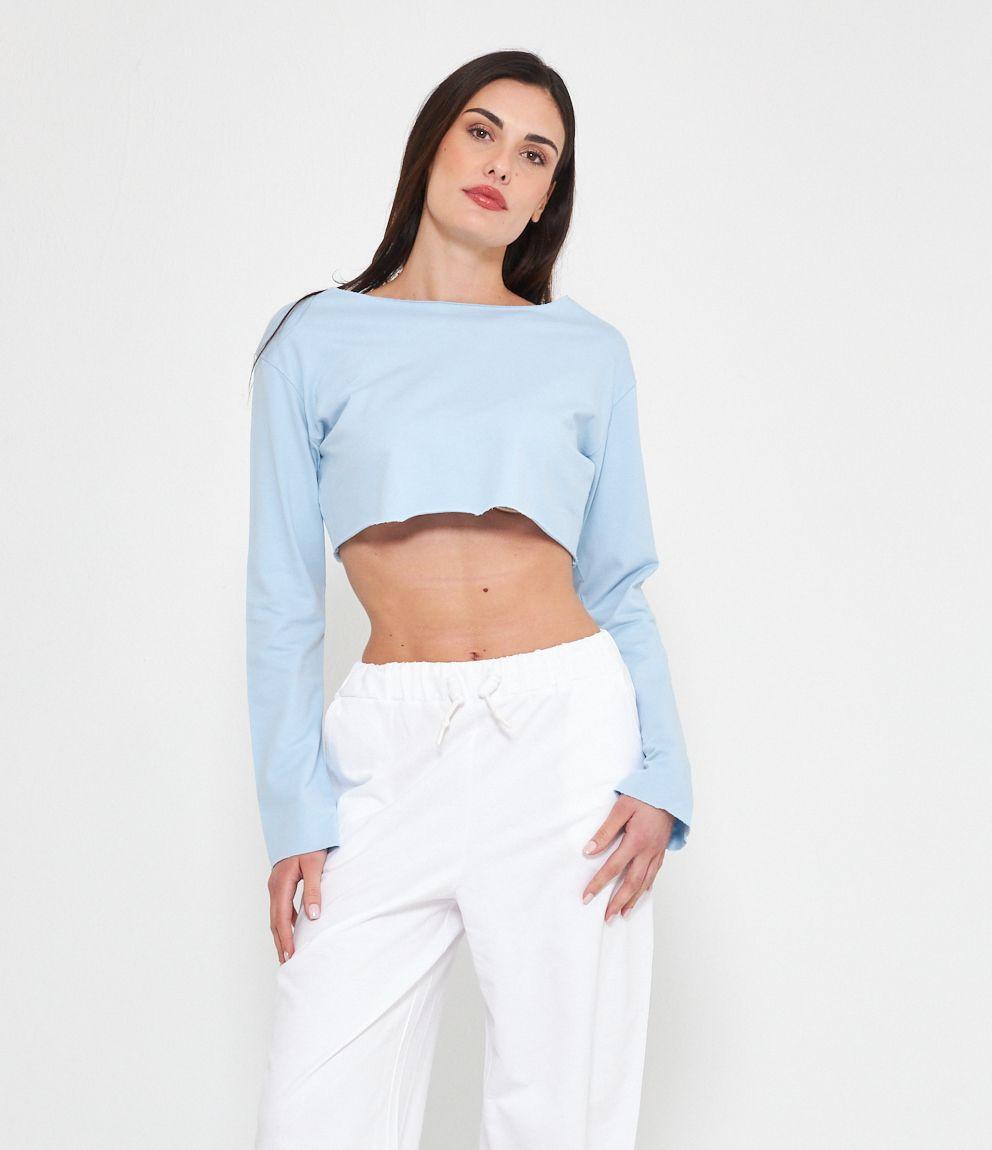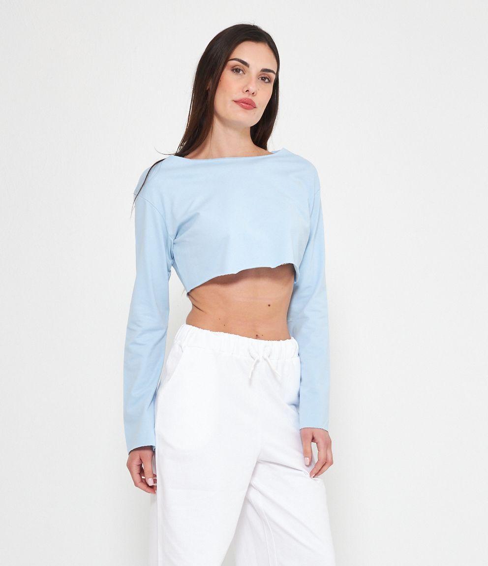 Felpa modello crop a taglio vivo e scollo tondo.