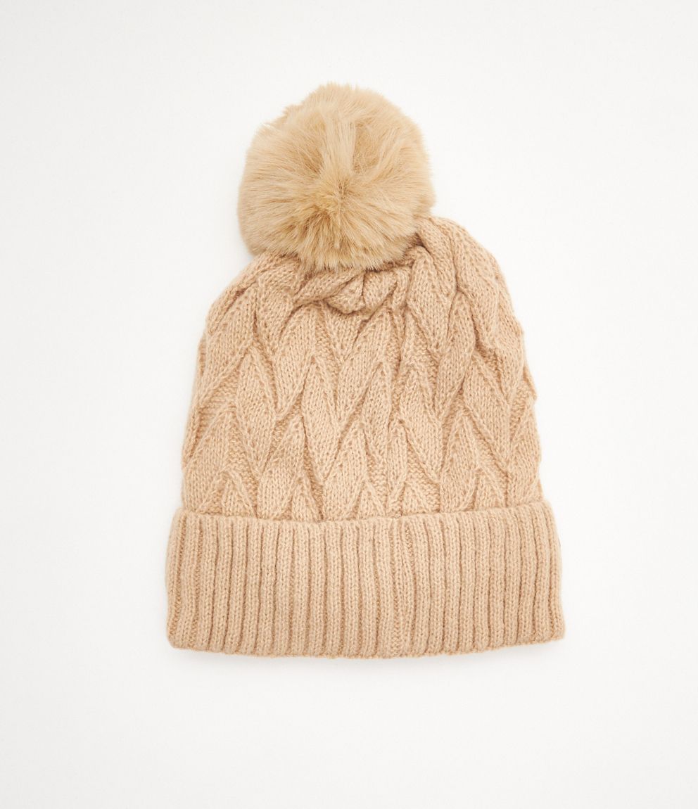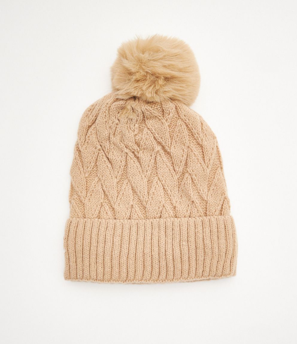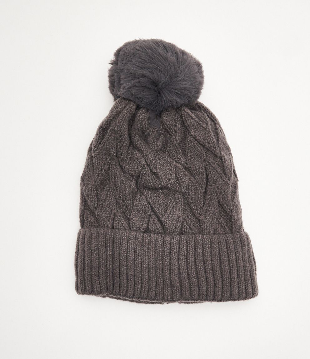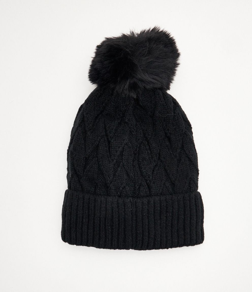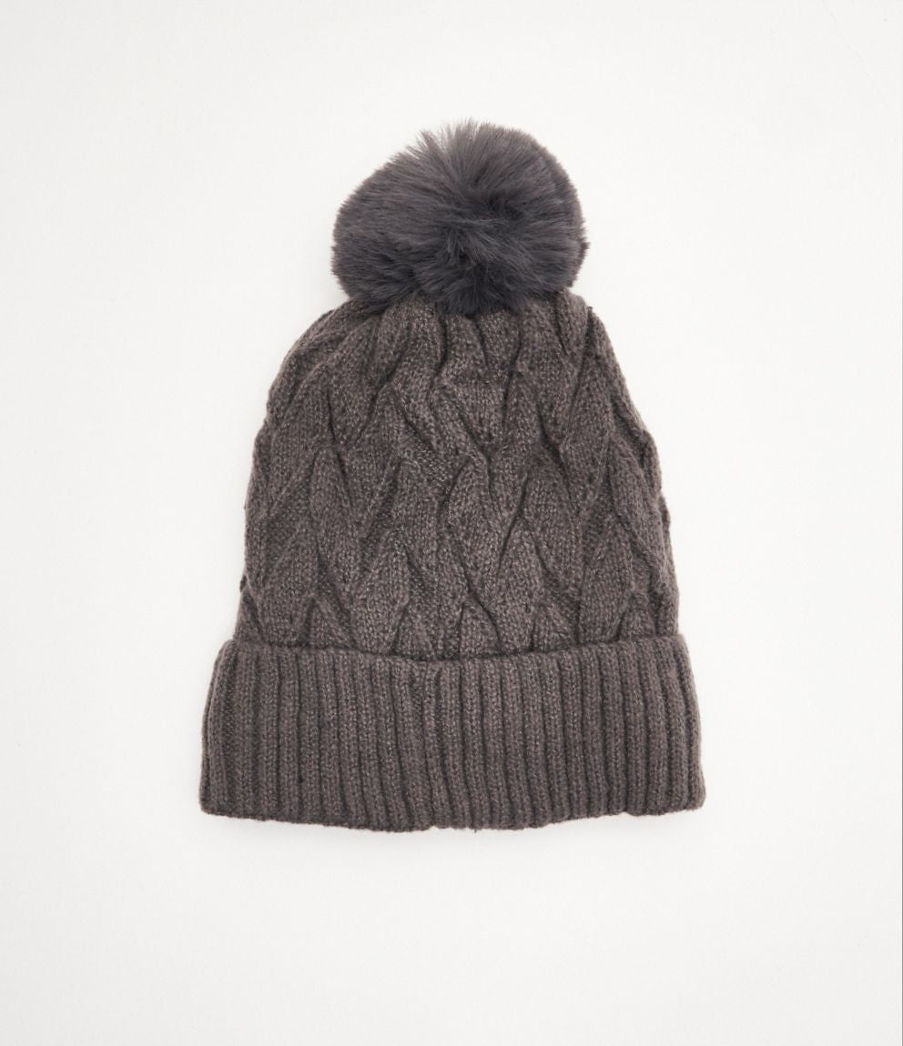 Cappello in maglia a trecce con pon pon e risvolto a costine.
