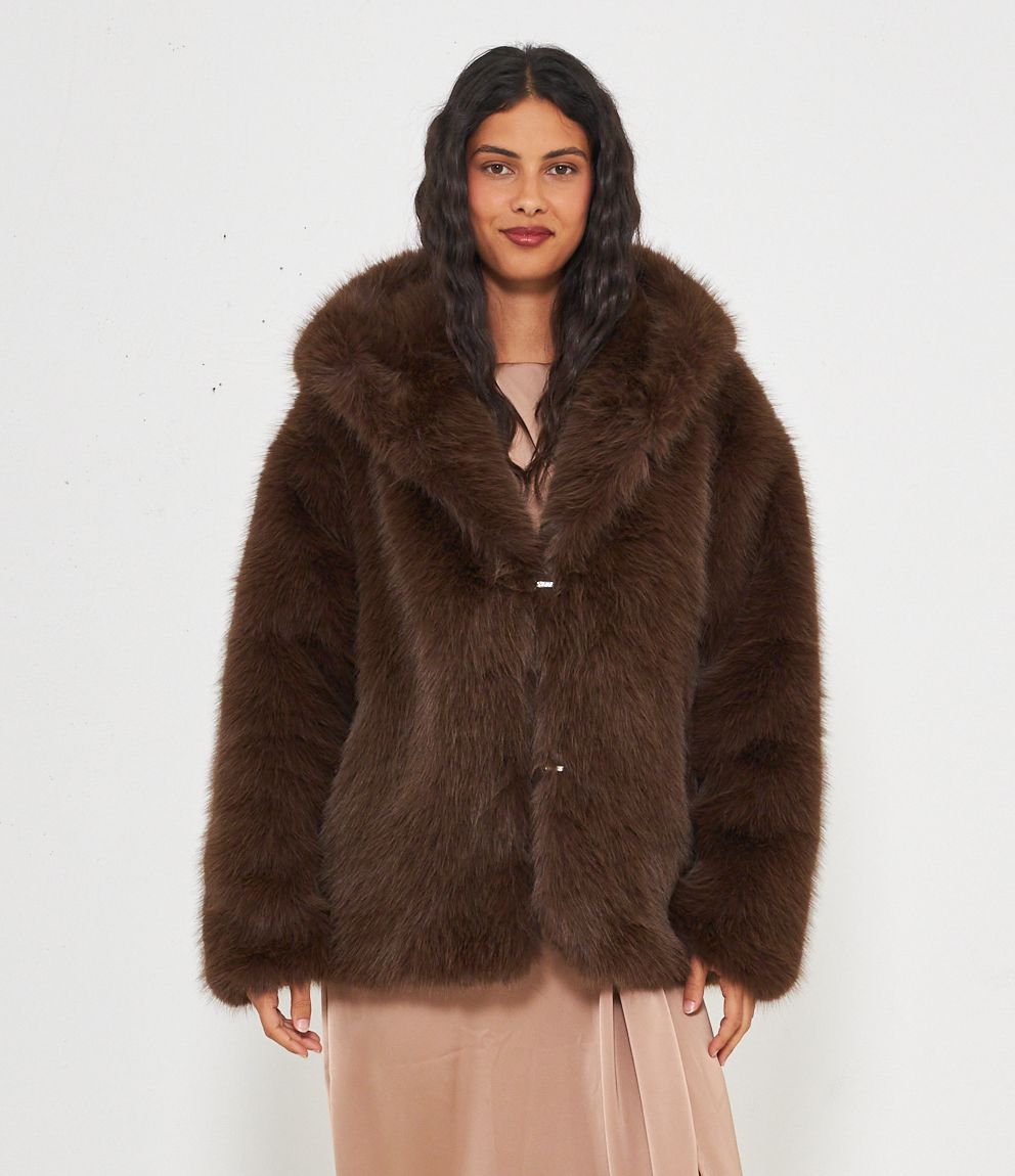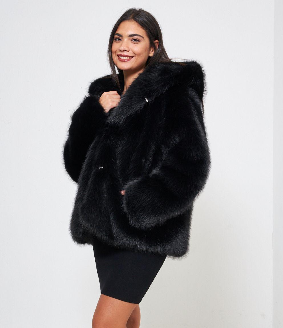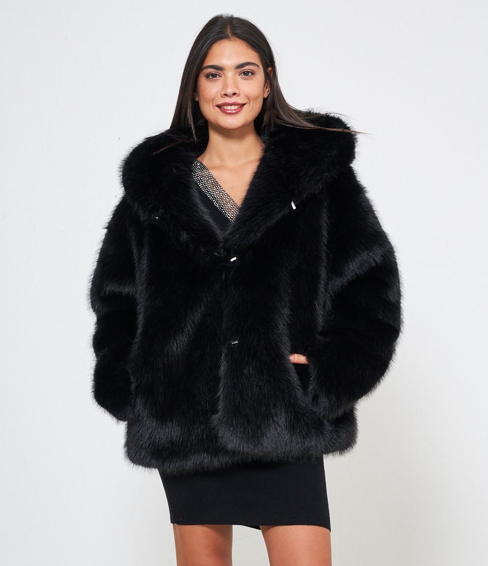 Pelliccia modello over con cappuccio e chiusura con ganci gioiello.