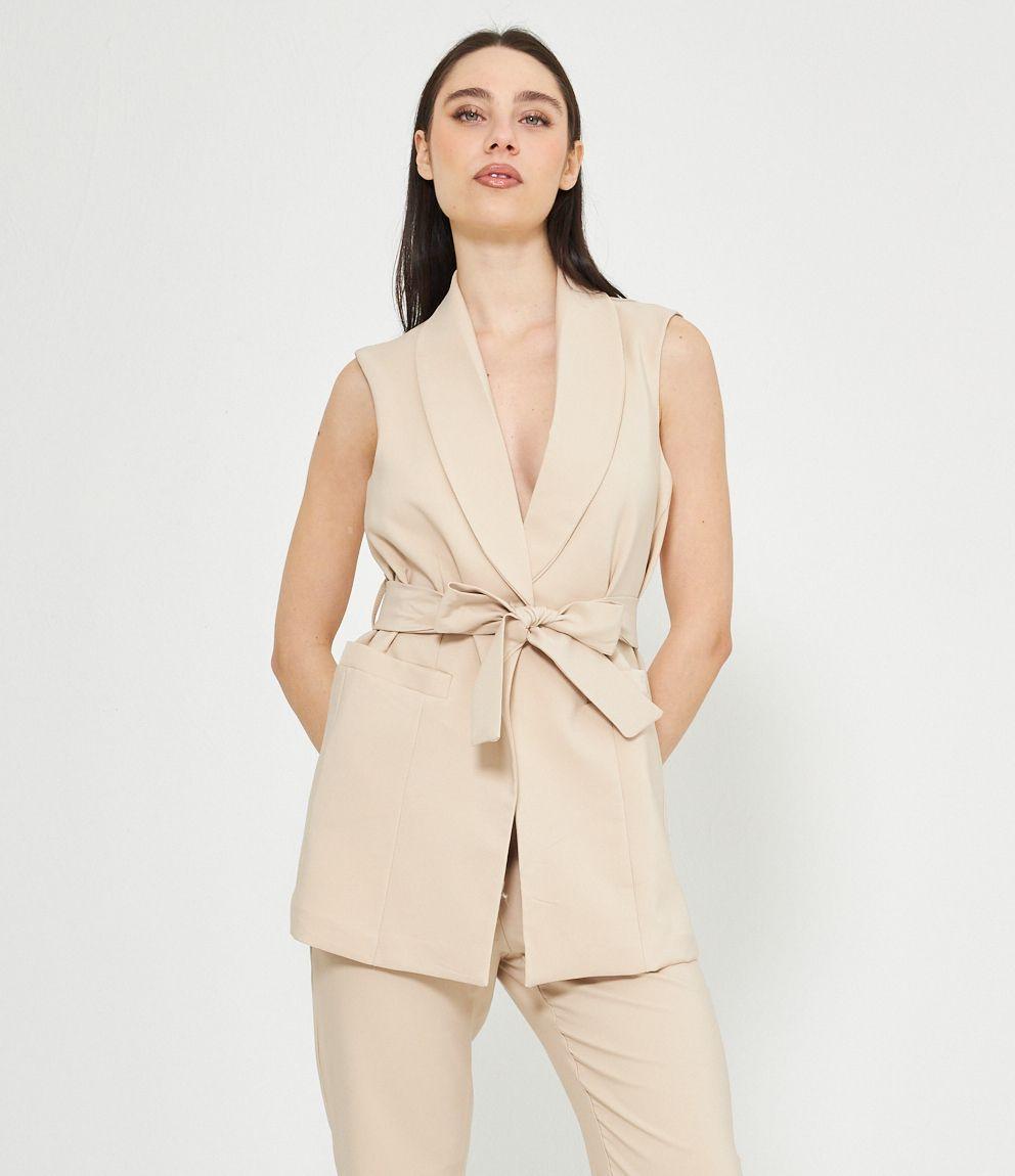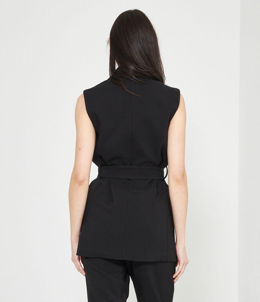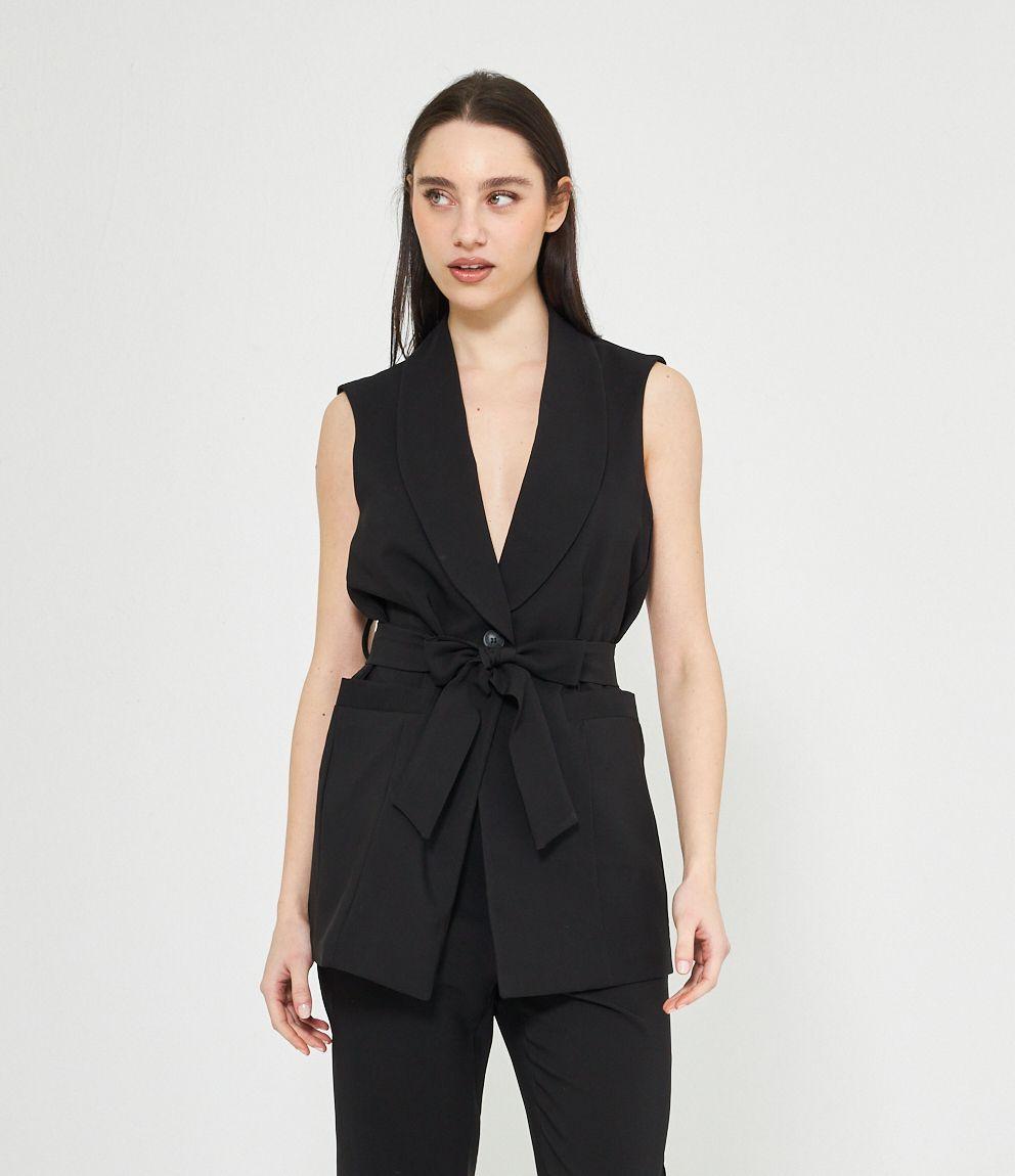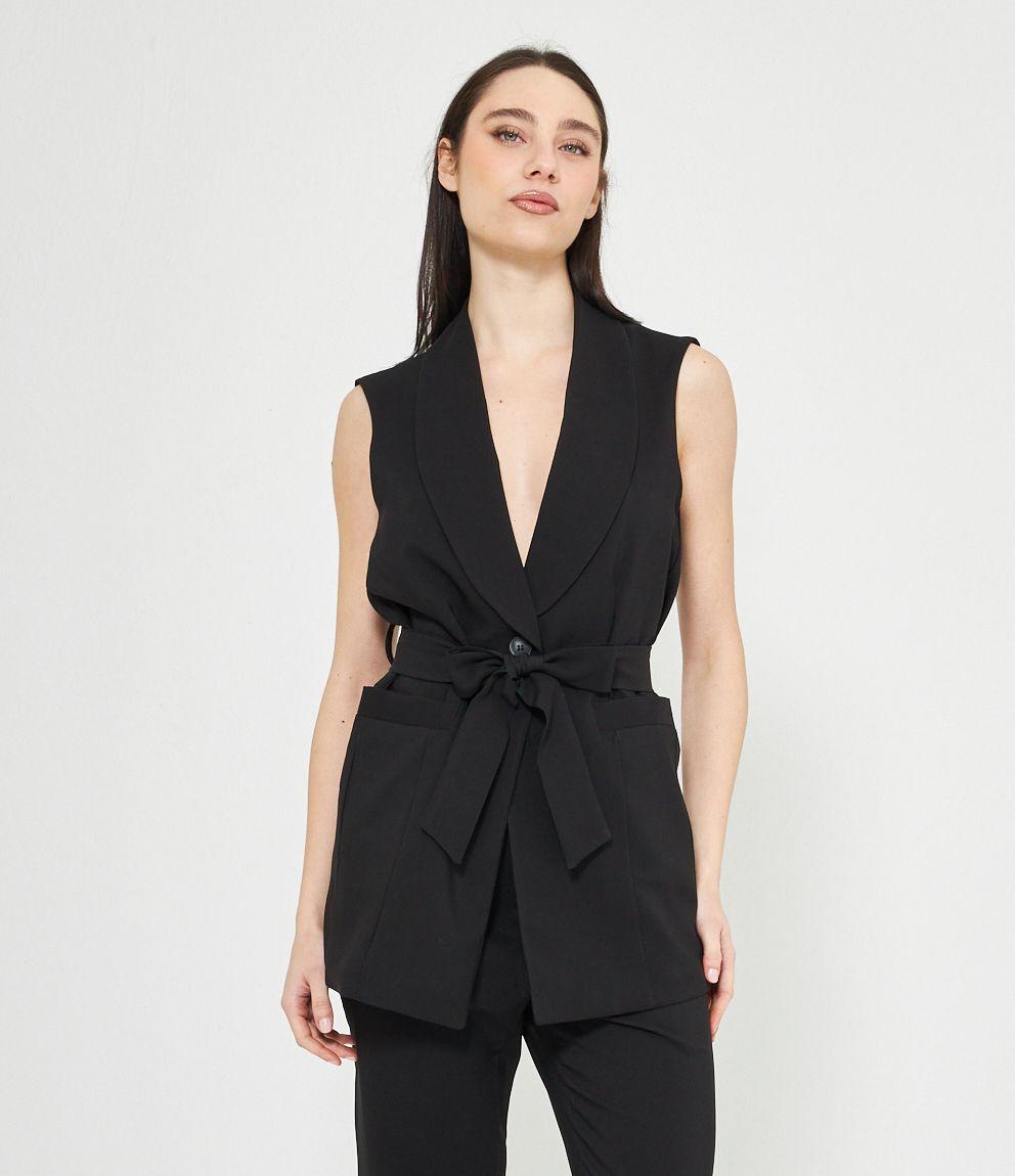 Gilet con scollo profondo, collo revers e chiusura con bottone. Cintura in vita.