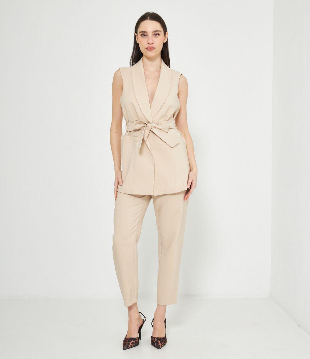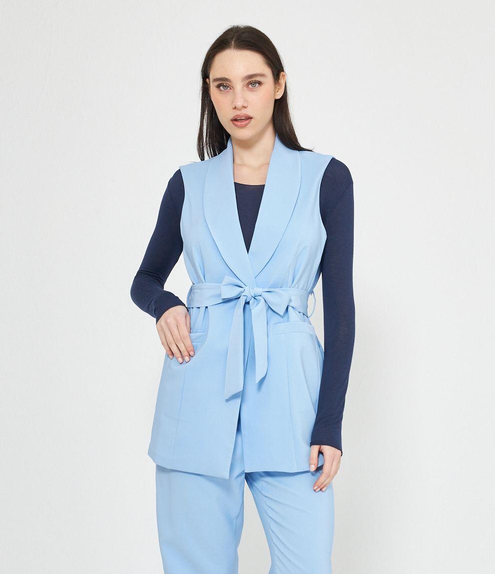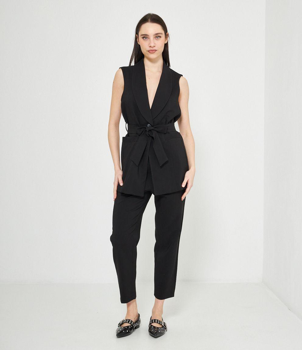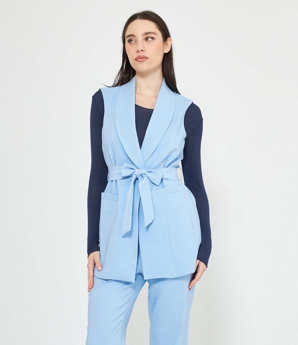 Gilet con scollo profondo, collo revers e chiusura con bottone. Cintura in vita.