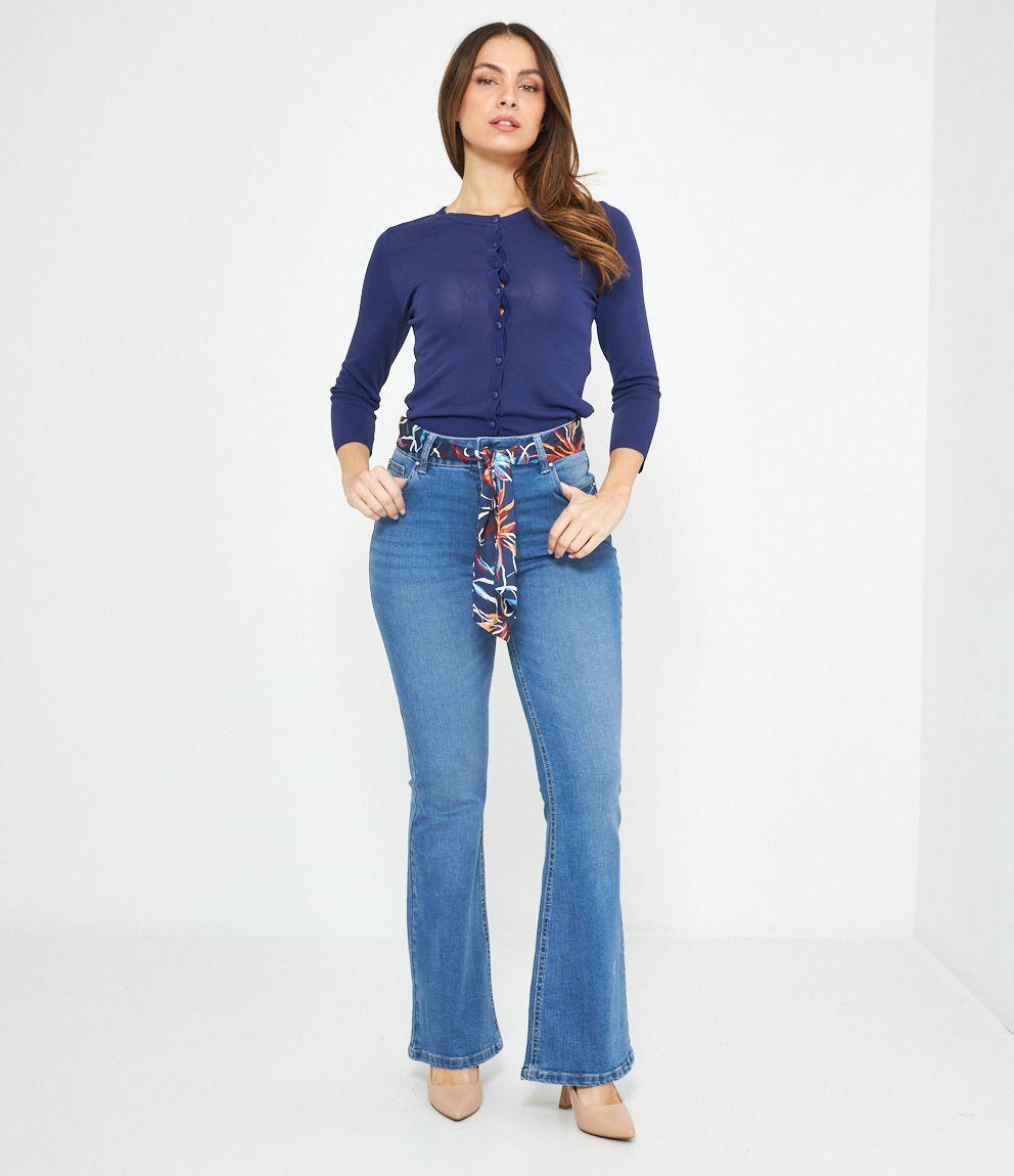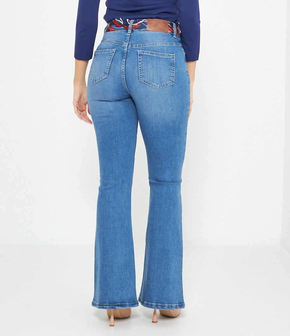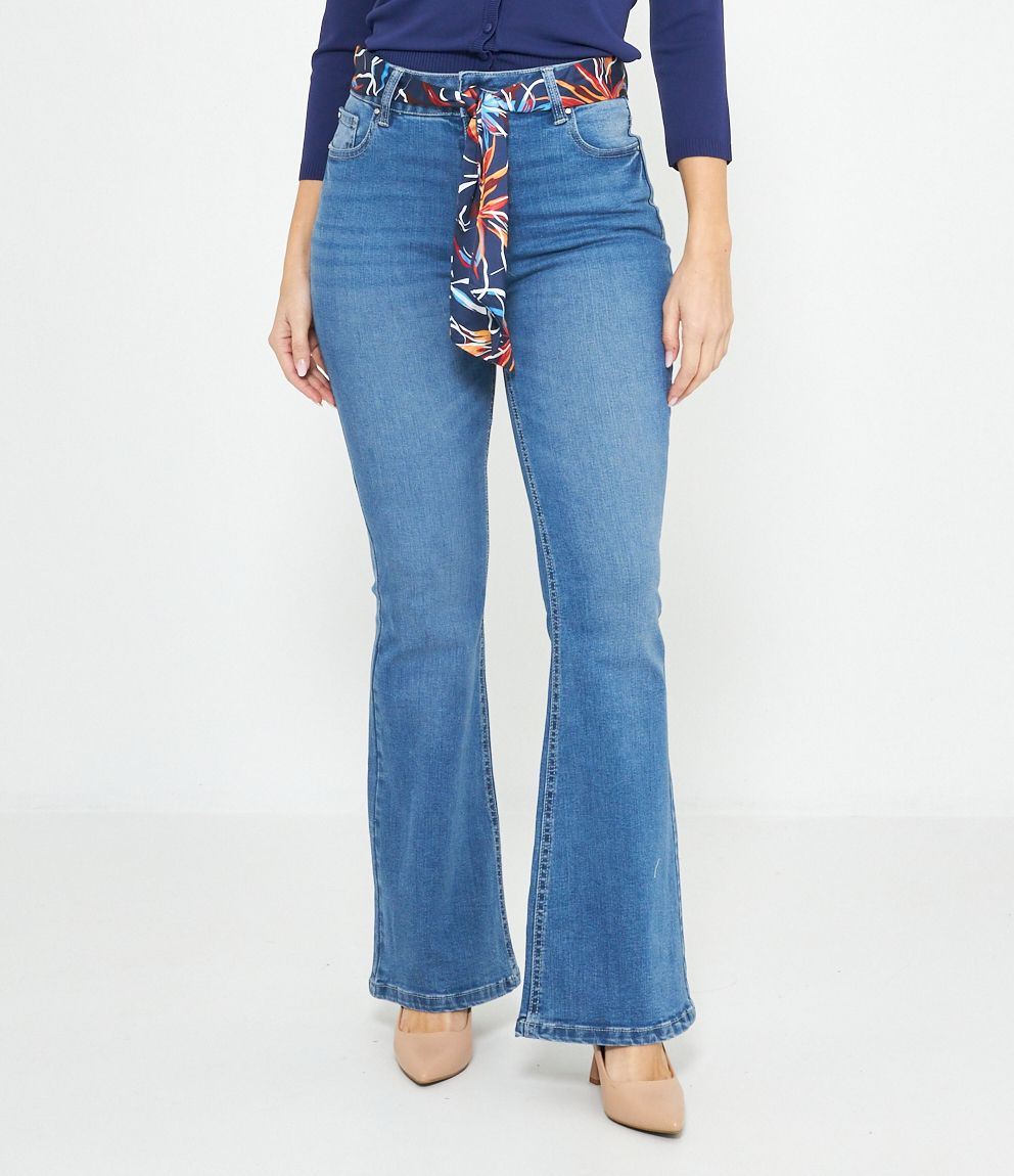 Jeans modello flare con foulard, cinque tasche e chiusura con zip e bottone.
