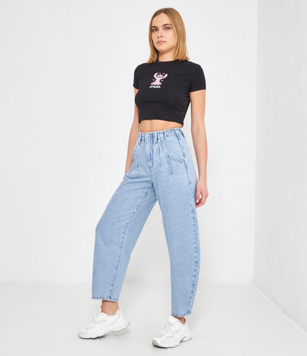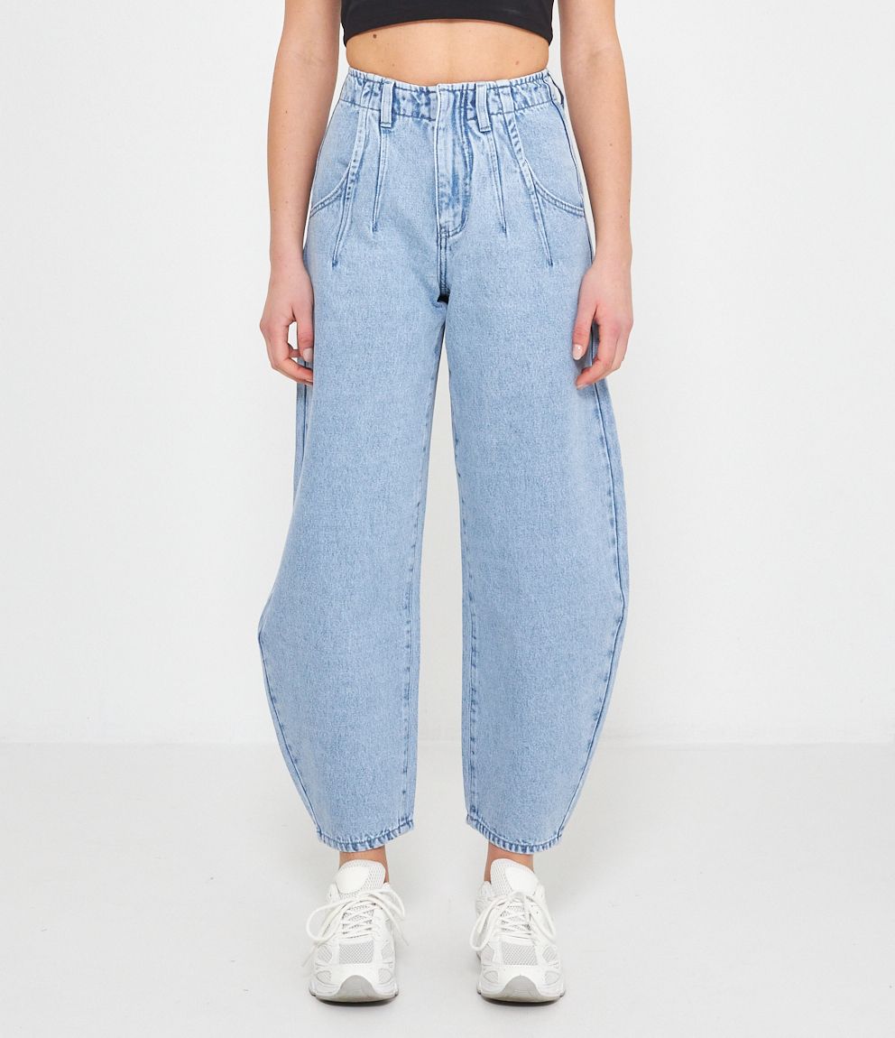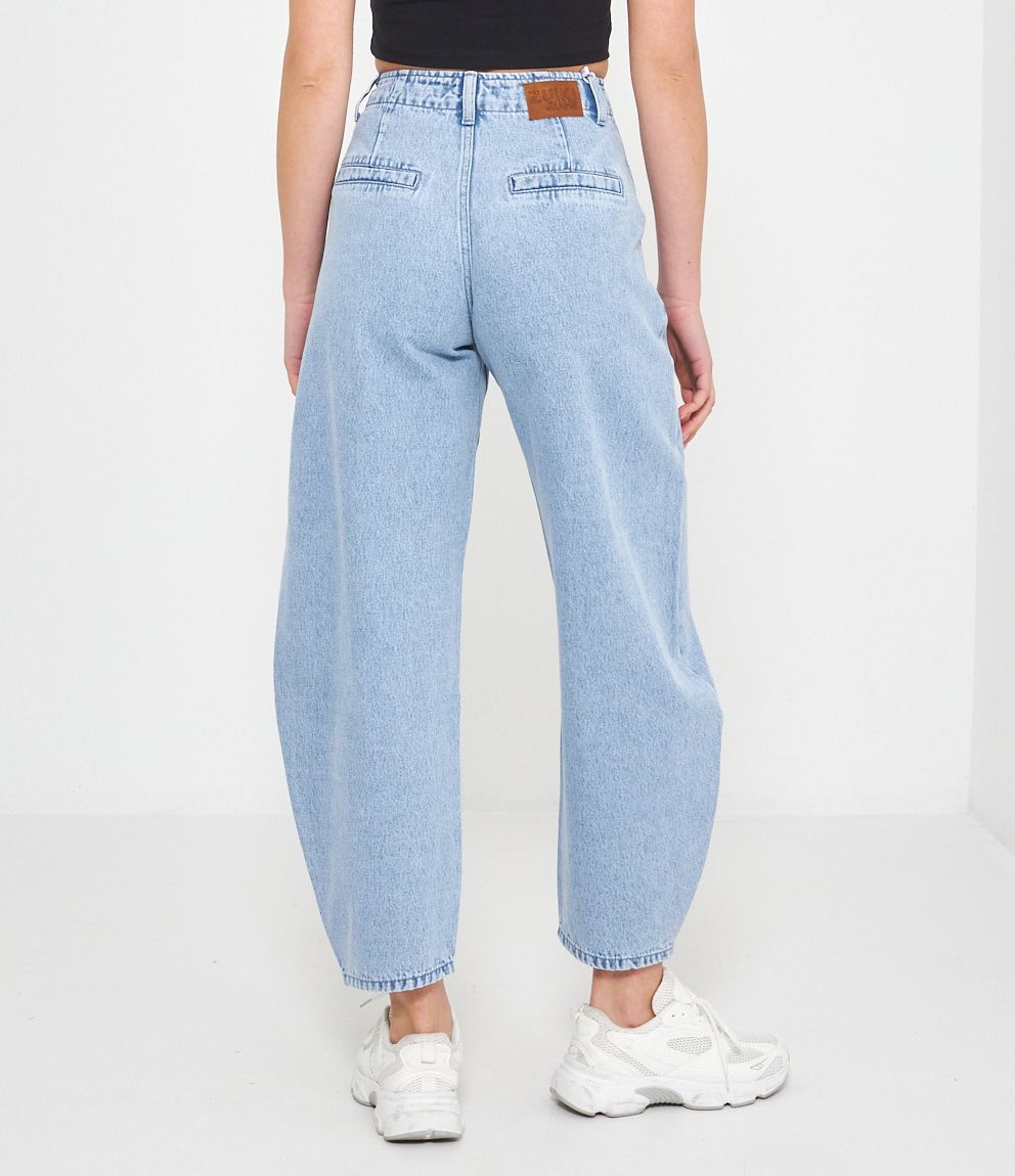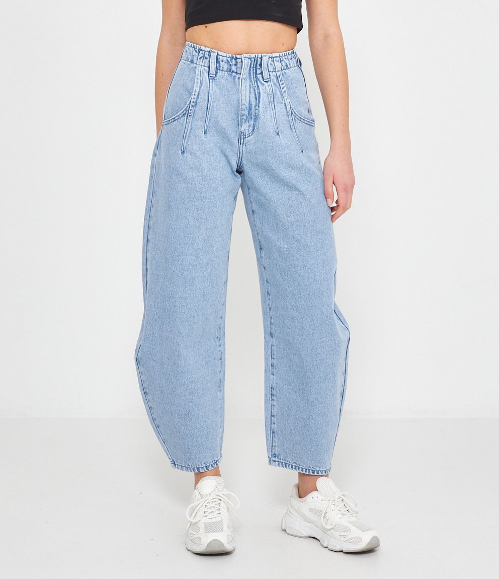 Jeans modello balloon con cuciture frontali, tasche laterali e e chiusura con zip.
