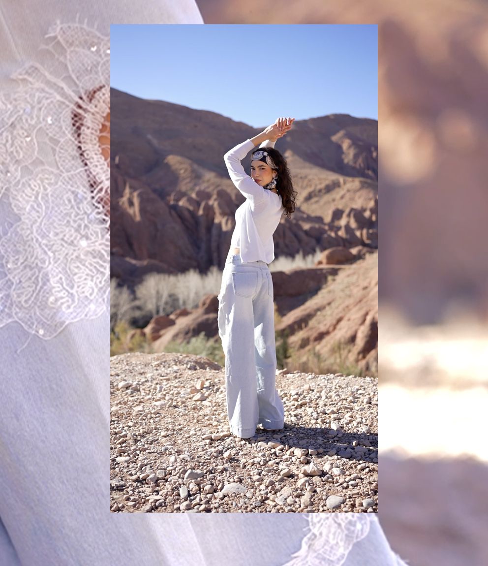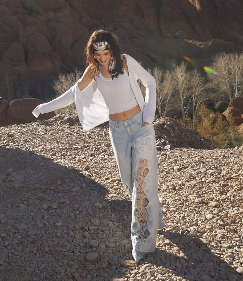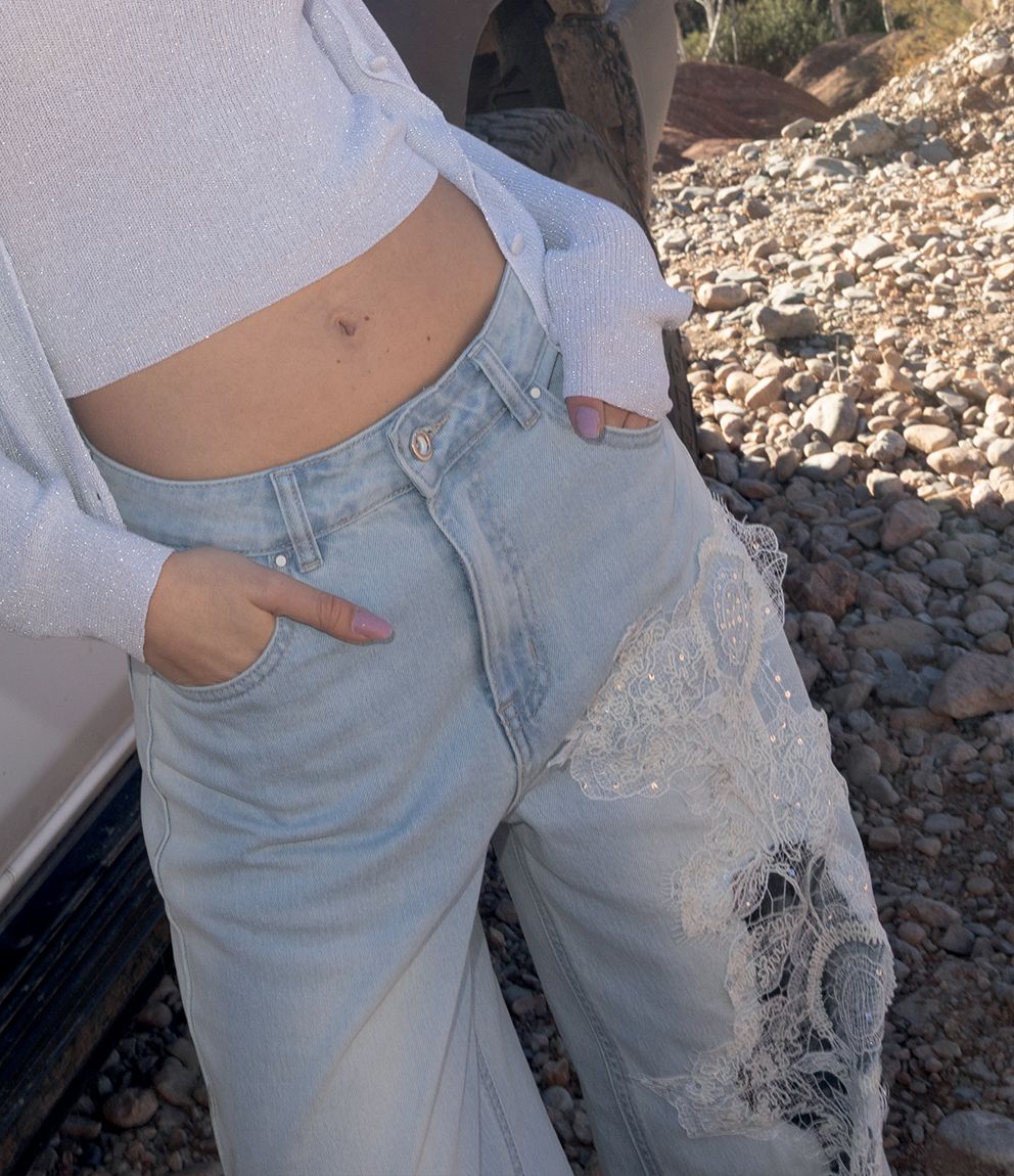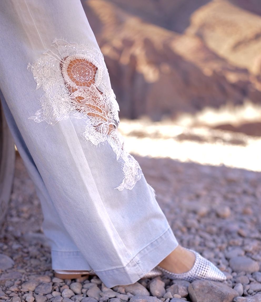Jeans modello palazzo con ricami e trasparenze. Cinque tasche e chiusura con zip e bottone.