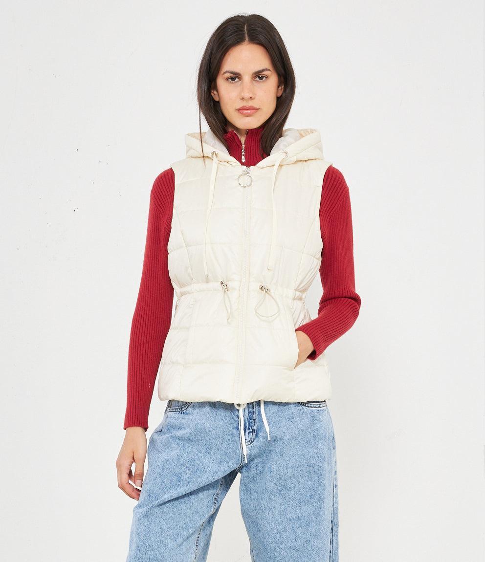 Piumino gilet con cappuccio, coulisse in vita regolabile e chiusura centrale con zip.