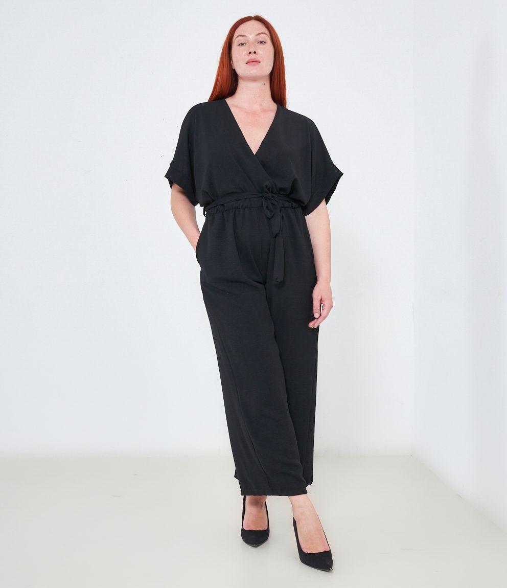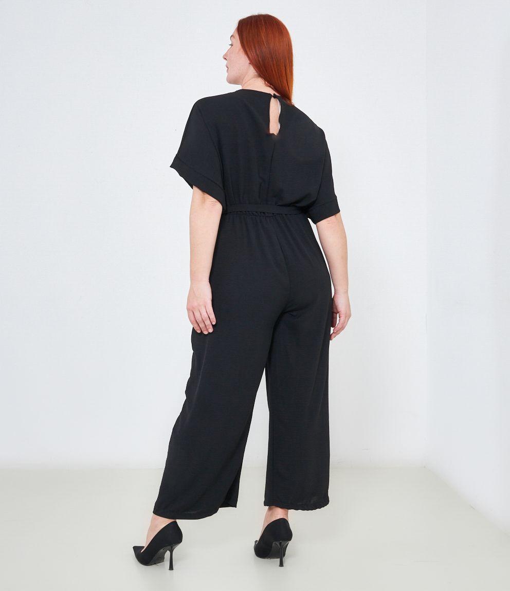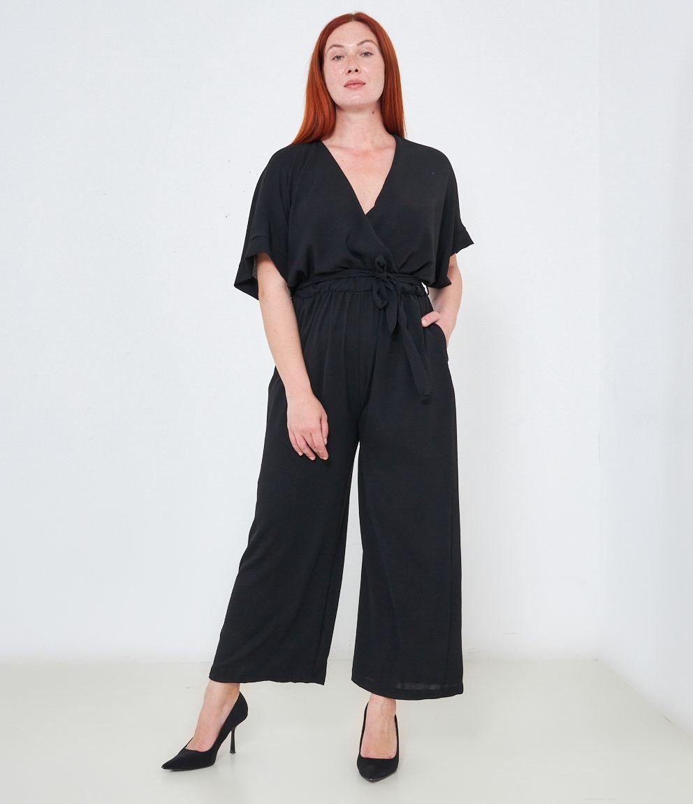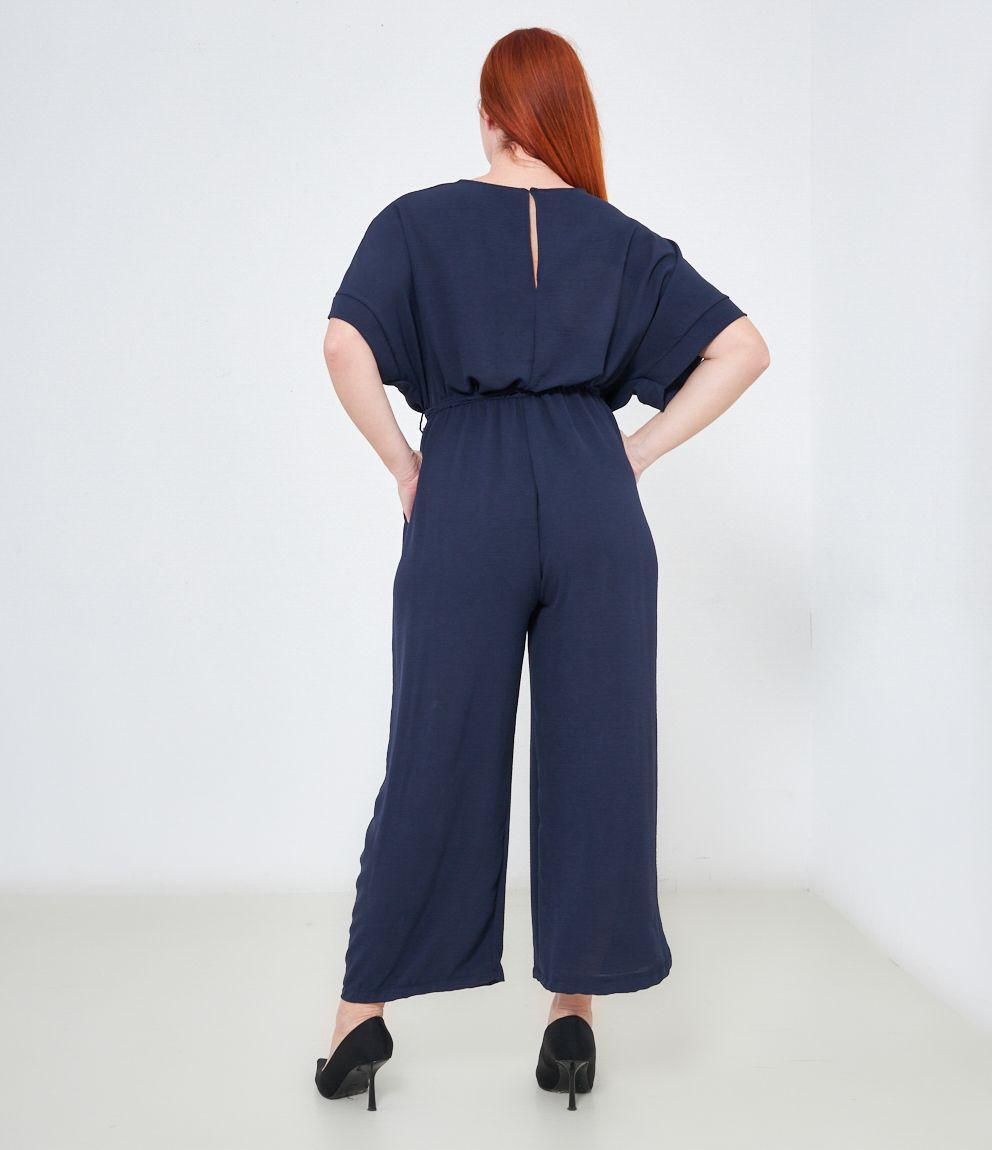 Tuta con pantaloni palazzo, scollo a V e tasche laterali, mezze maniche e chiusura sul retro con bottone.