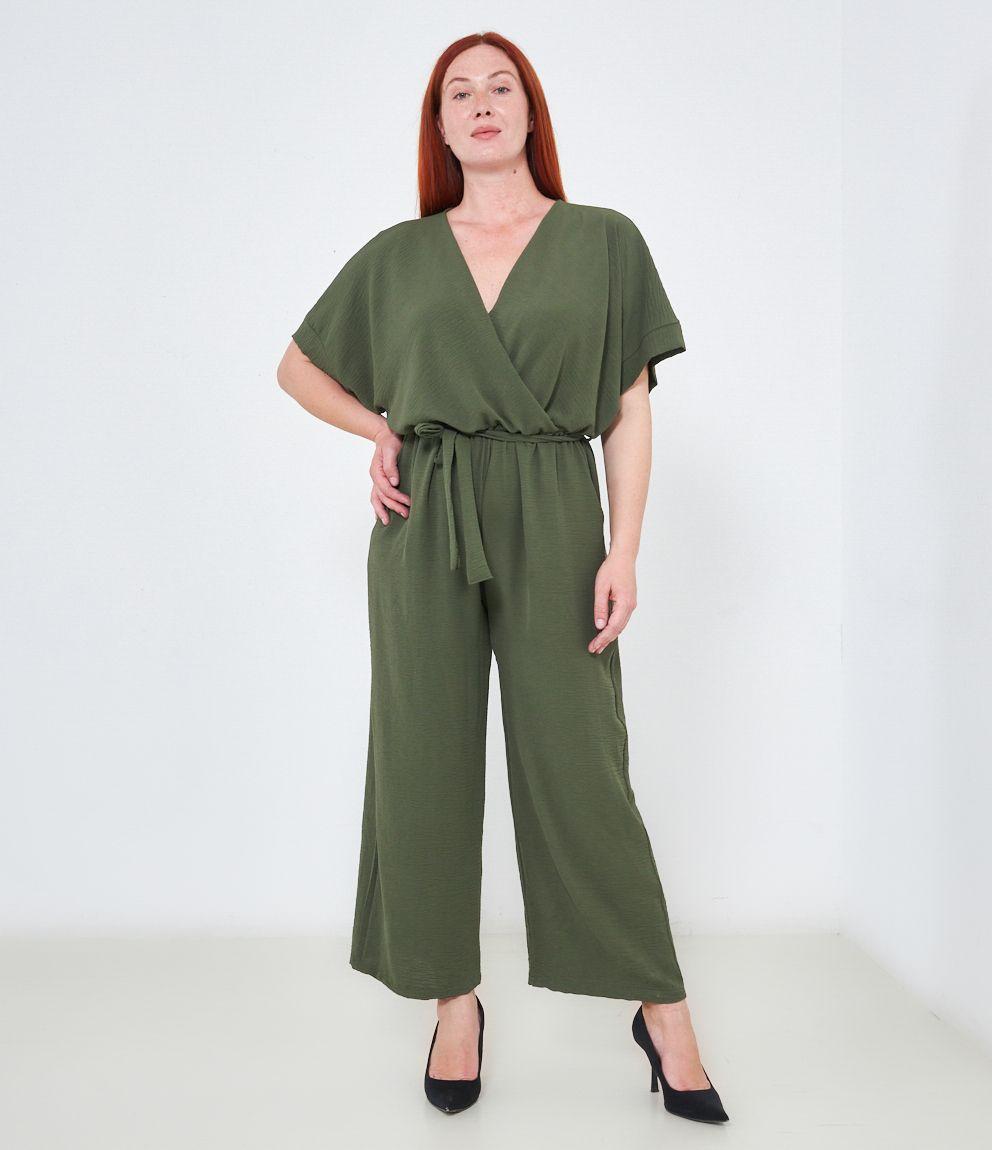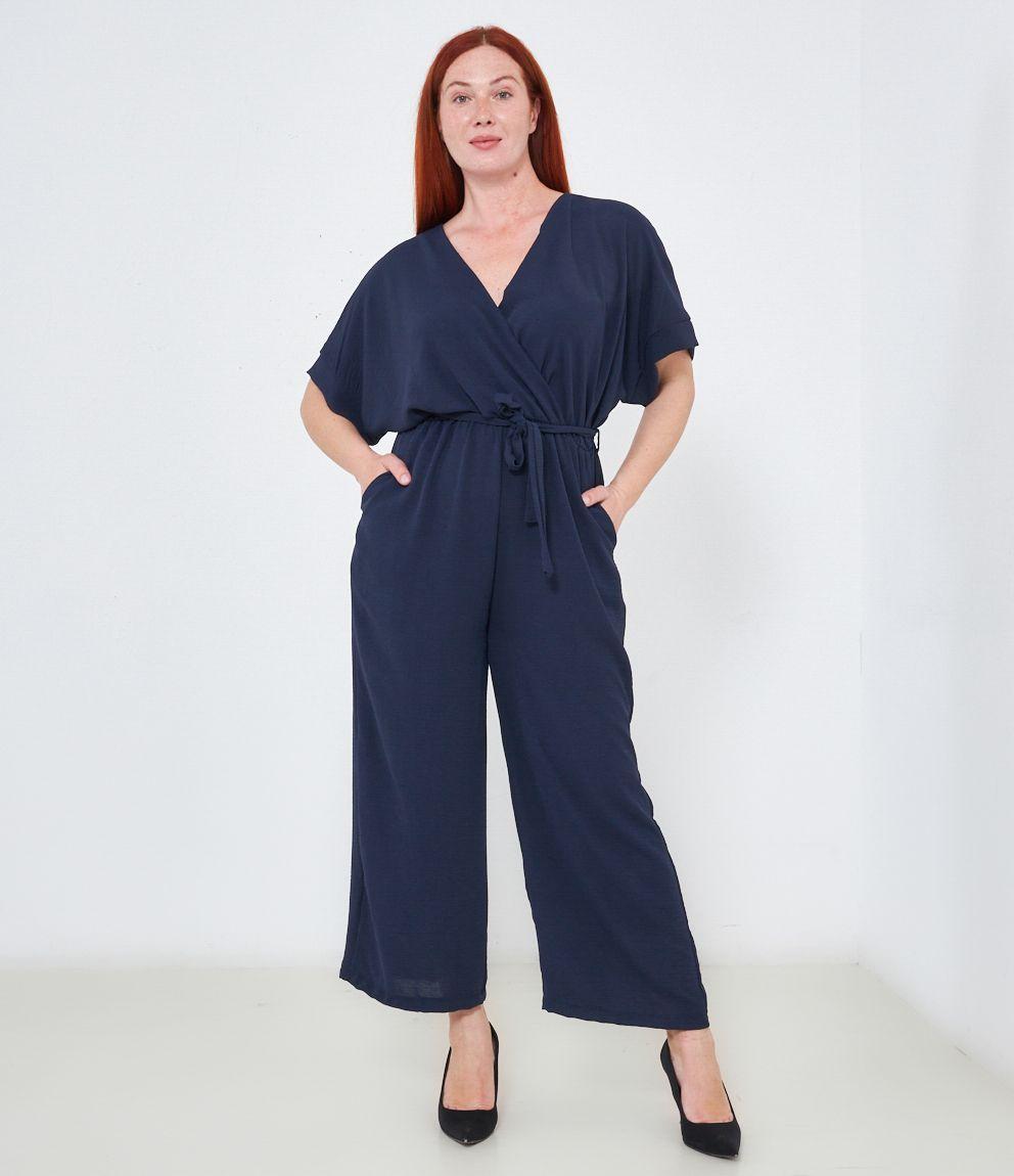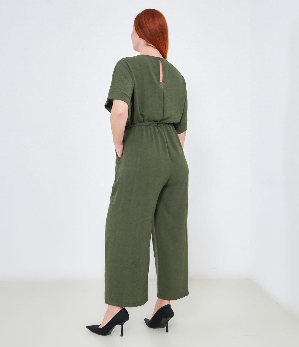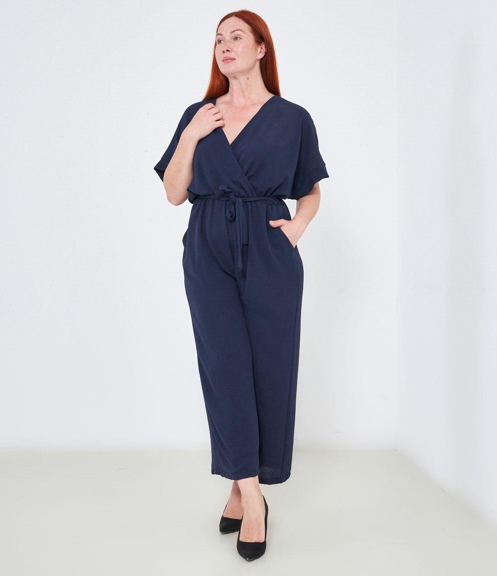 Tuta con pantaloni palazzo, scollo a V e tasche laterali, mezze maniche e chiusura sul retro con bottone.