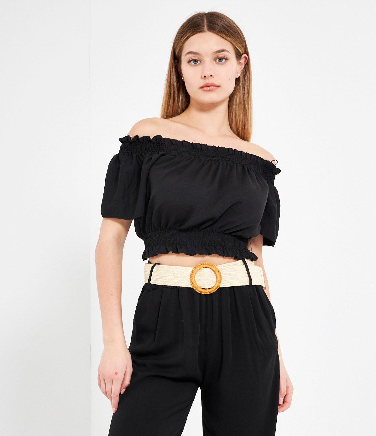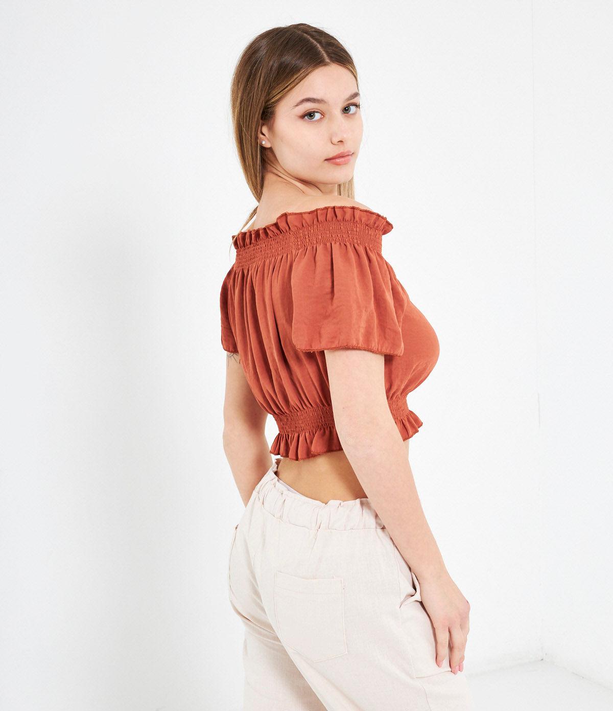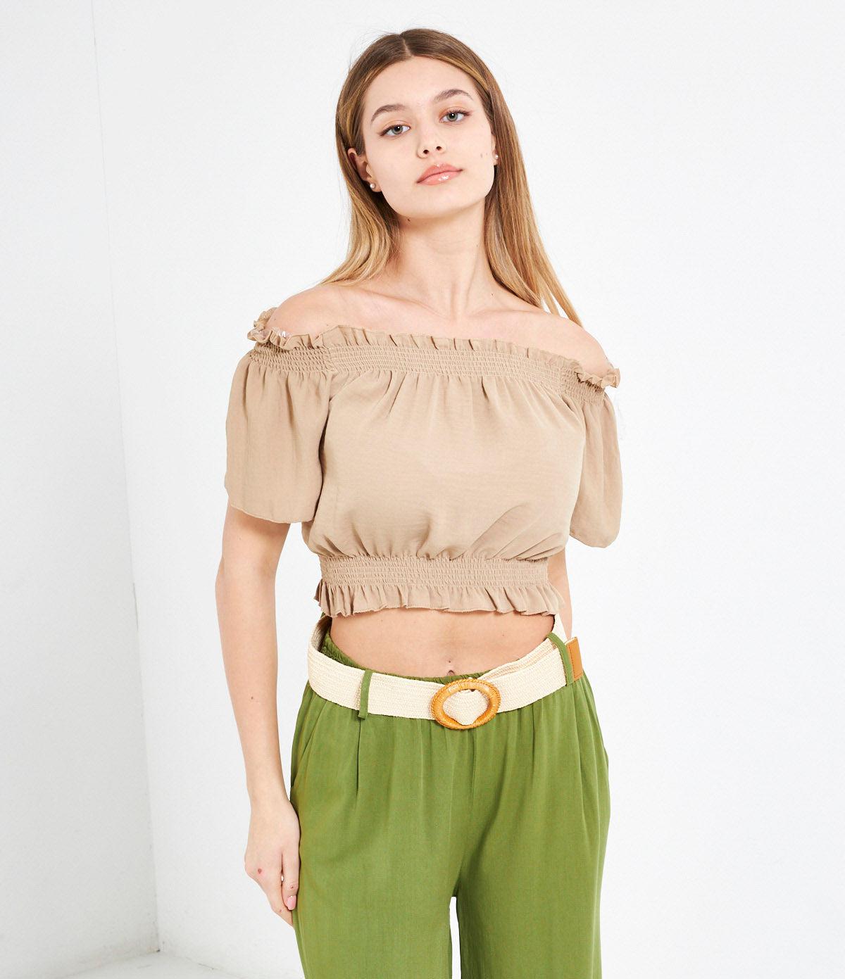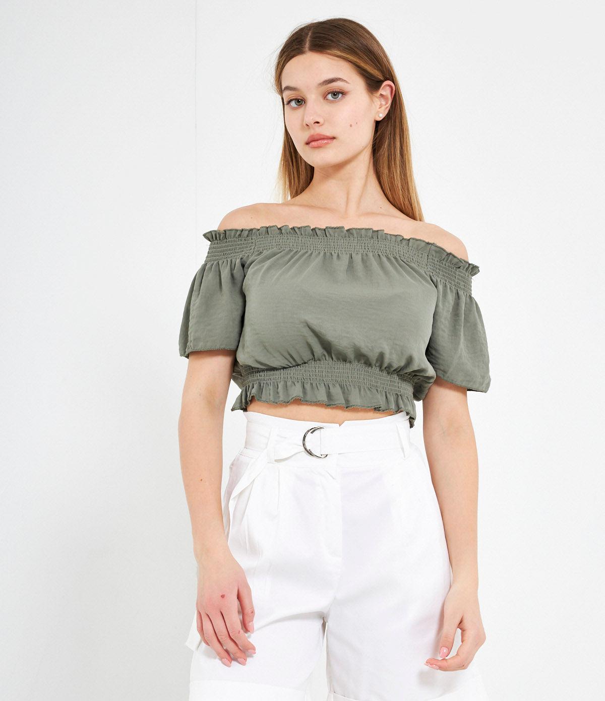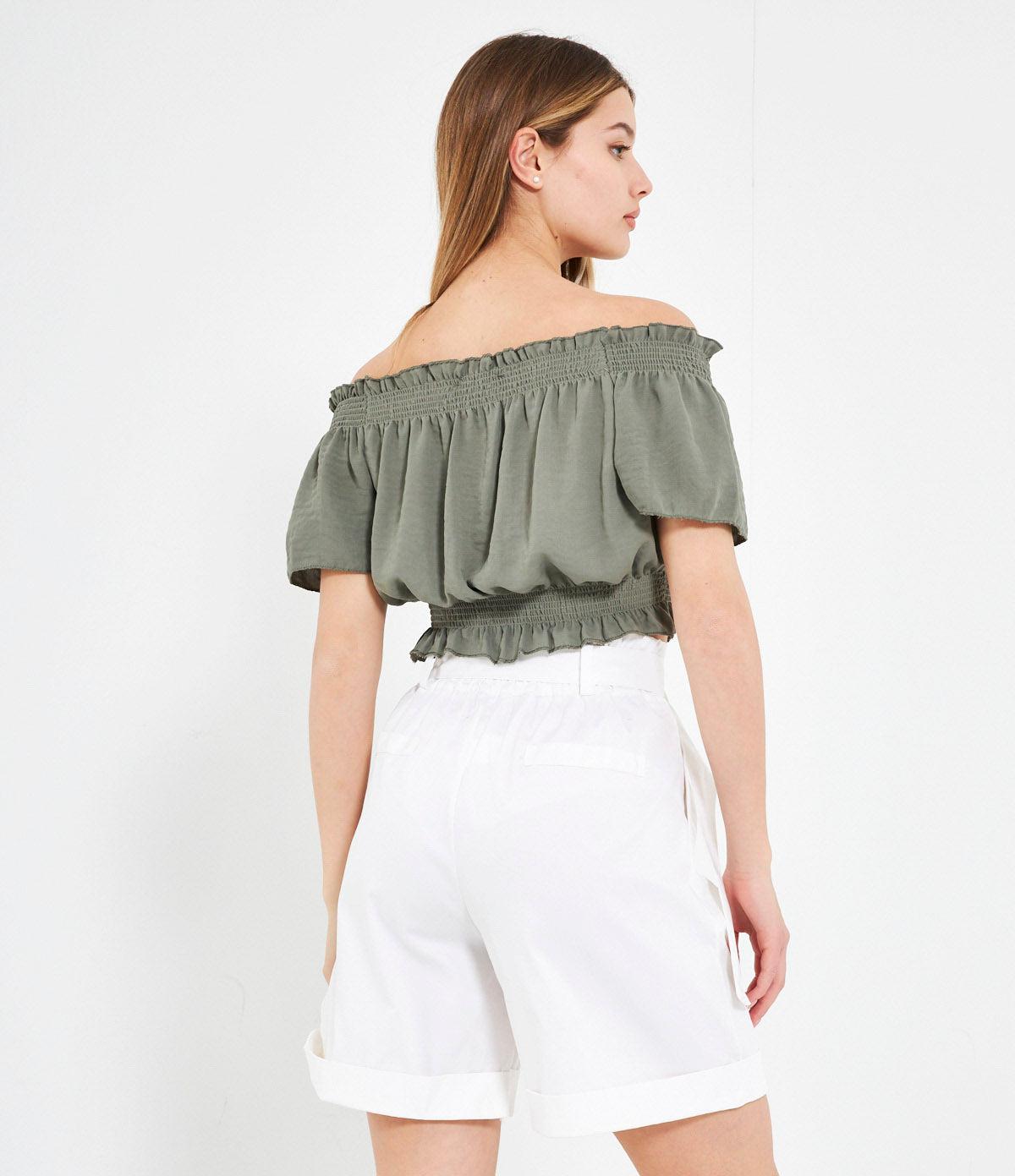 Casacca crop con spalle scoperte e punto smock con rouches.
