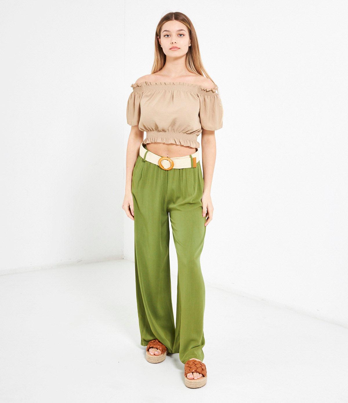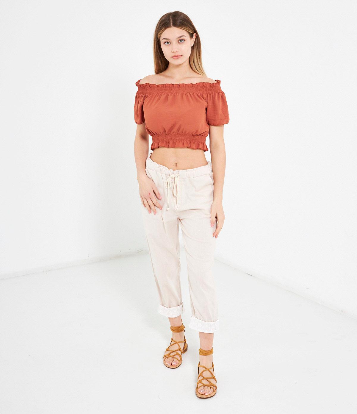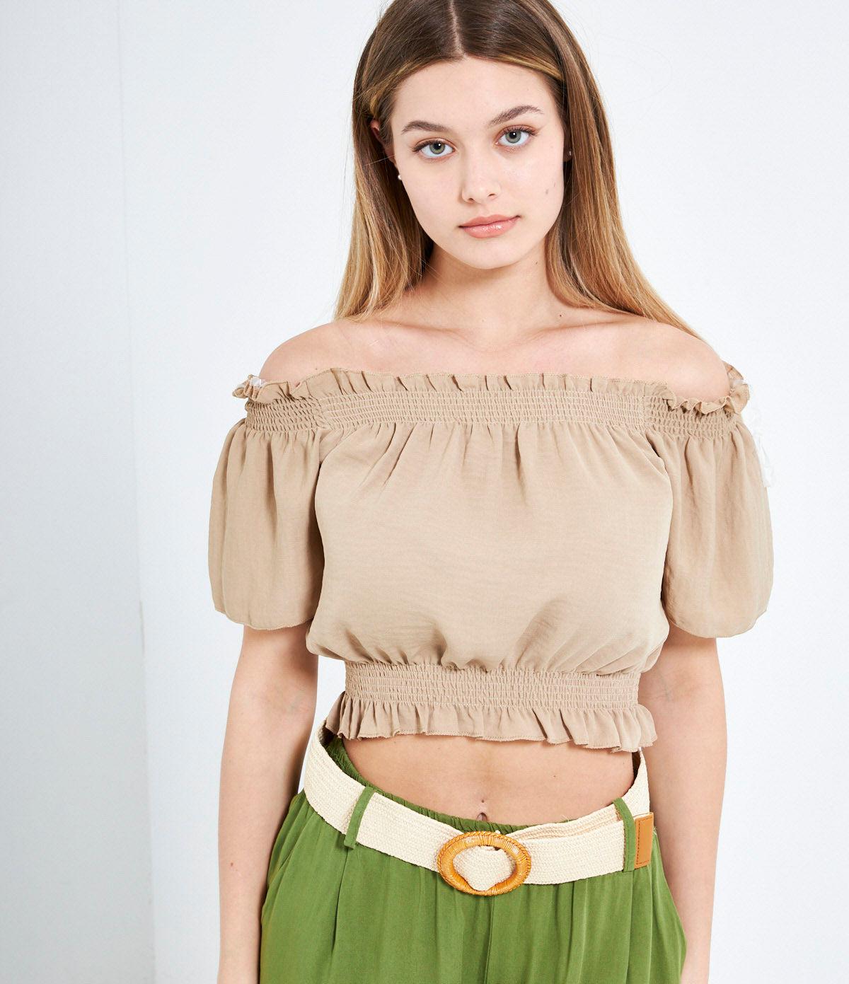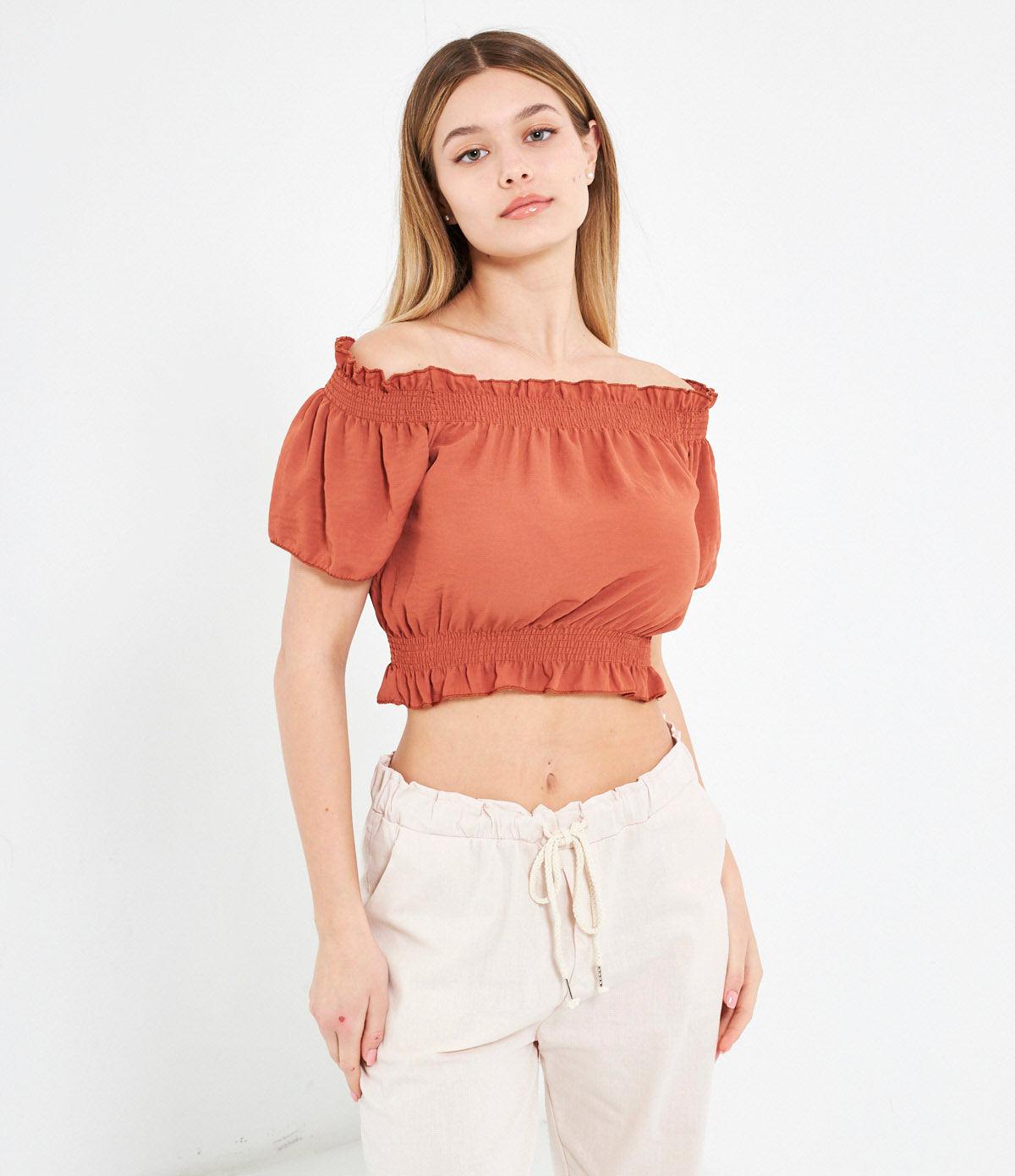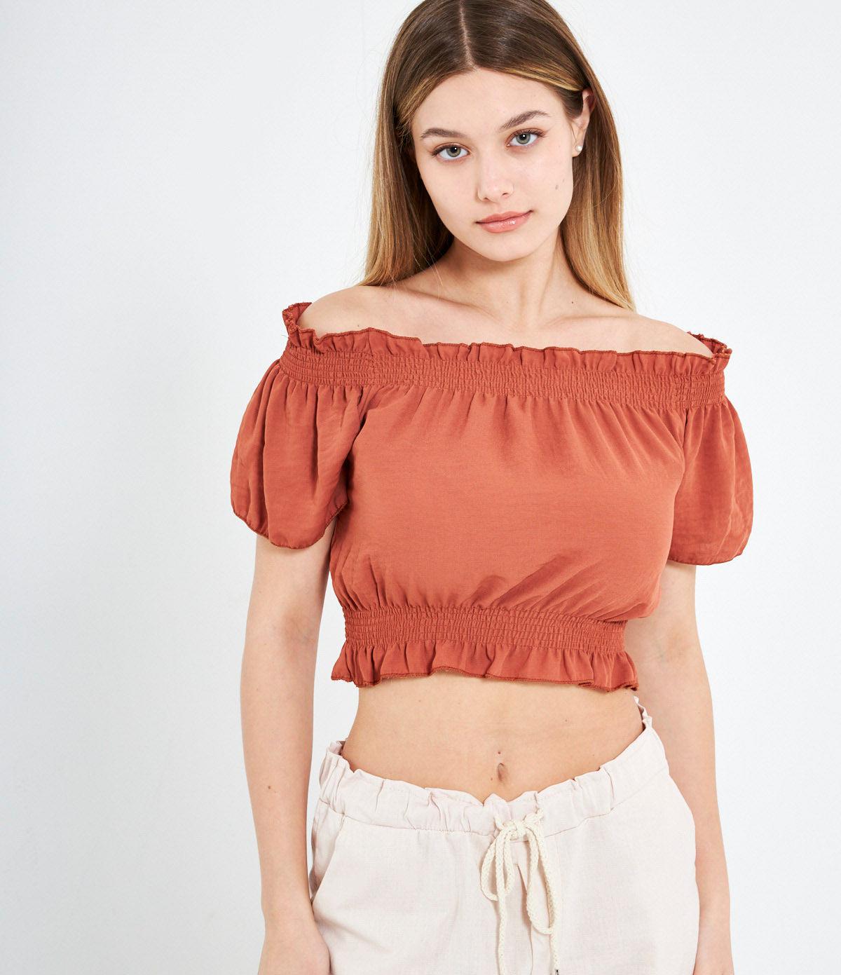 Casacca crop con spalle scoperte e punto smock con rouches.