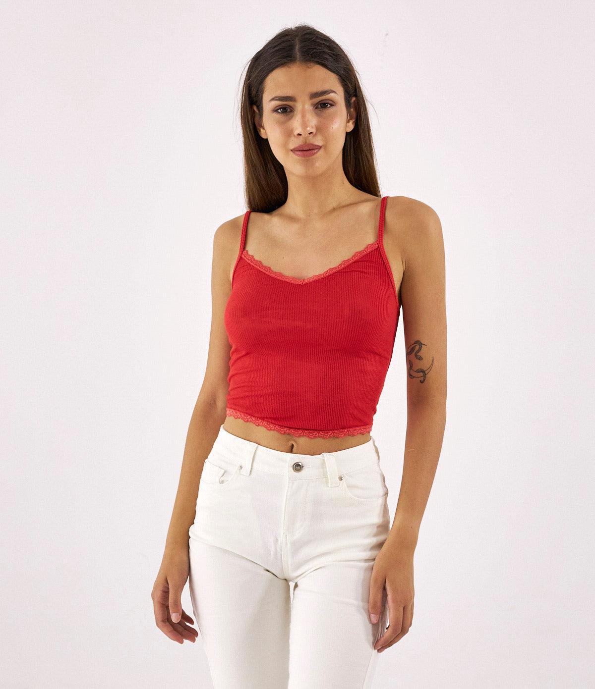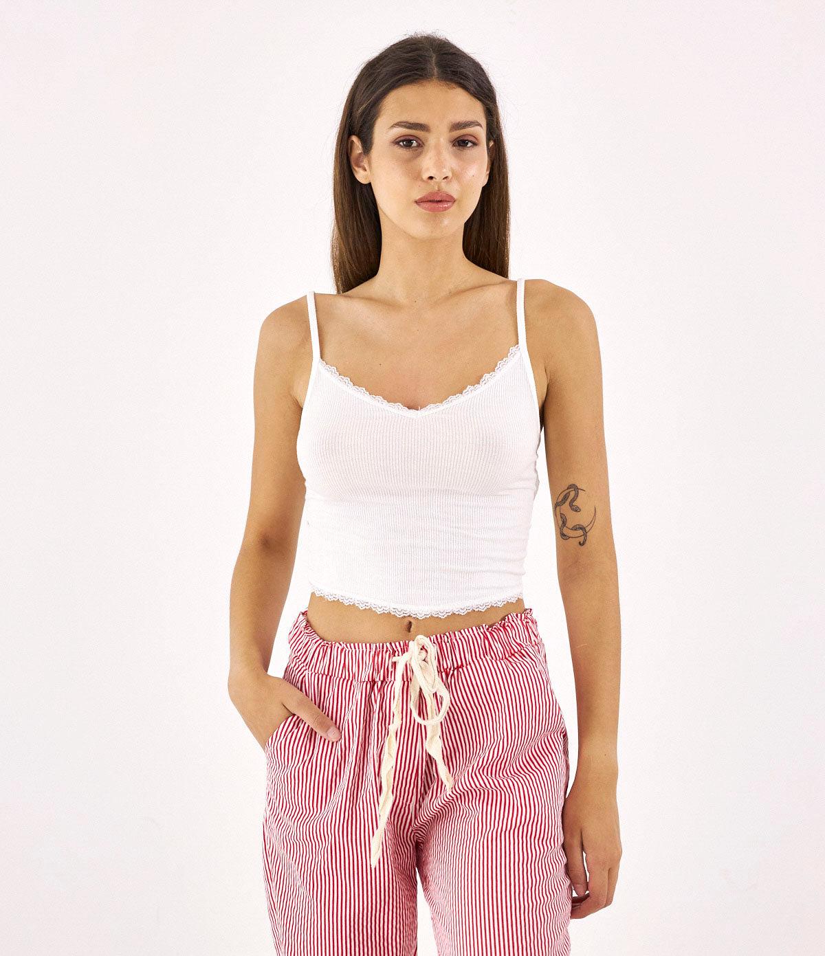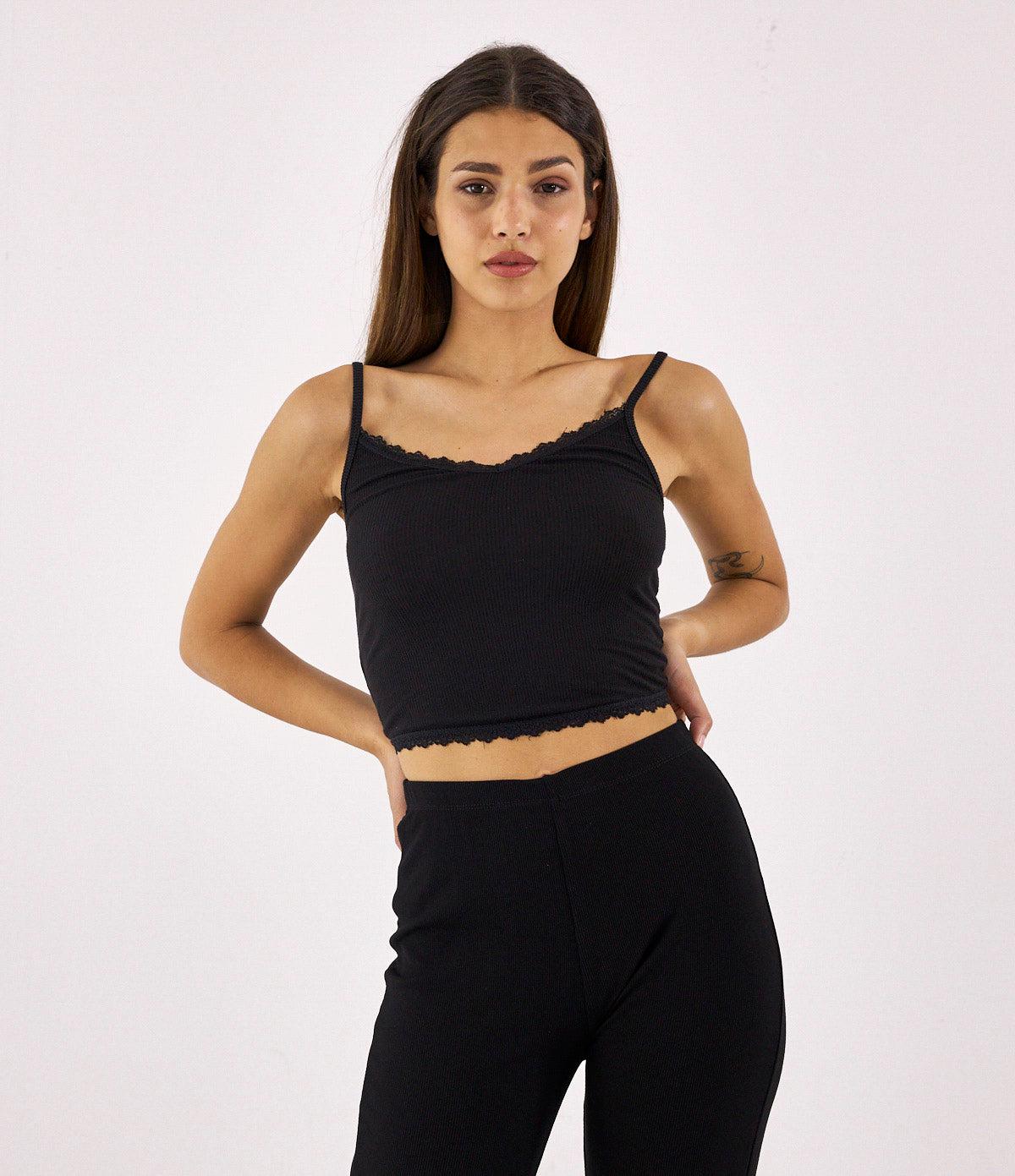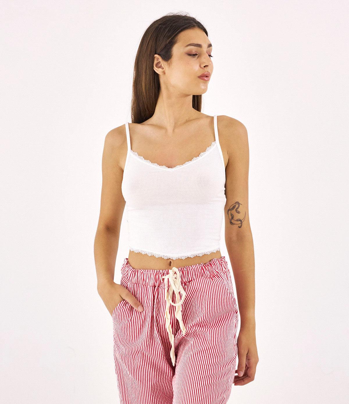 Crop top in tessuto a costine elastico, spalline sottili e bordi con dettagli in pizzo.