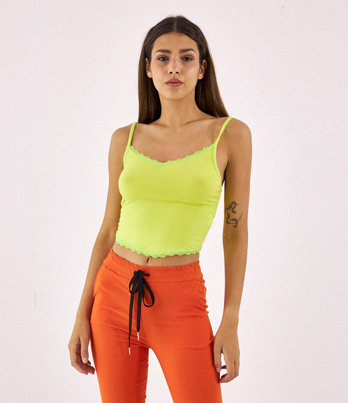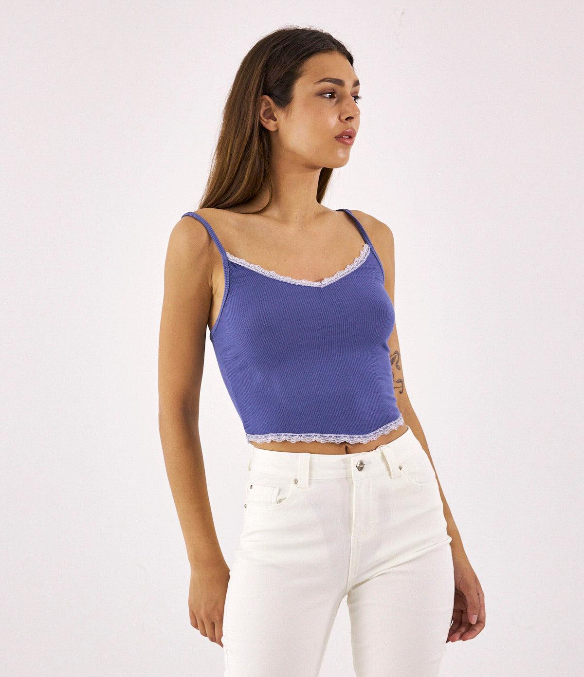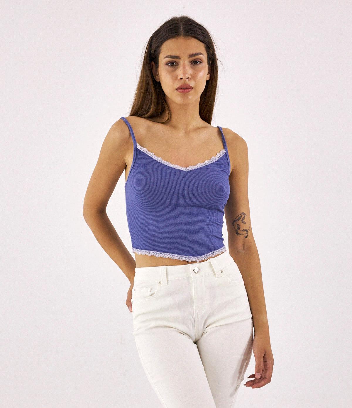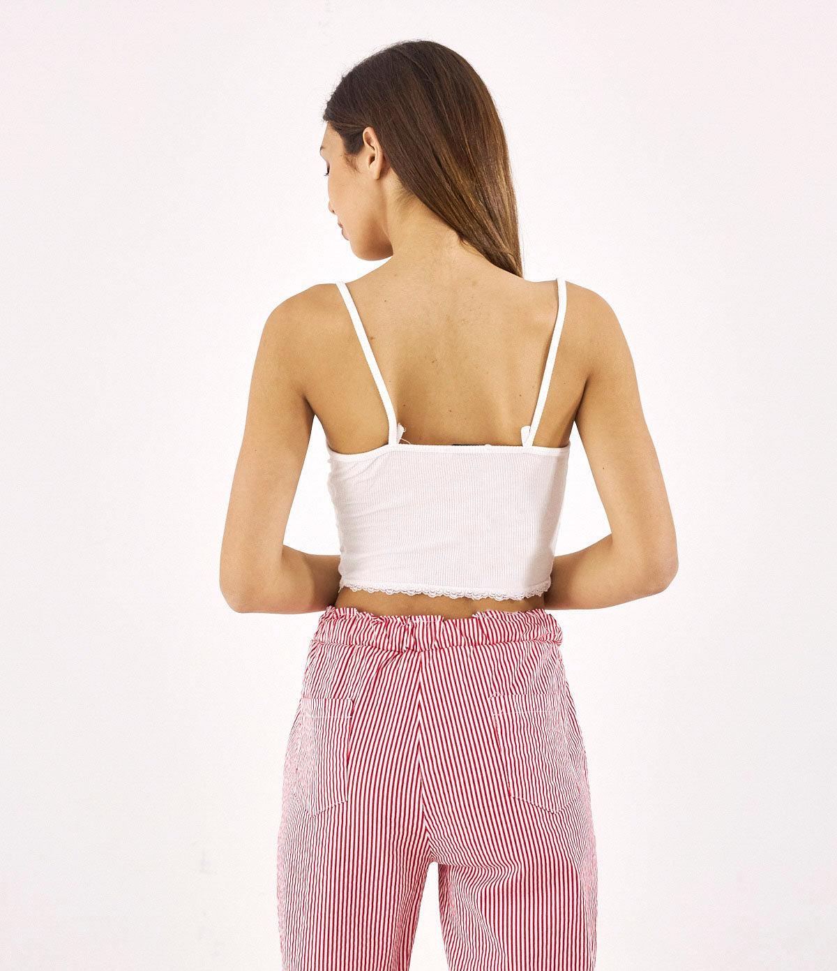 Crop top in tessuto a costine elastico, spalline sottili e bordi con dettagli in pizzo.