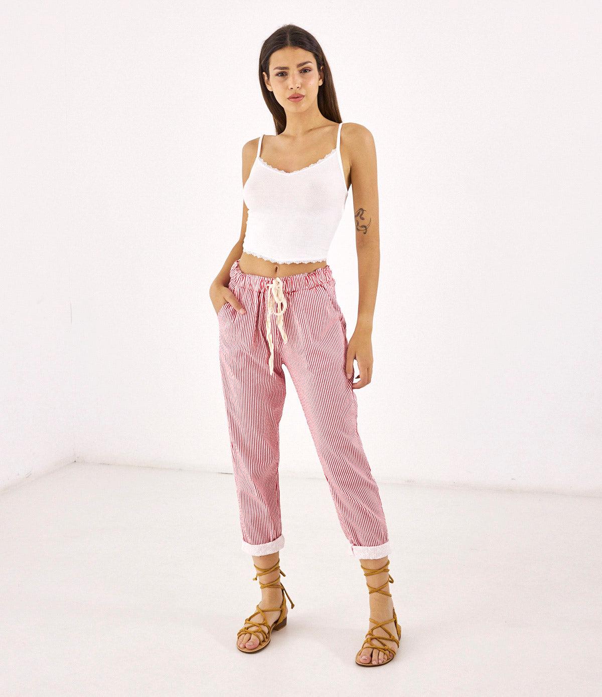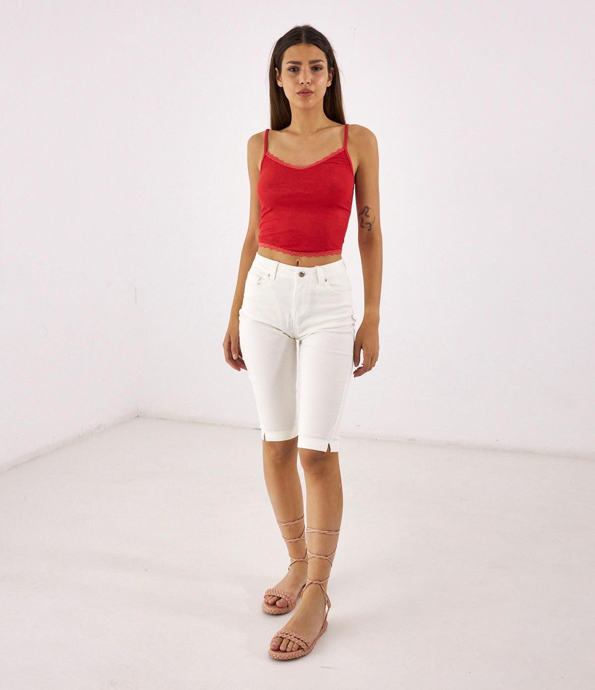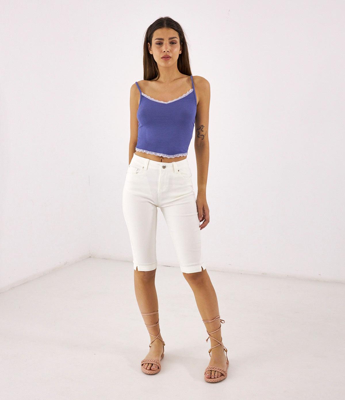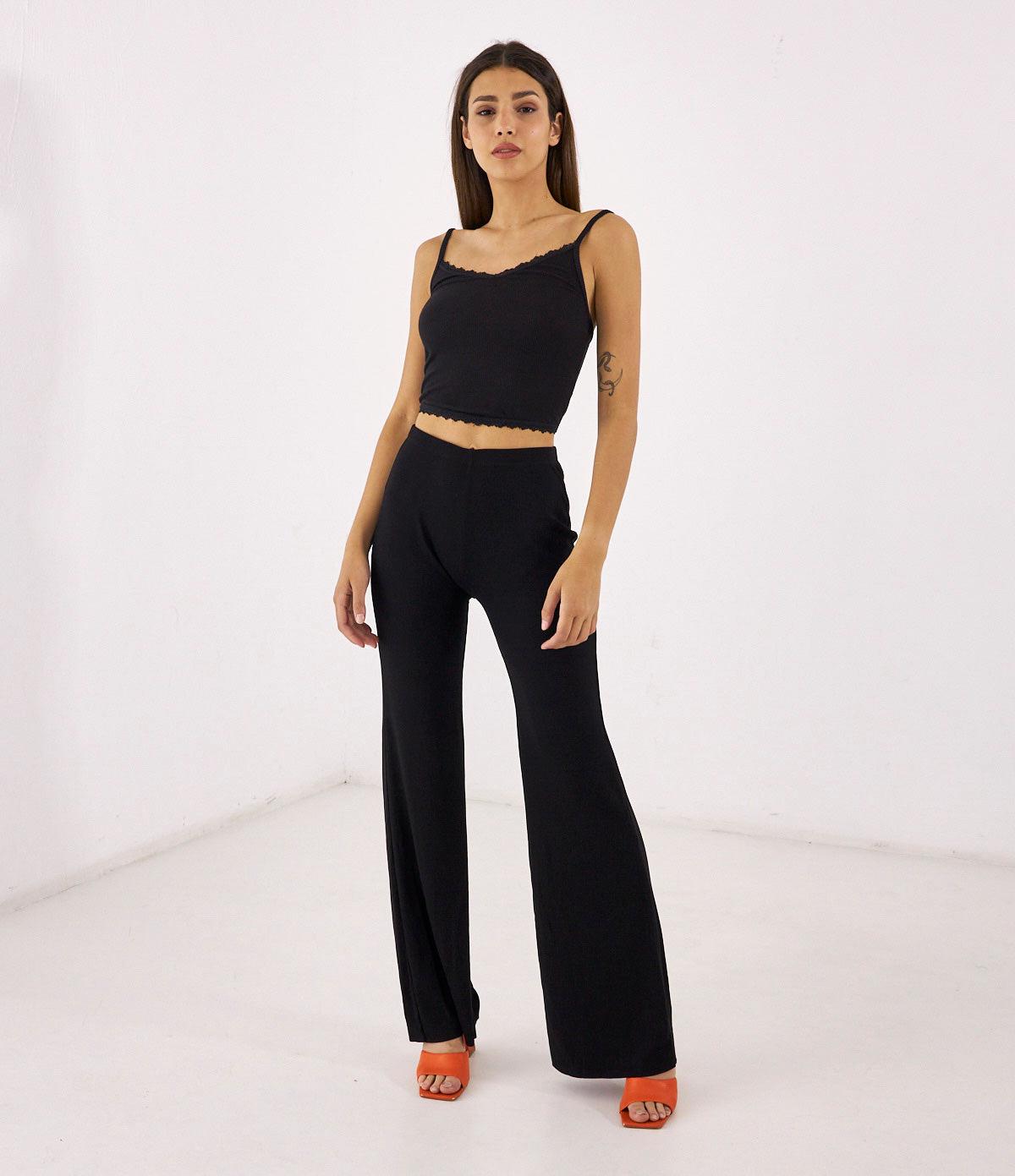 Crop top in tessuto a costine elastico, spalline sottili e bordi con dettagli in pizzo.