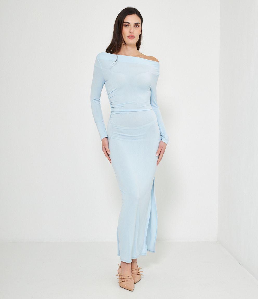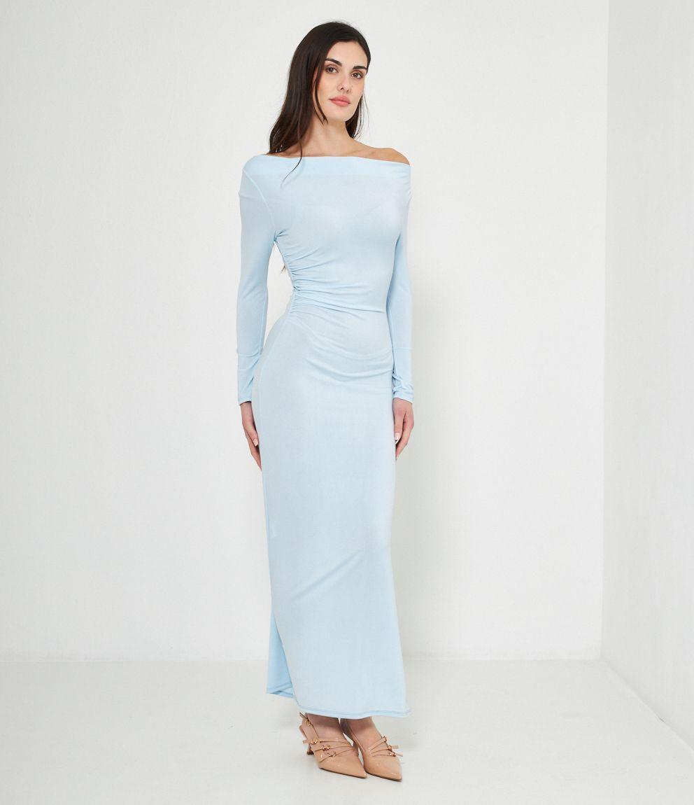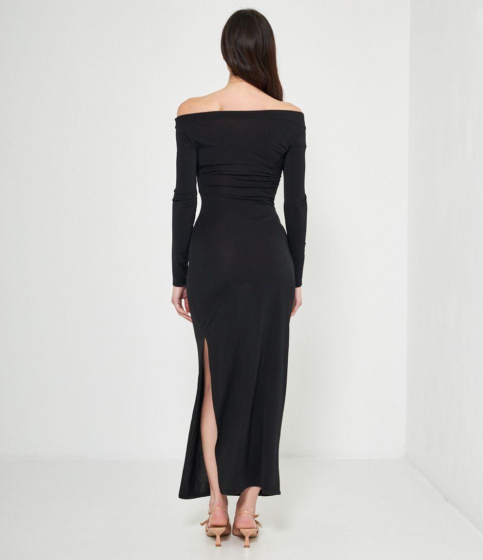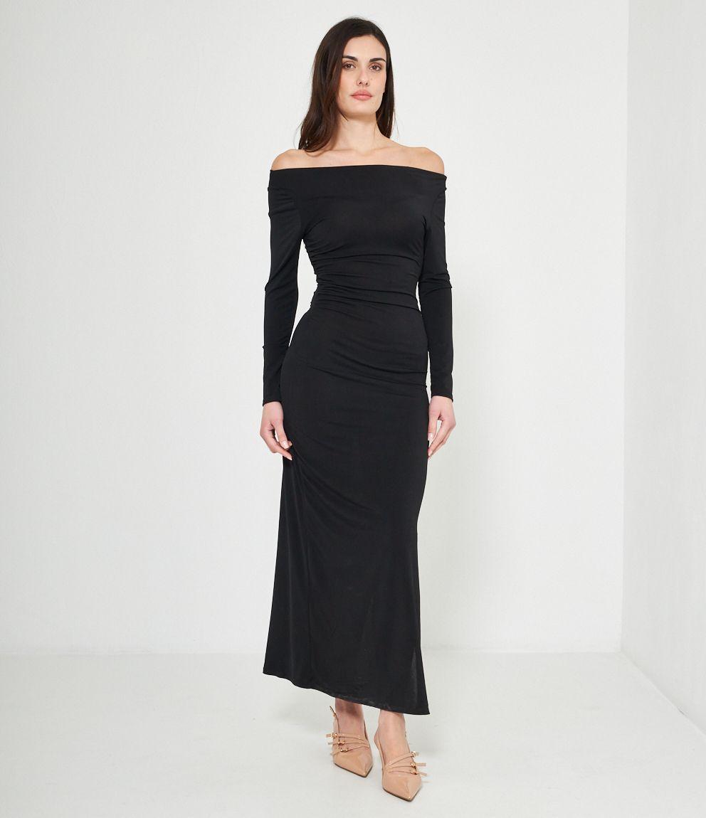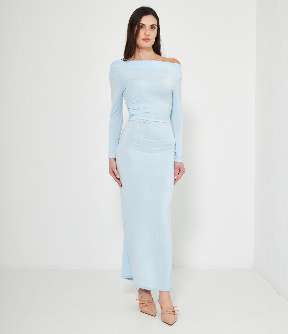 Abito modello maxi con spalle scoperte, tessuto elastico e spacco sul retro.