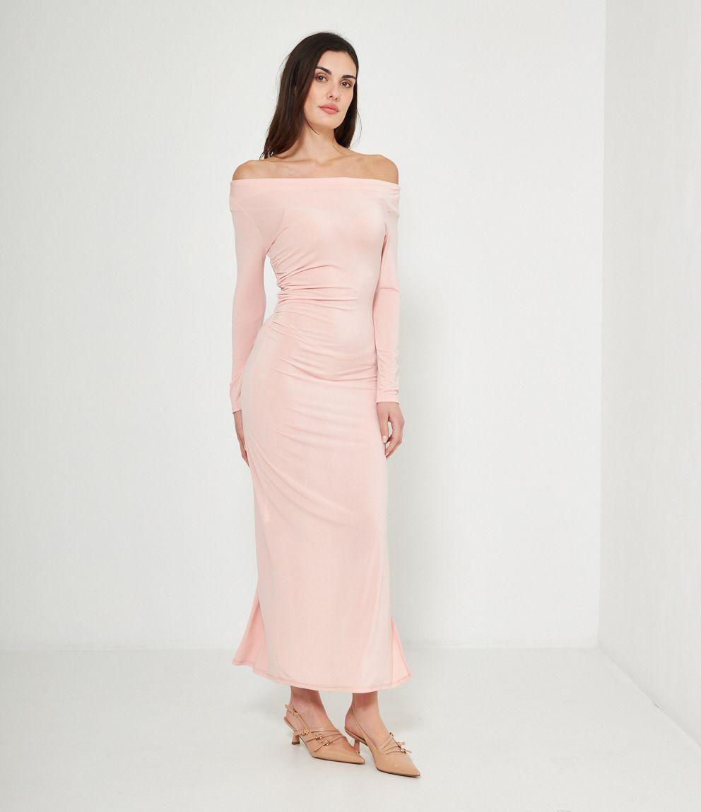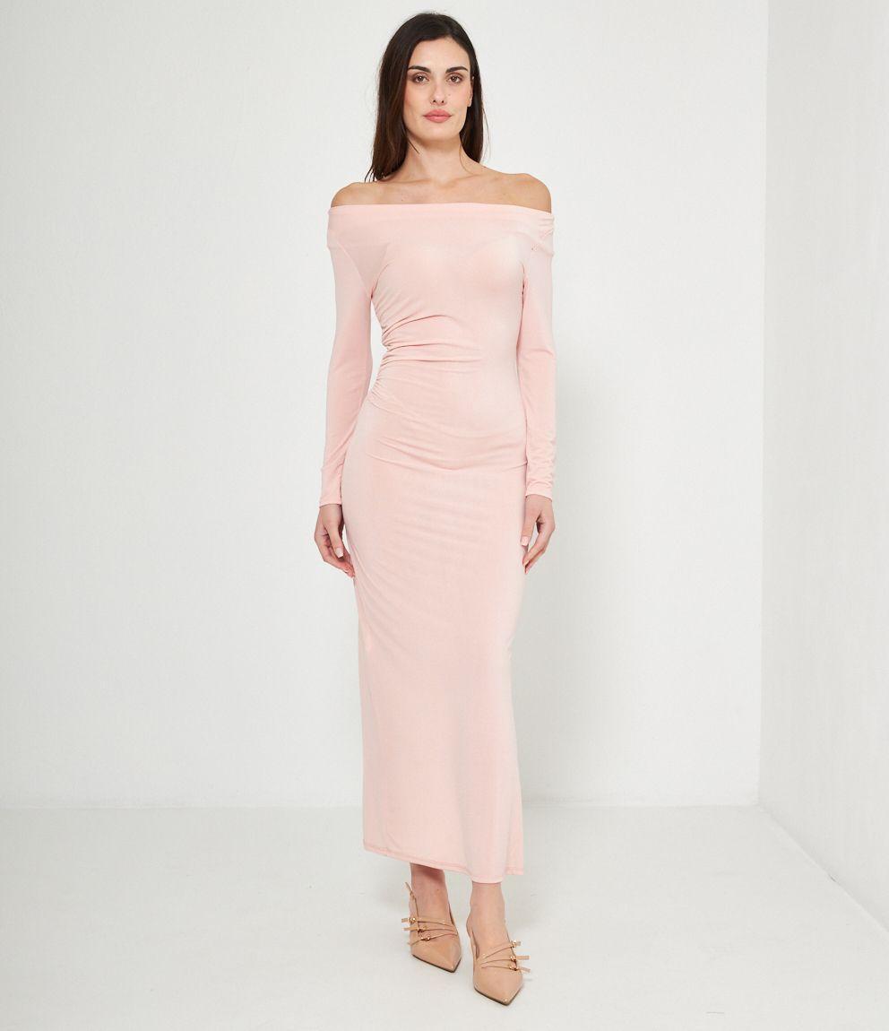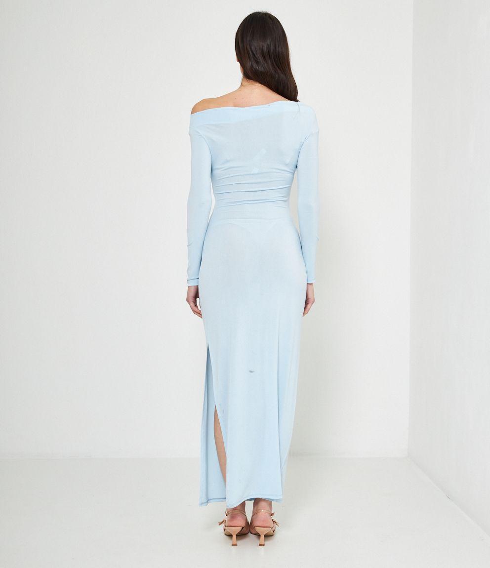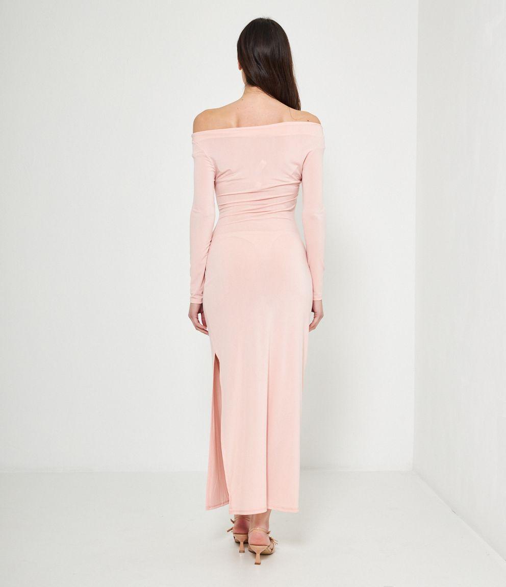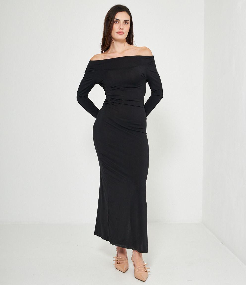 Abito modello maxi con spalle scoperte, tessuto elastico e spacco sul retro.