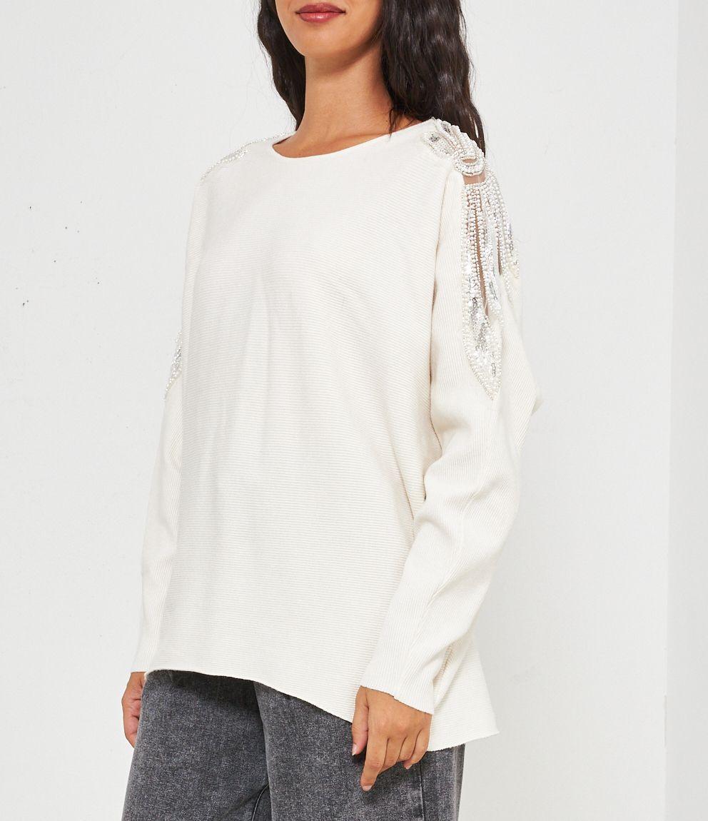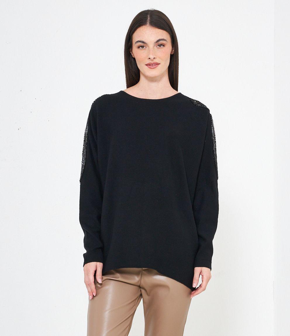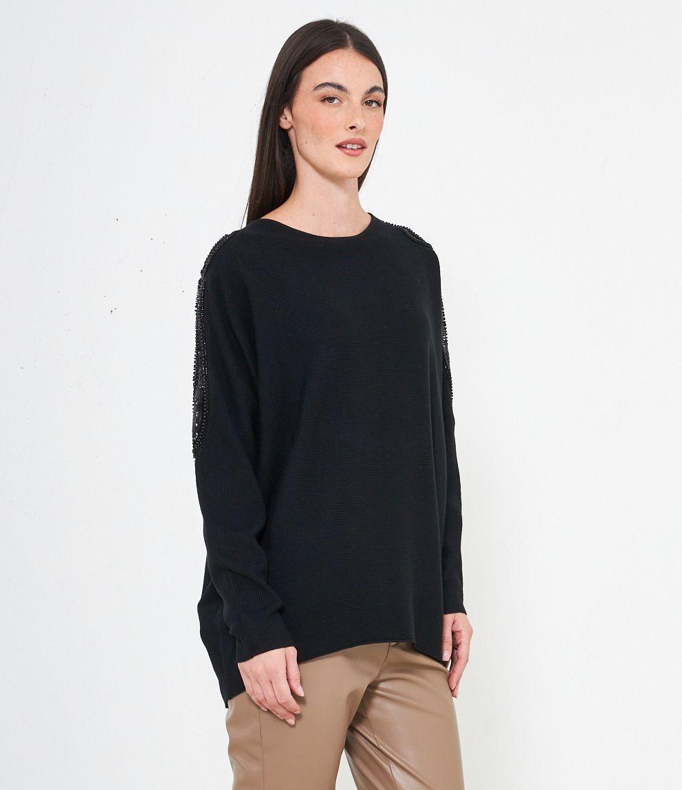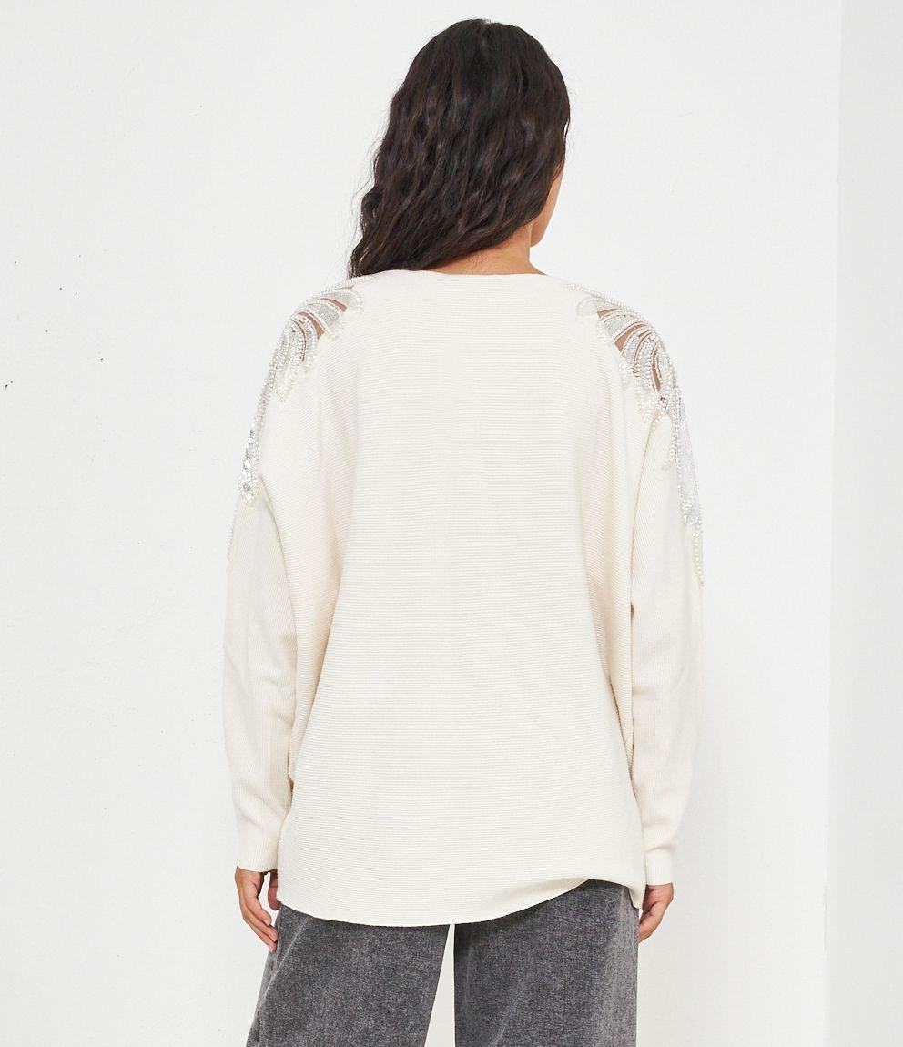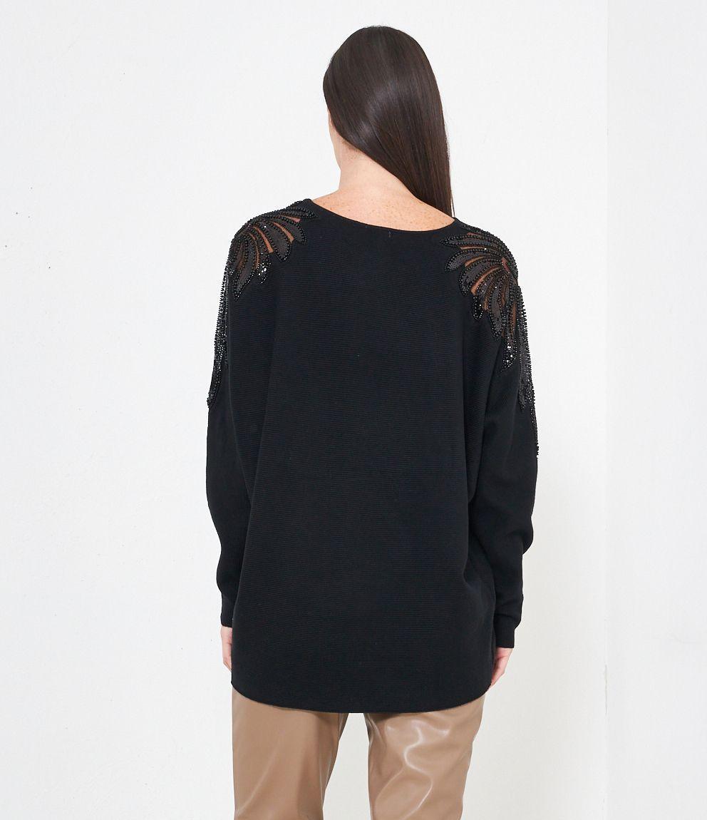 Maglia modello over, scollo tondo e palle con trasparenze e dettagli perle e paillettes.