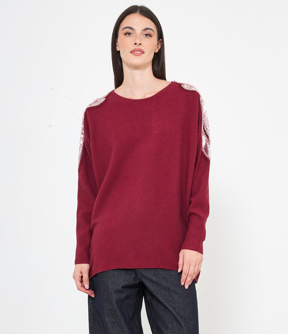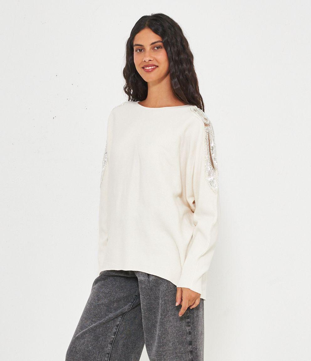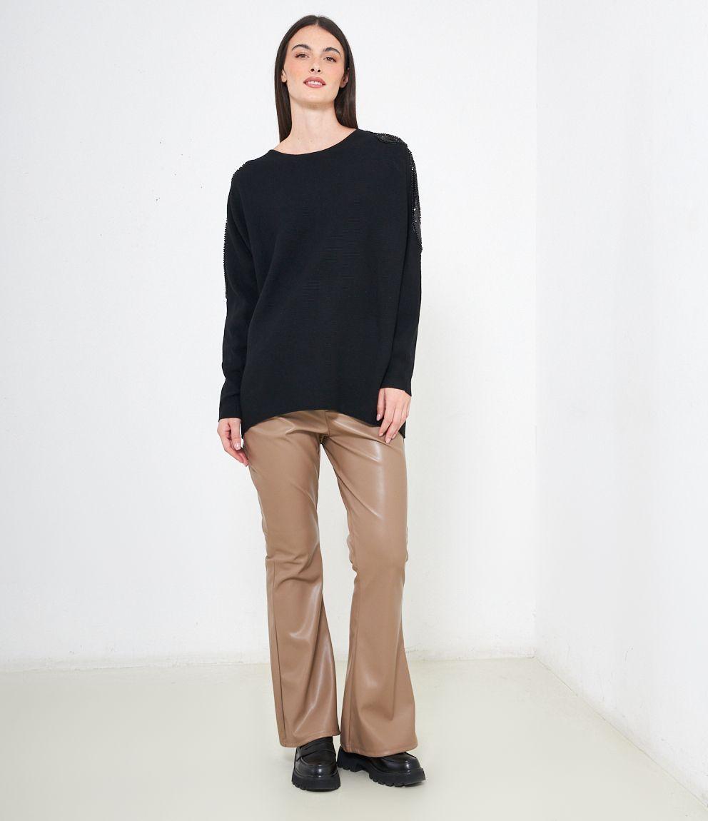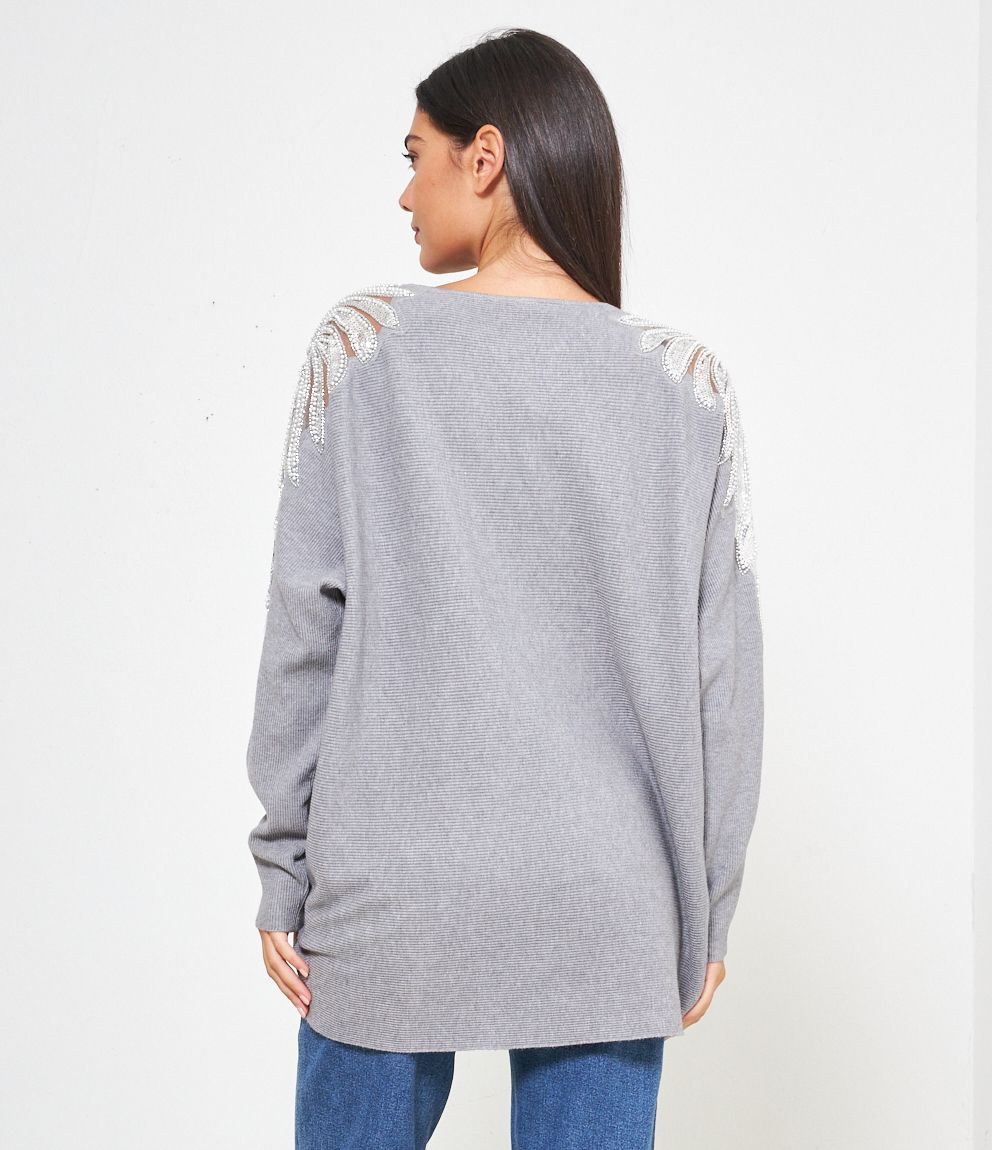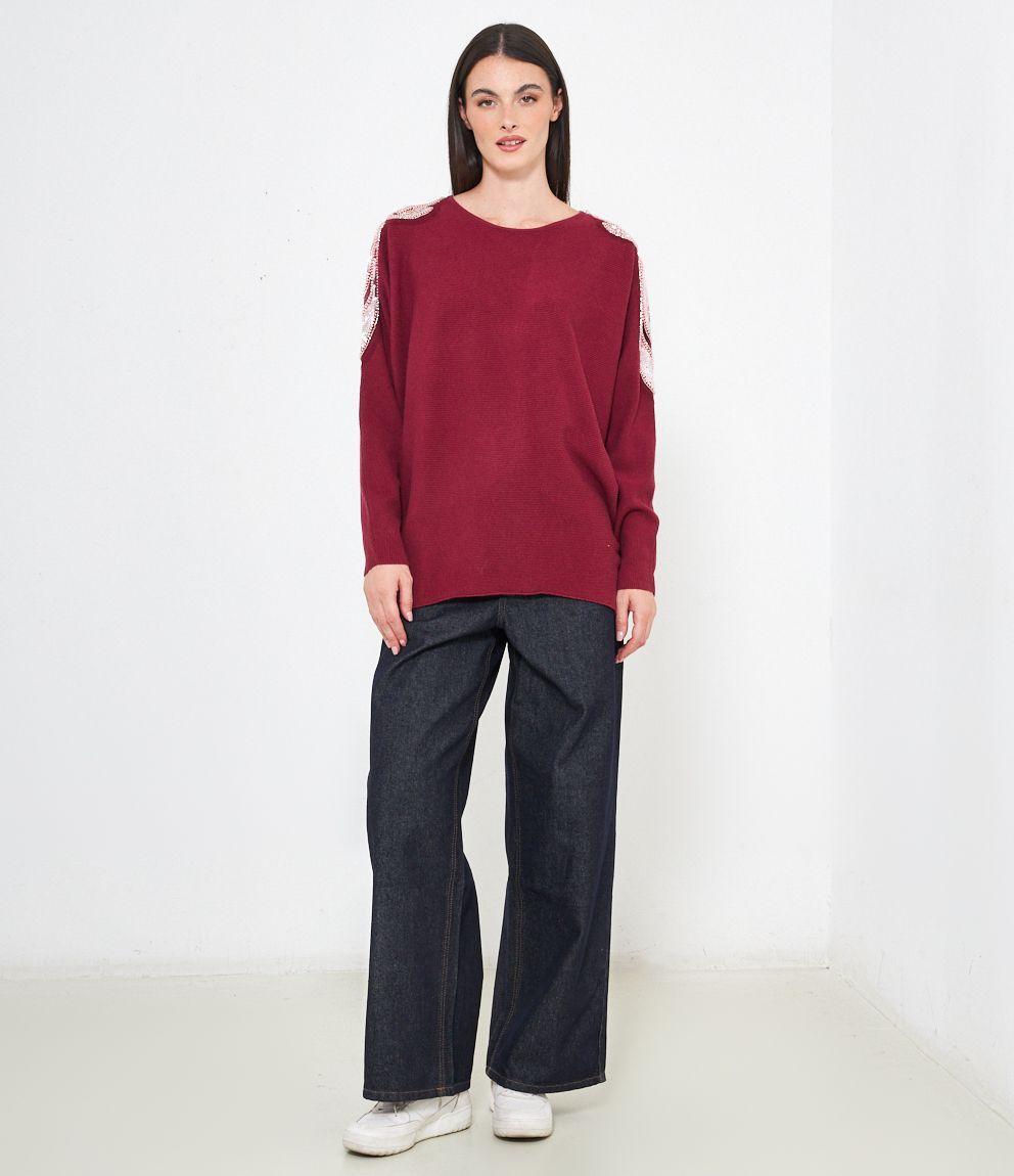 Maglia modello over, scollo tondo e palle con trasparenze e dettagli perle e paillettes.