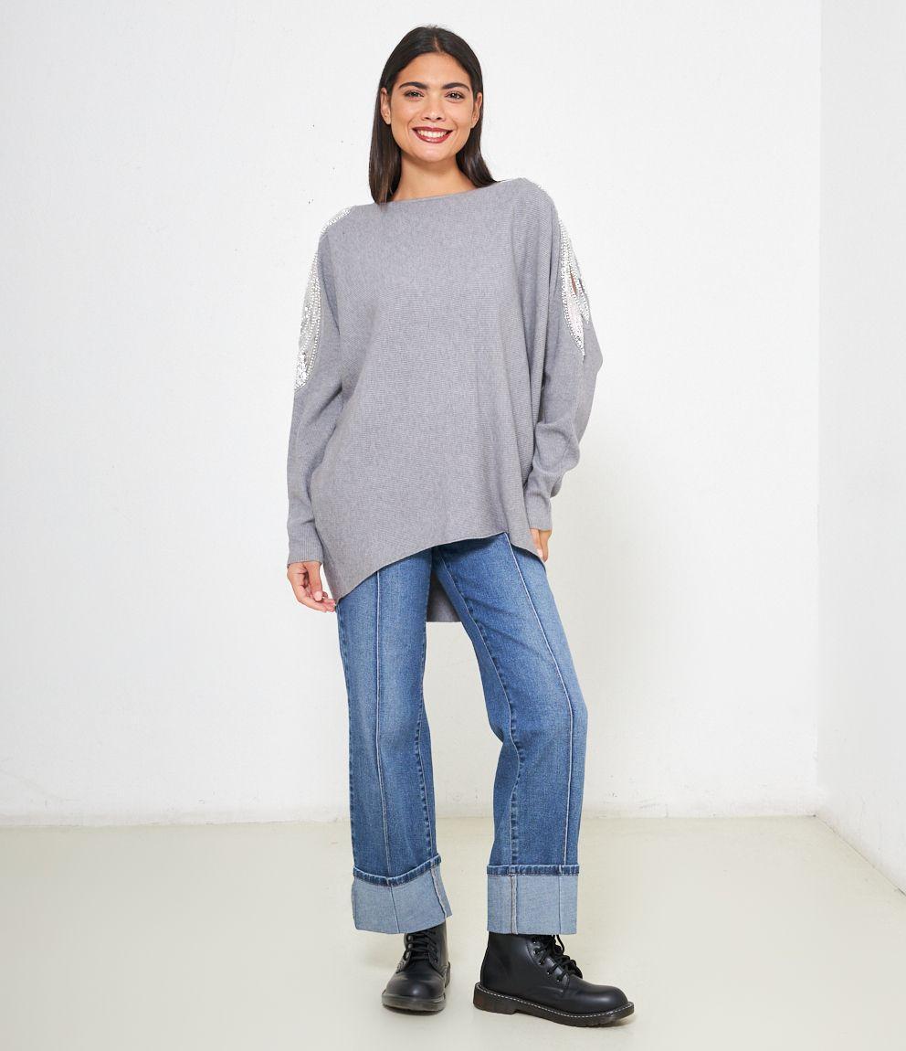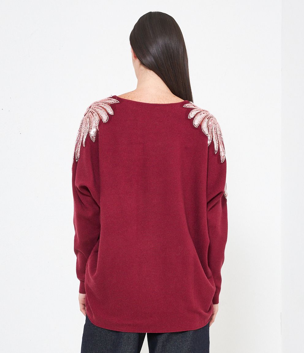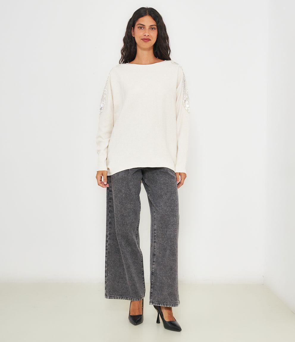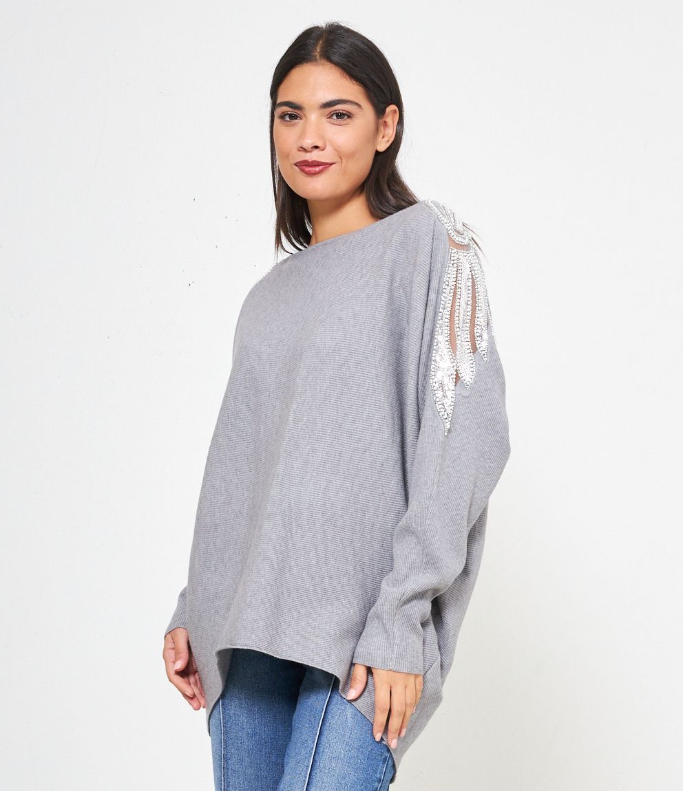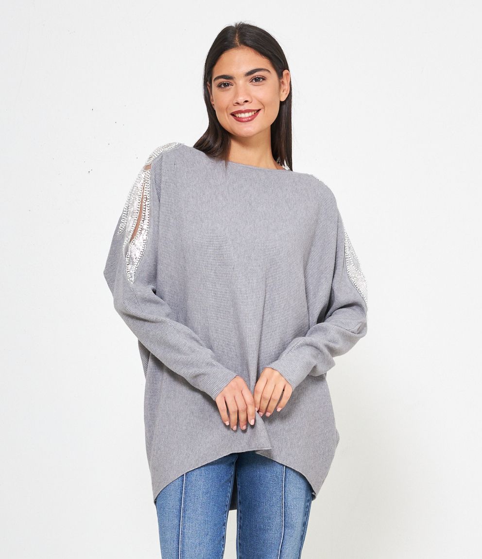 Maglia modello over, scollo tondo e palle con trasparenze e dettagli perle e paillettes.