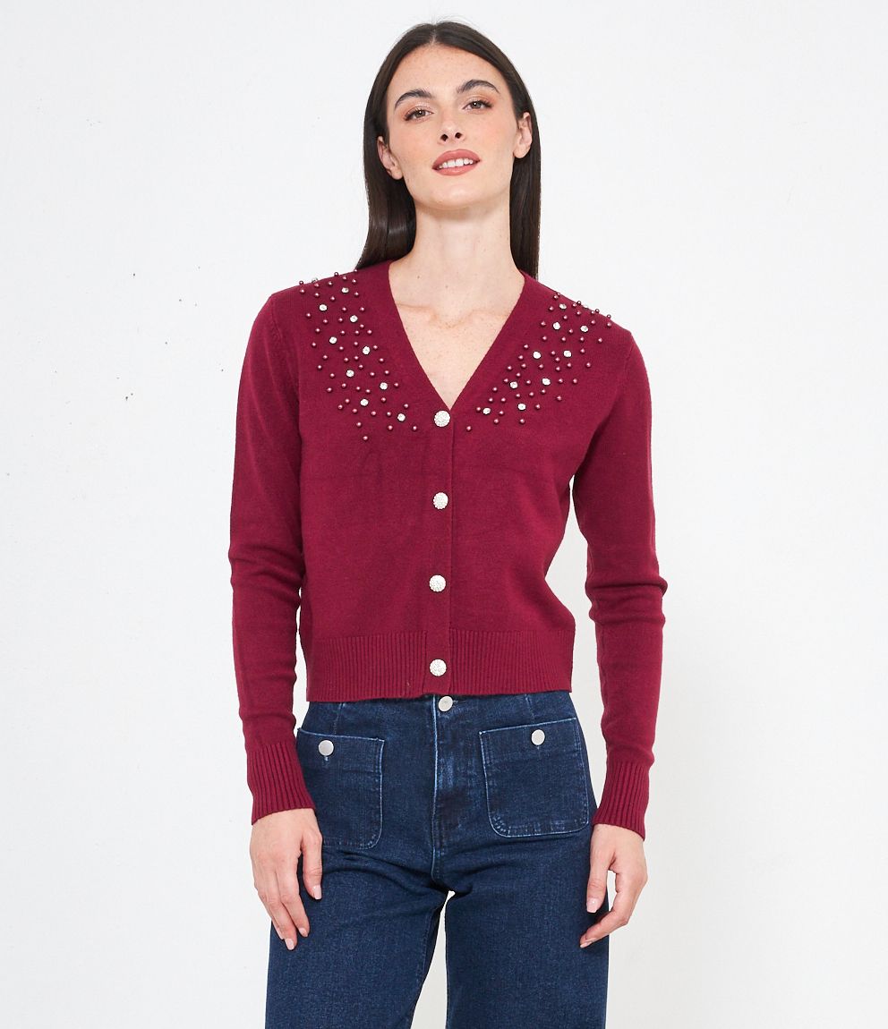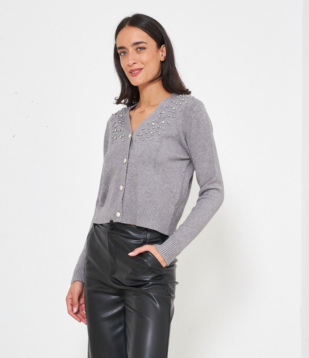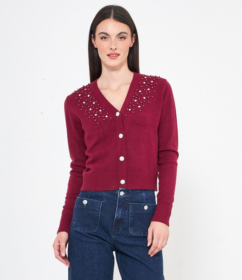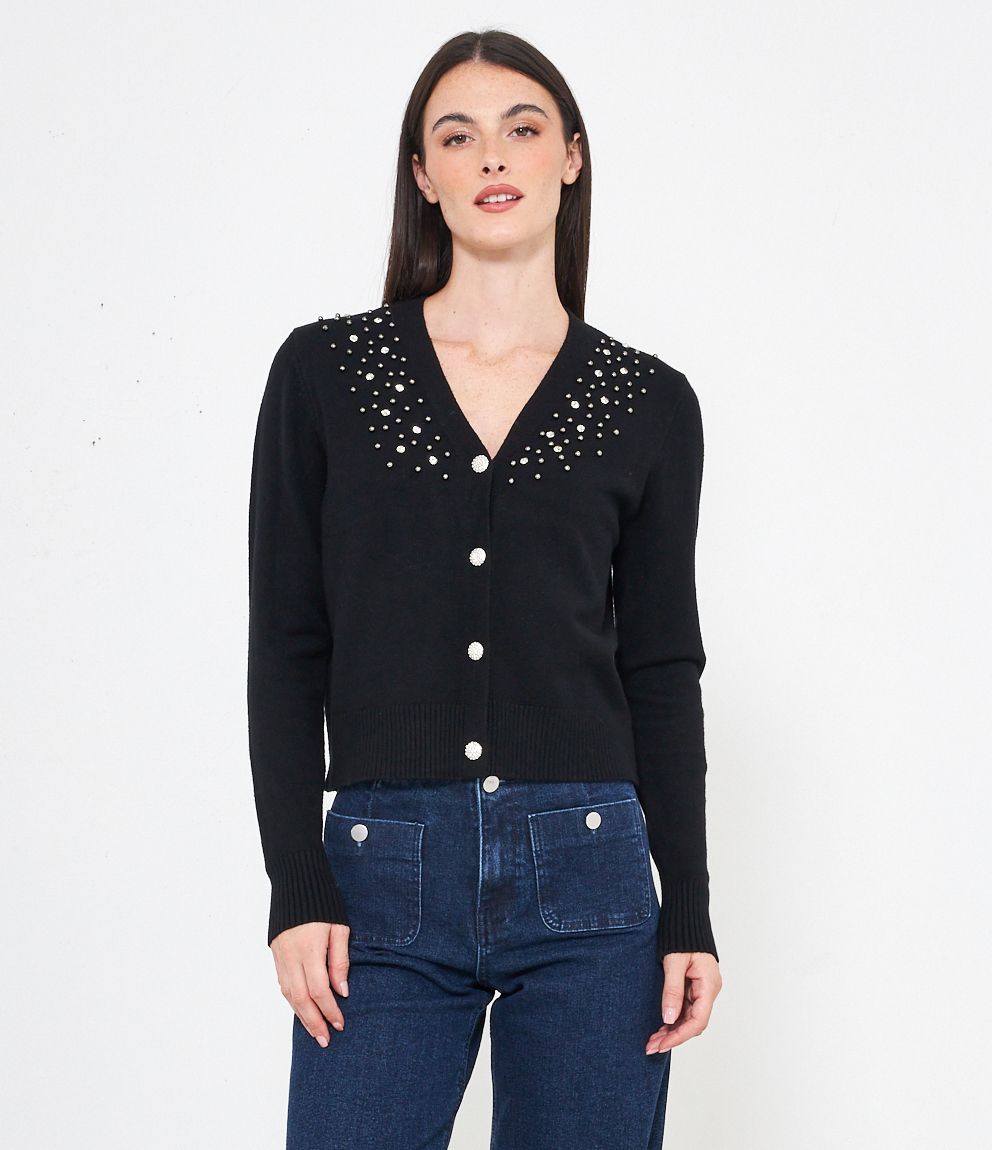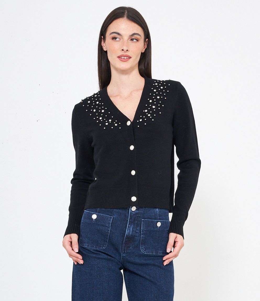 Cardigan con scollo a V, bottoni gioiello. Strass e perle applicate.