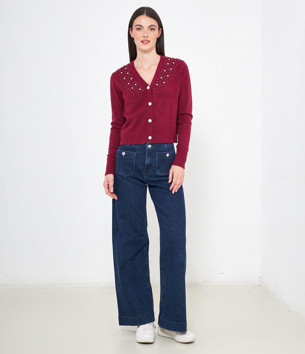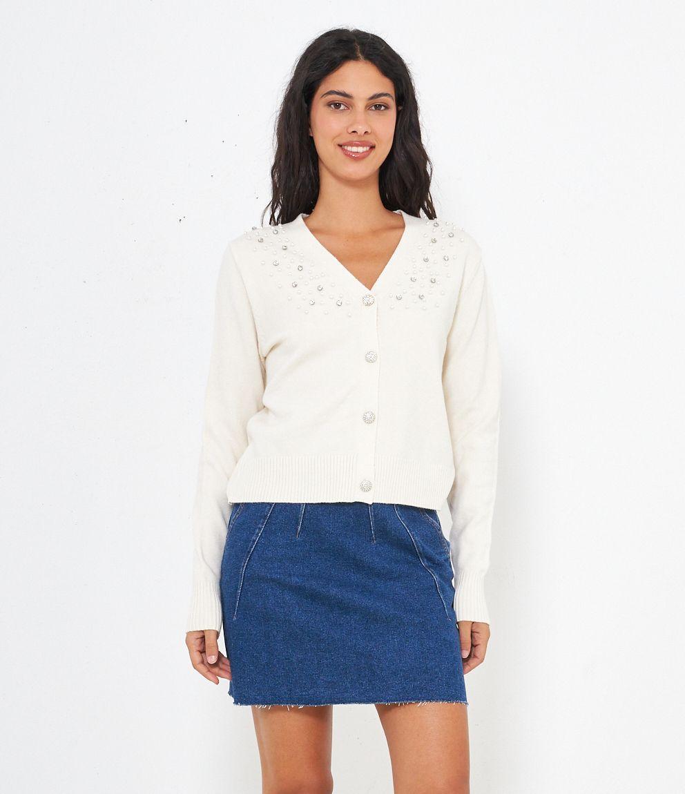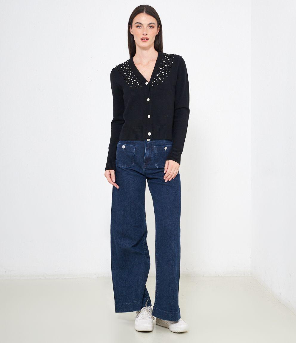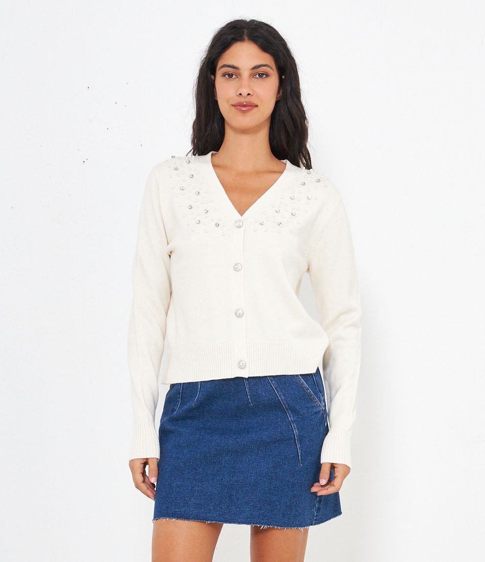 Cardigan con scollo a V, bottoni gioiello. Strass e perle applicate.
